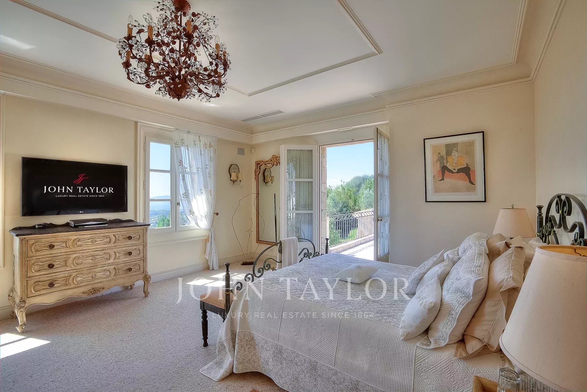 Eines verfügt über ein Badezimmer en suite, während das andere sich zu einer privaten Tropezterrasse hin öffnet. Die begehbaren Kleiderschränke „Monsieur“ und „Madame“ sowie ein Badezimmer aus rosafarbenem Marmor mit Jacuzzi und Dusche bieten ultimativen Luxus.