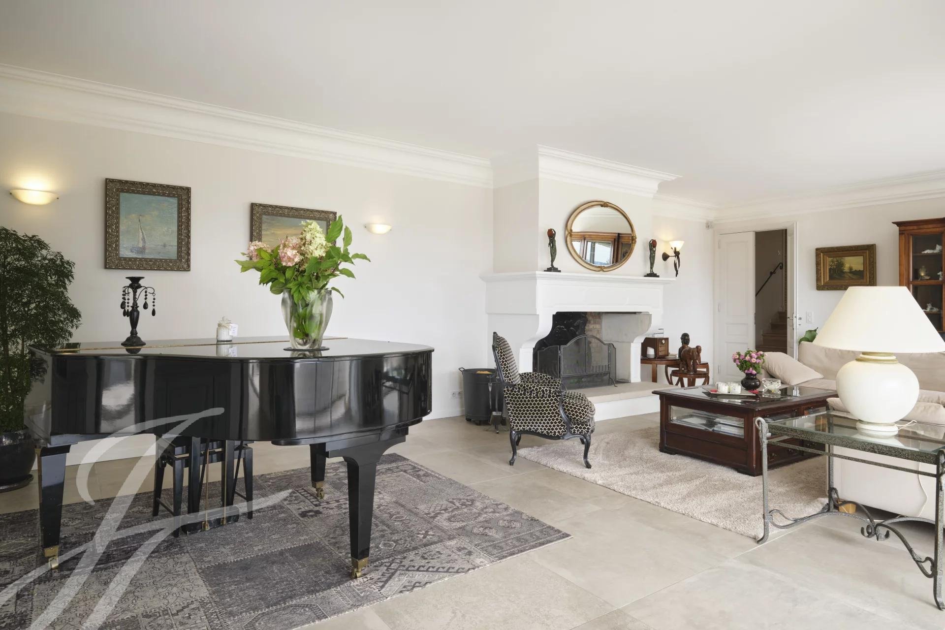 Das große Wohnzimmer mit einem schönen Kamin und großen Schiebetüren öffnet sich direkt auf eine prächtige überdachte Terrasse.
