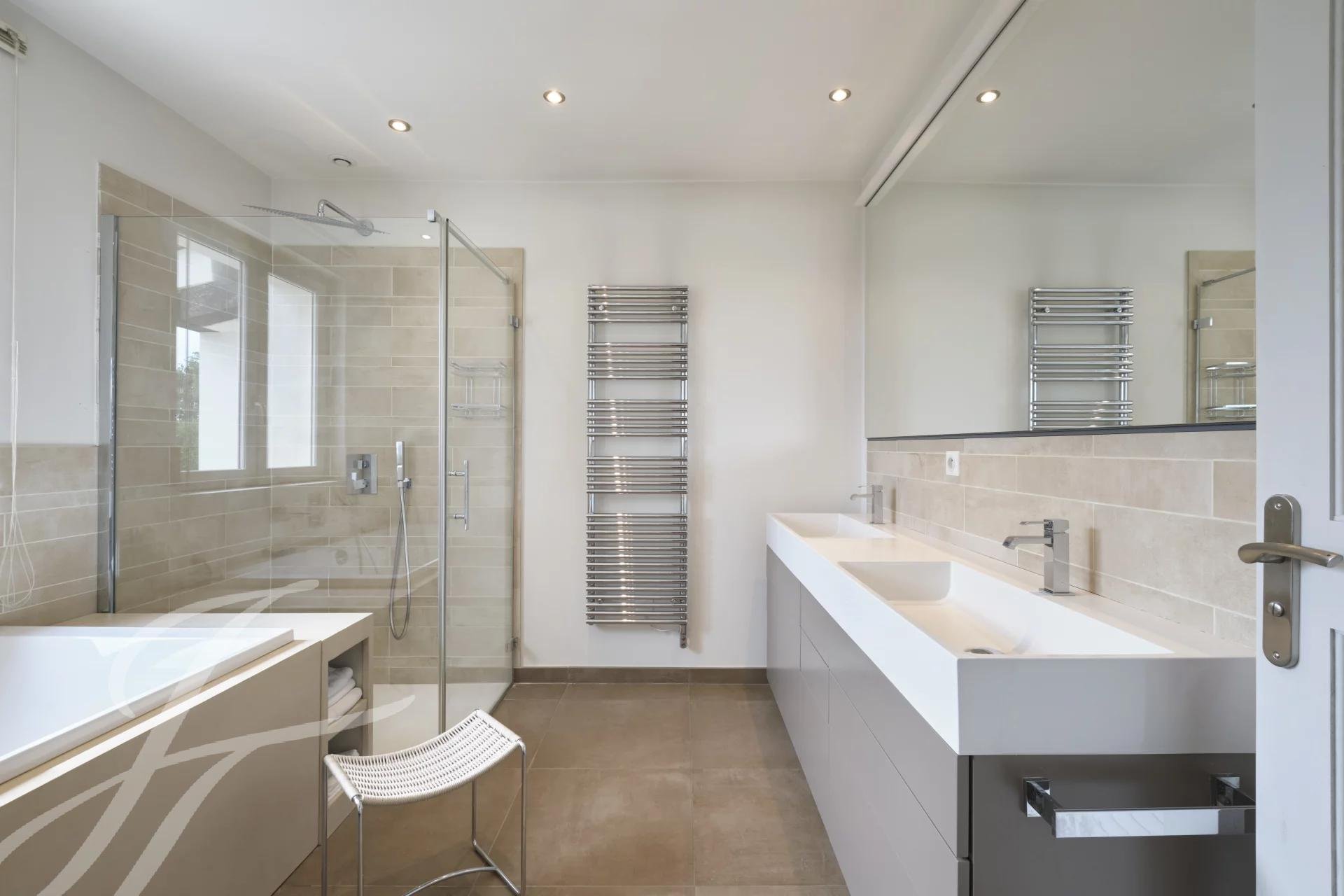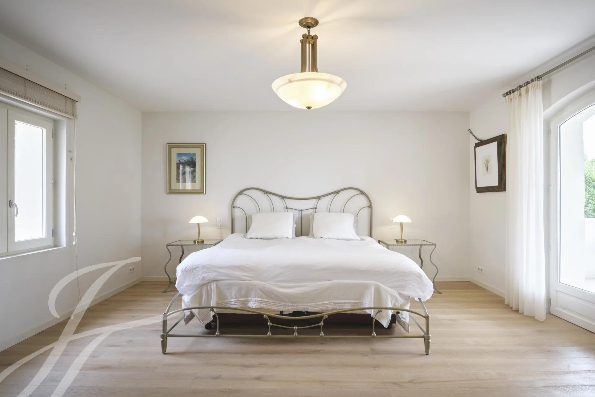 Ein paar Stufen führen hinauf zur Master-Suite mit eigenem Bad, Ankleidezimmer und einer schönen privaten Terrasse mit atemberaubendem Blick auf die Bucht von Mandelieu und das charmante Dorf Châteauneuf-Grasse.