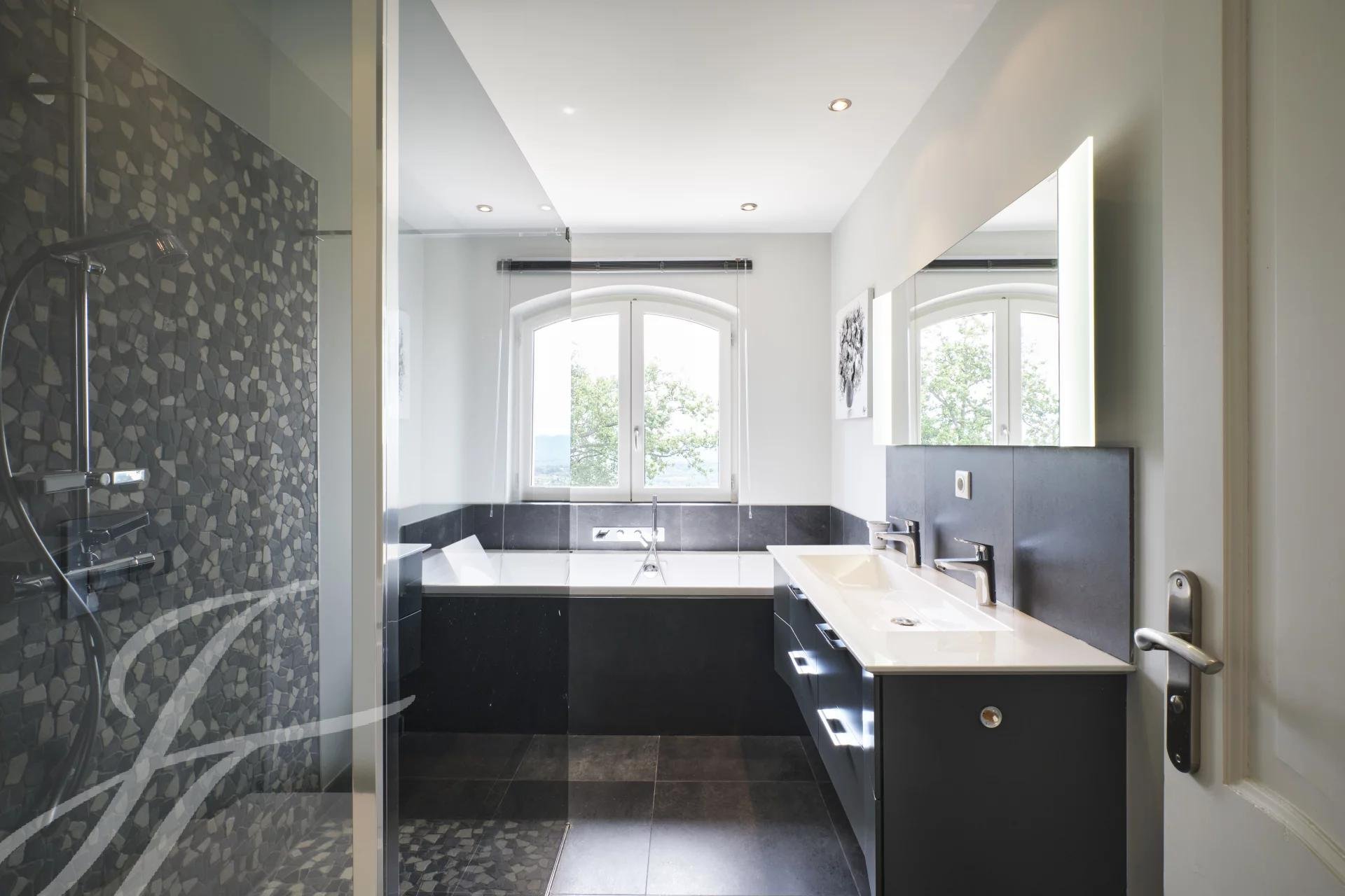 Eine schöne Treppe führt in den ersten Stock, wo sich ein offenes Arbeitszimmer und eine Sonnenterrasse befinden, von der aus man die Landschaft dieser reizvollen Region in aller Ruhe genießen kann. Zwei schöne Schlafzimmer, eines davon mit romantischem Balkon, teilen sich ein Badezimmer und könnten dank eines separaten Zugangs auch in ein unabhängiges Appartement umgewandelt werden.