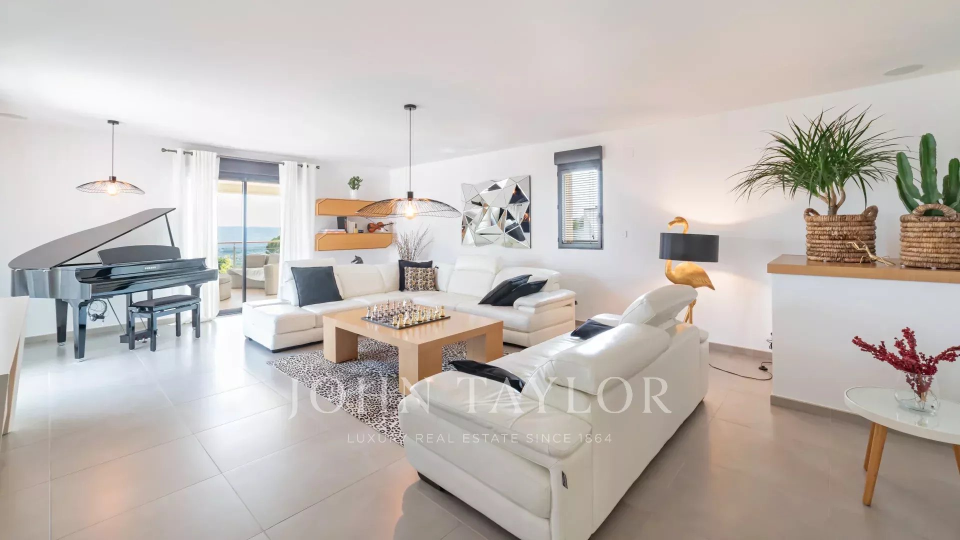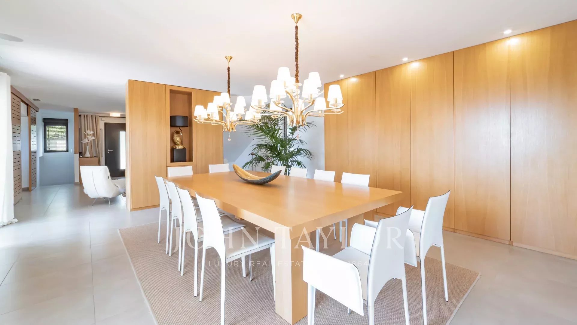 Auf einem Grundstück von ca. 1700 m² mit herrlichem Meerblick, schöne neue zeitgenössische Villa von ca. 280 m² Wohnfläche auf 3 Ebenen mit Stockwerk: Eingangshalle mit WC, großes möbliertes Wohnzimmer, großes Esszimmer, angrenzende voll ausgestattete Küche, die auf eine große Terrasse mit Pool und Jacuzzi führt. Pool House - Separates Studio mit Toilette und Badezimmer sowie Außendusche und WC.