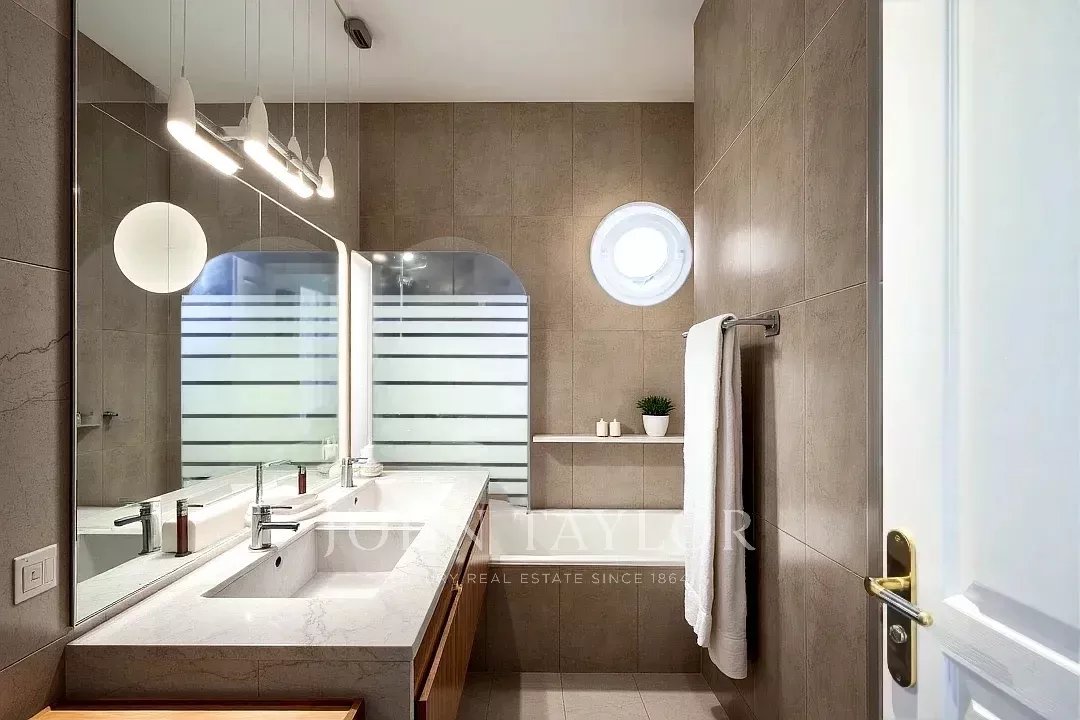 Das helle Innere bietet hohe Decken und umfasst ein großes Wohnzimmer/eine Einbauküche, eine Mastersuite mit Ankleide und Badezimmer, ein Schlafzimmer mit Mezzanin und Badezimmer (Möglichkeit eines Studios), eine große Spülküche, Waschküche und Zugang zur Garage. Fußbodenheizung.