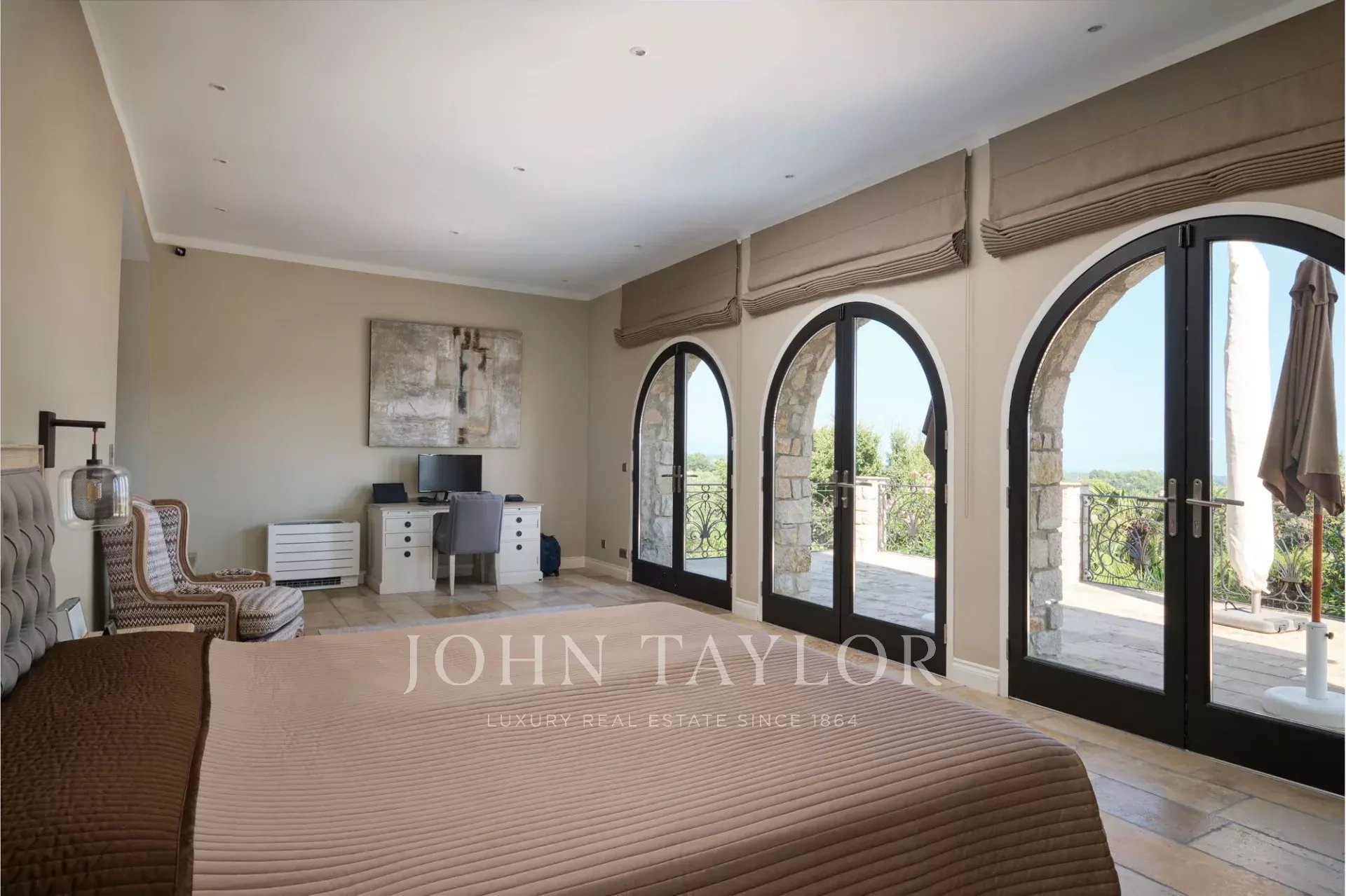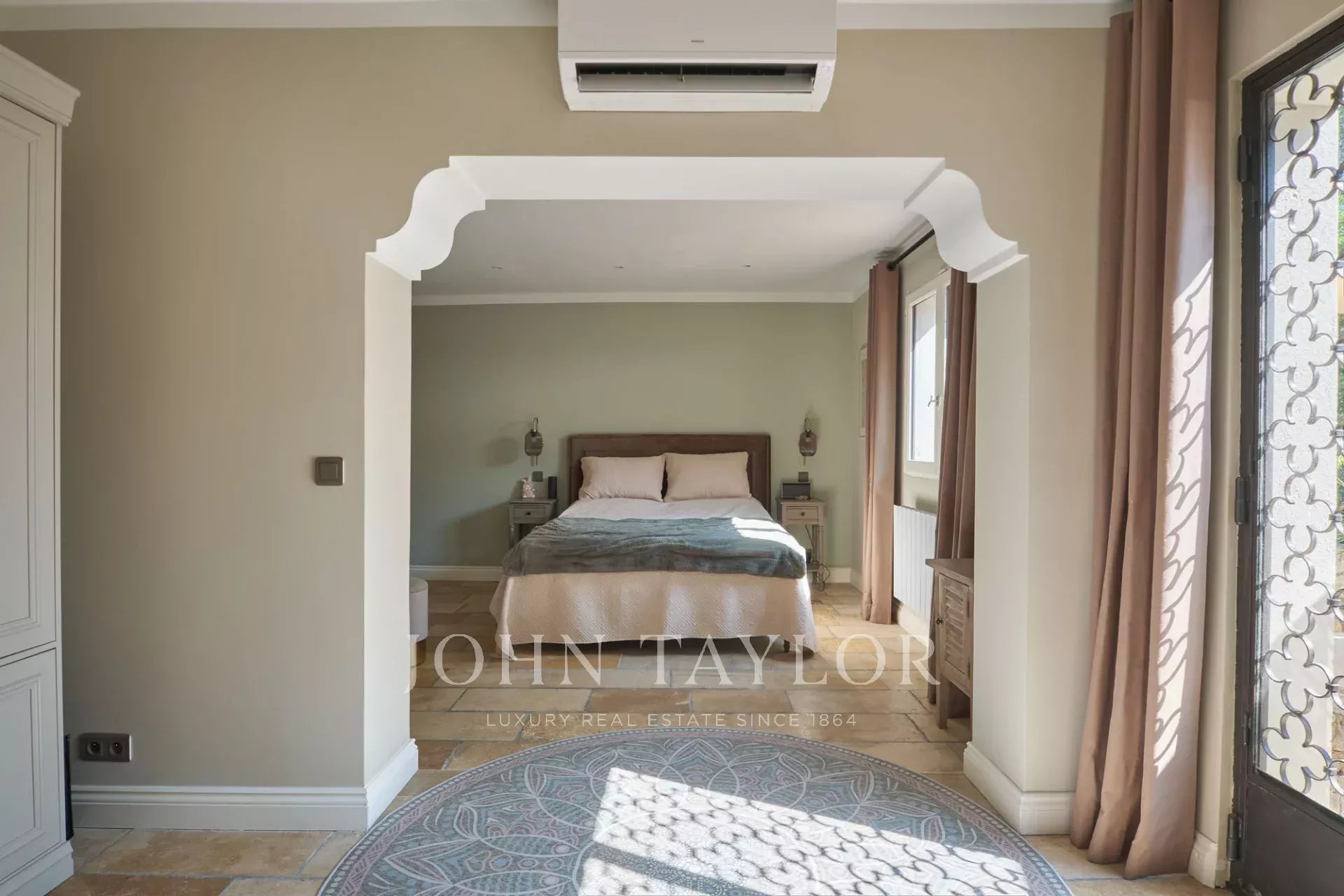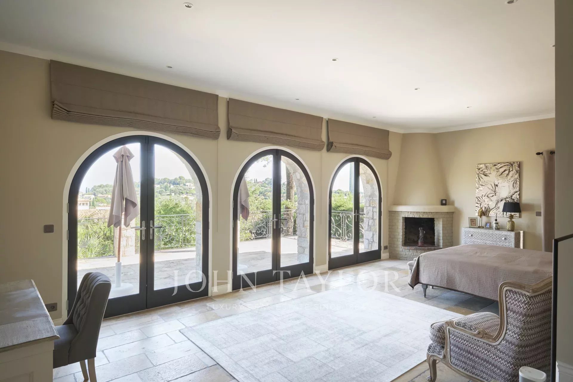 Die Villa beherbergt sechs große Schlafzimmer und sieben Badezimmer, darunter eine prächtige Suite mit Kamin, Ankleidezimmer und einer weitläufigen privaten Terrasse.