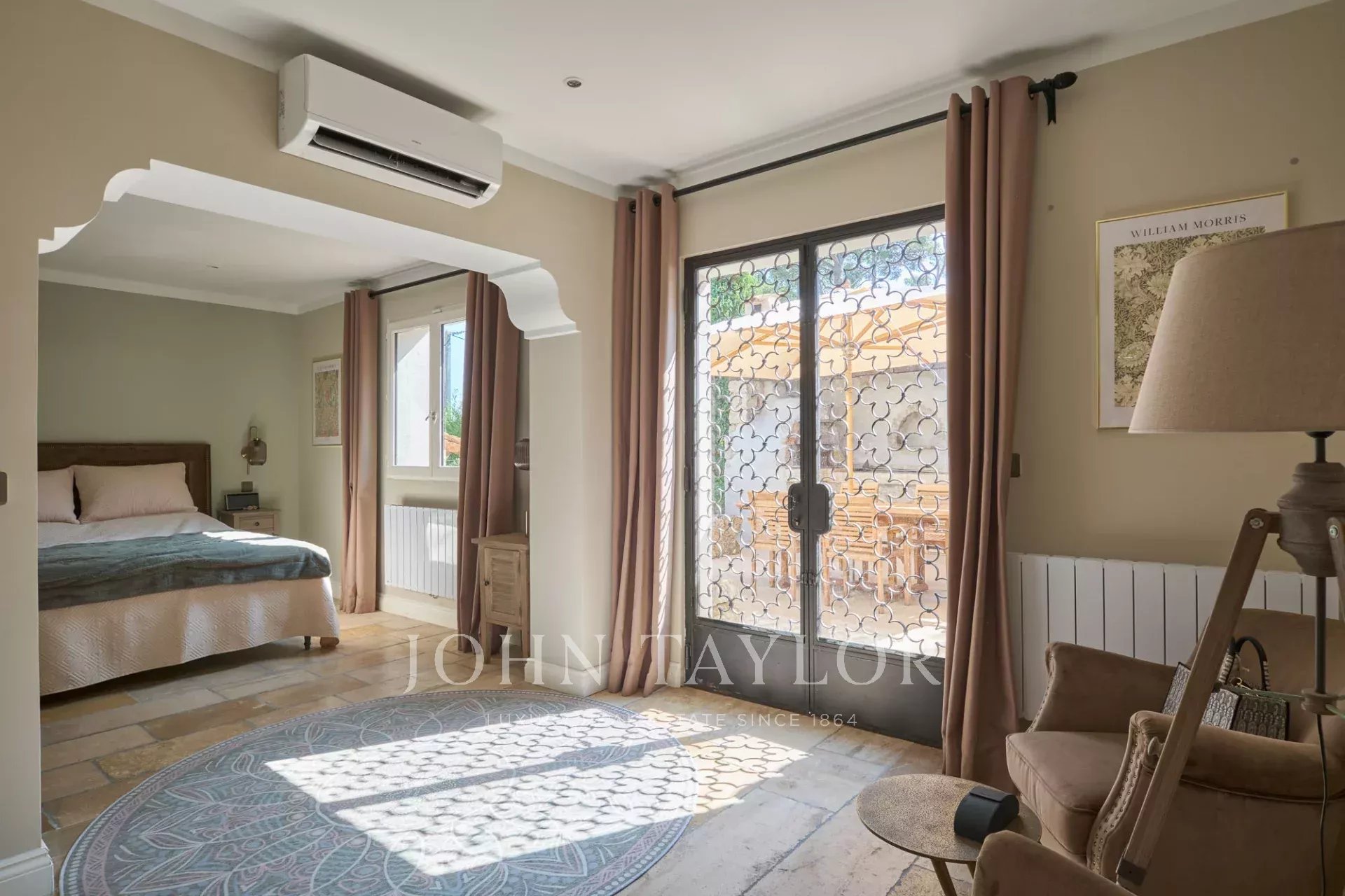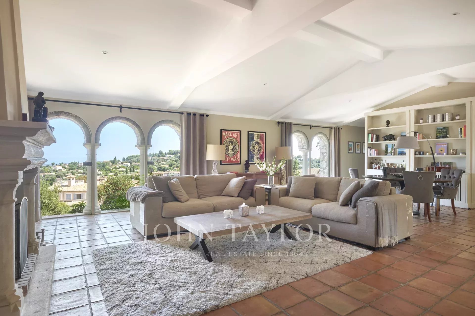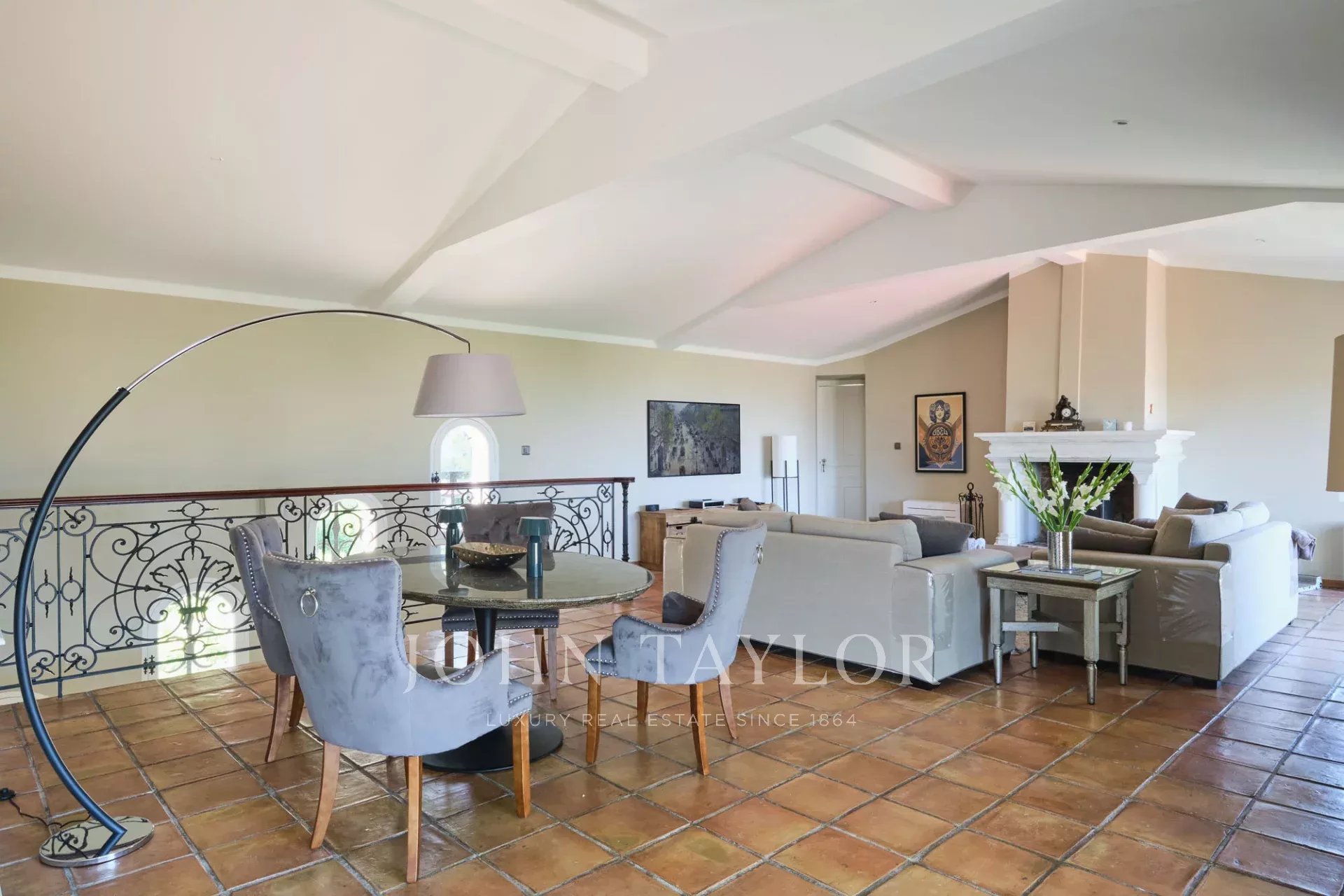 Die Villa beherbergt sechs große Schlafzimmer und sieben Badezimmer, darunter eine prächtige Suite mit Kamin, Ankleidezimmer und einer weitläufigen privaten Terrasse.