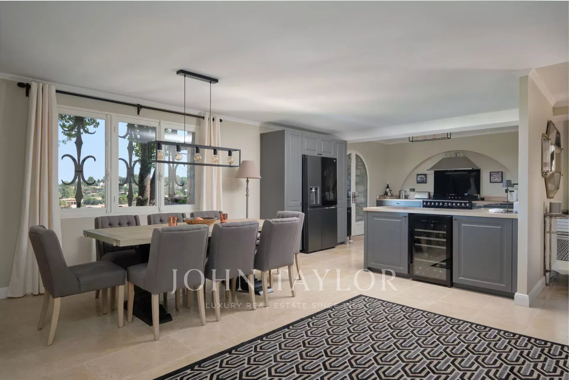 Die großzügige Wohnküche ist modern und hochwertig ausgestattet und öffnet sich zu einem eleganten Esszimmer, ideal für das Bewirten von Familie und Freunden in einer geselligen Atmosphäre.