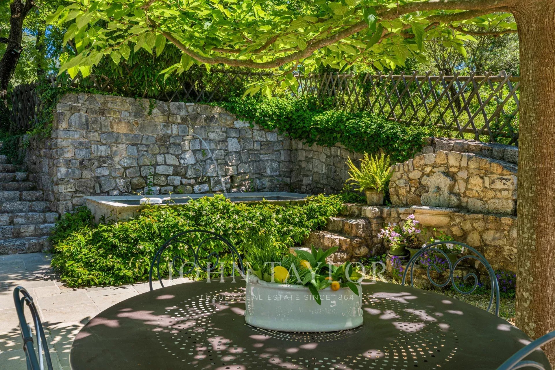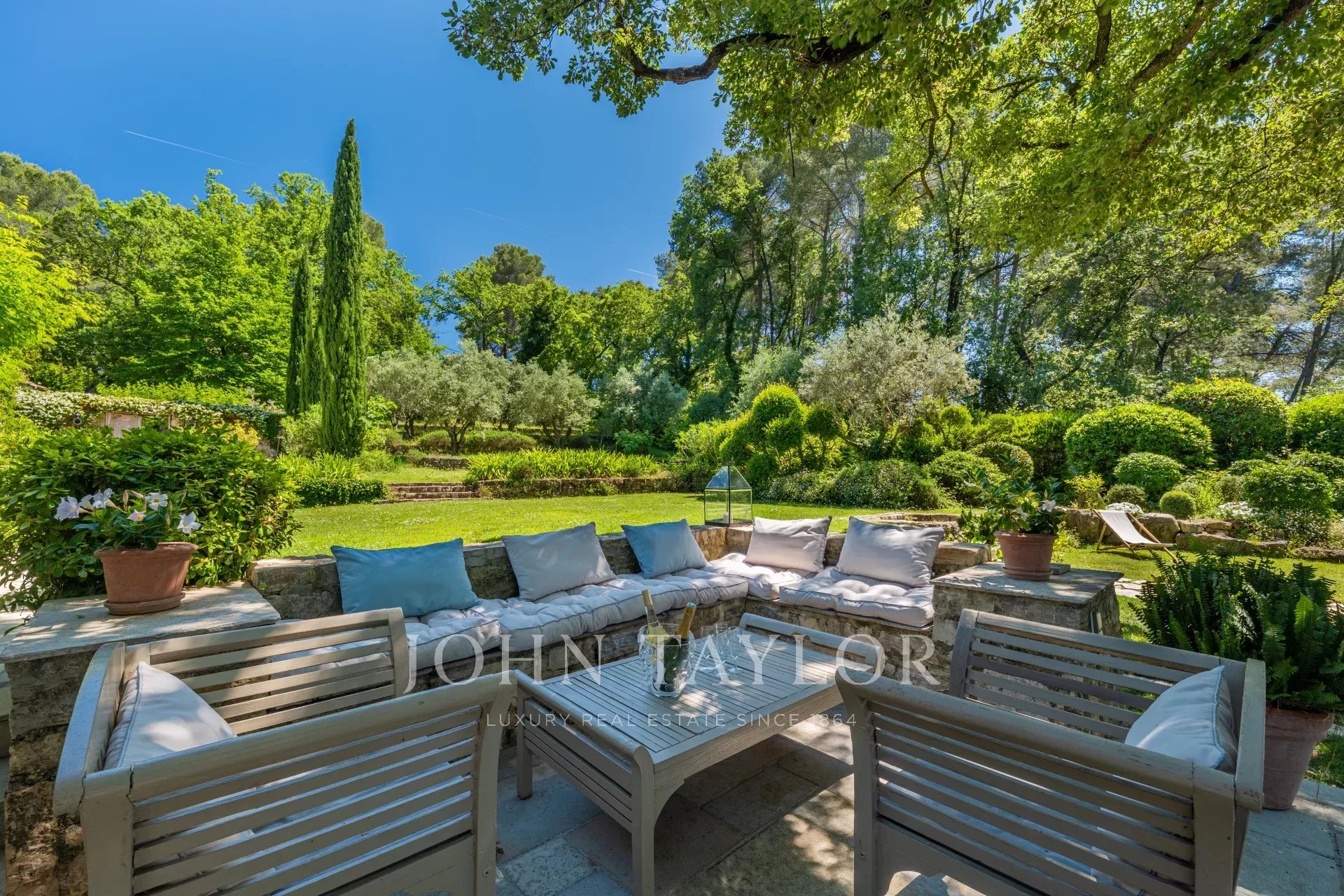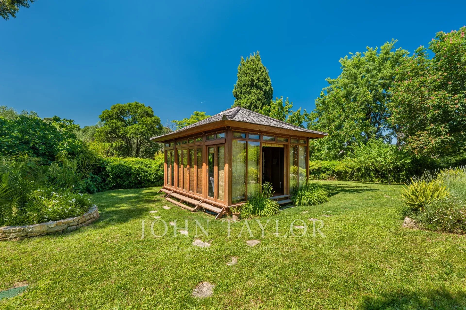 Draußen setzt sich das Schauspiel mit einem wunderschönen, gepflegten 4.978 m² großen Garten fort, der echte grüne Oase. Nach Einbruch der Dunkelheit verleihen über 100 Lichtpunkte dem Ort eine magische und elegante Atmosphäre.