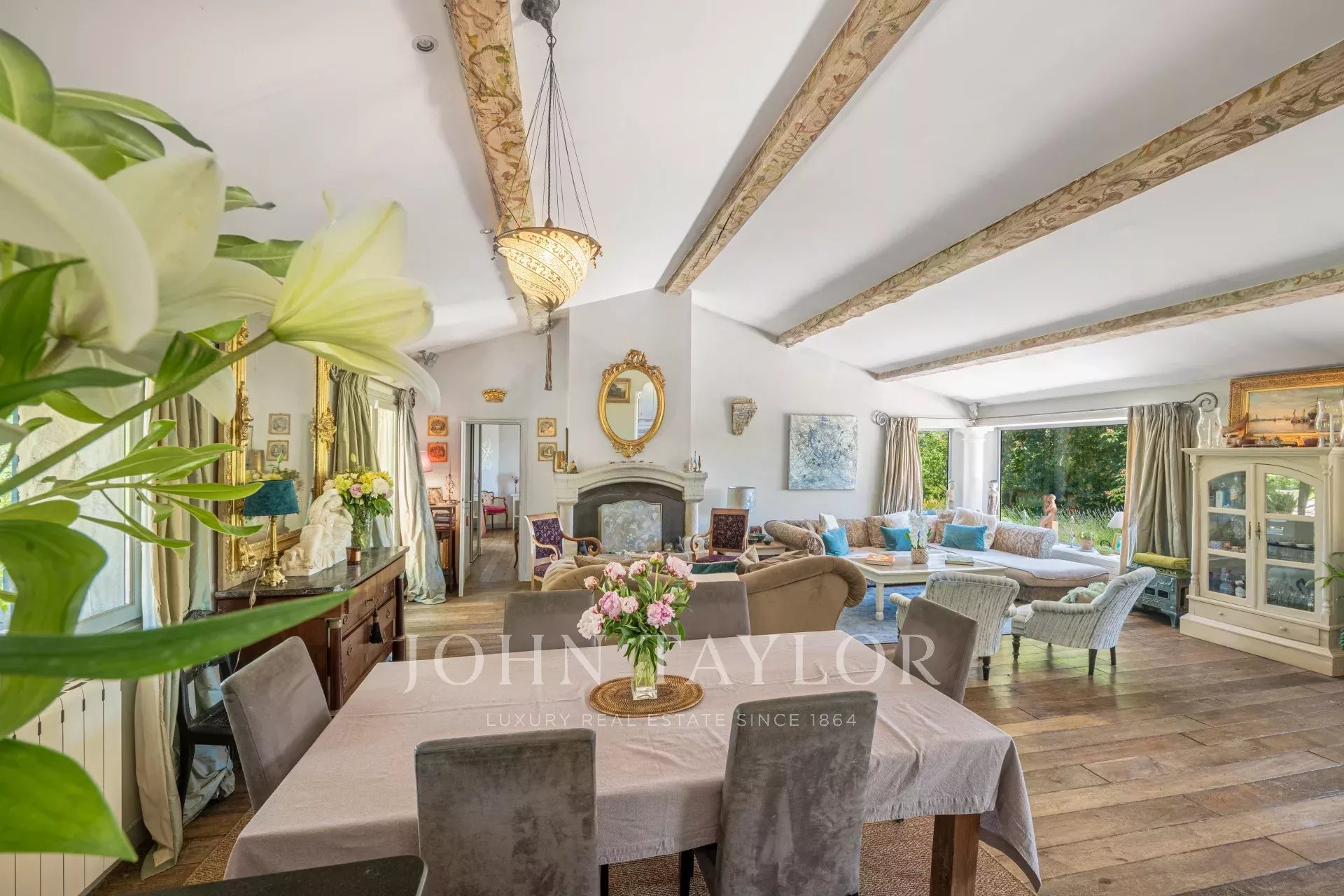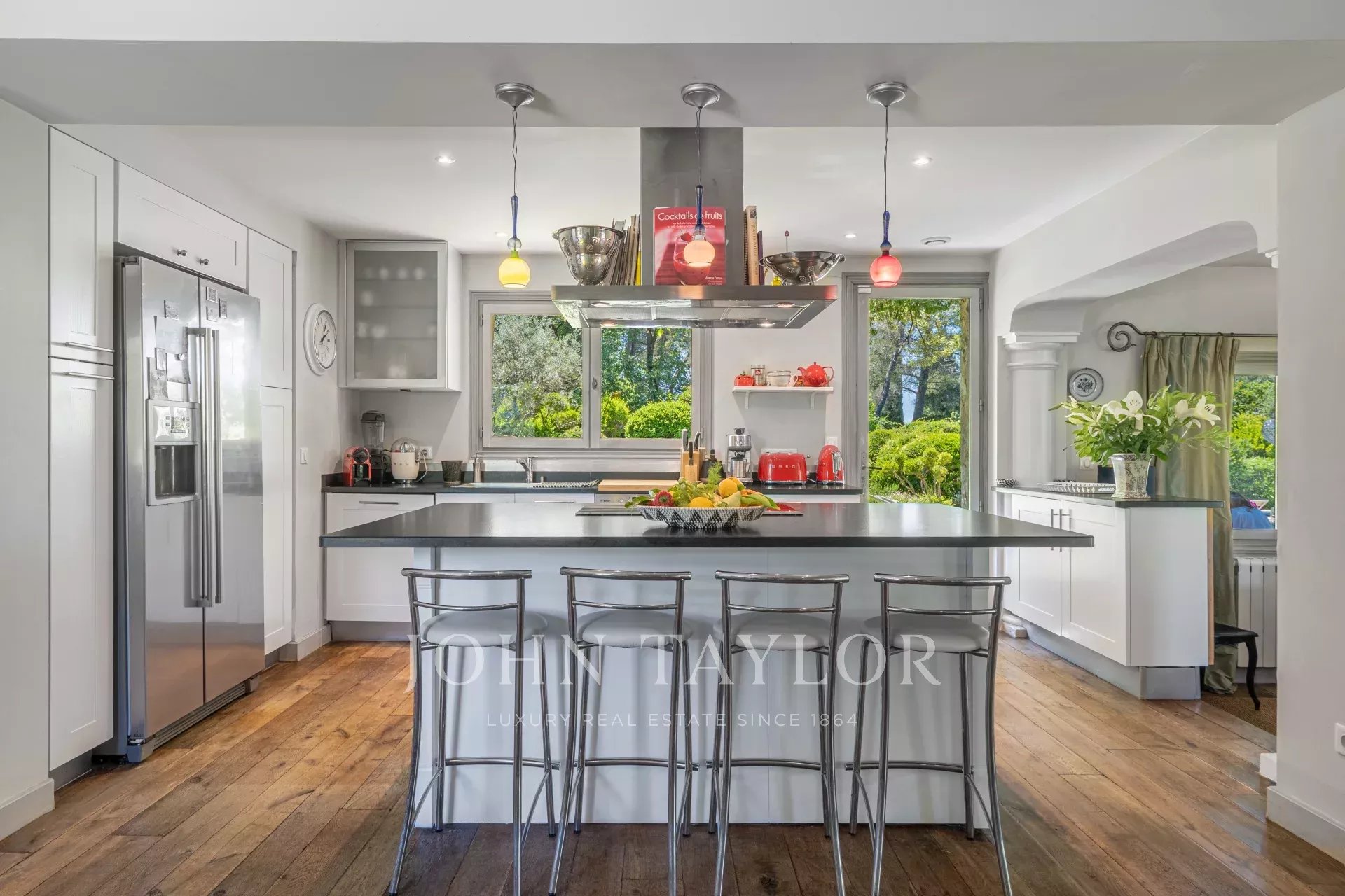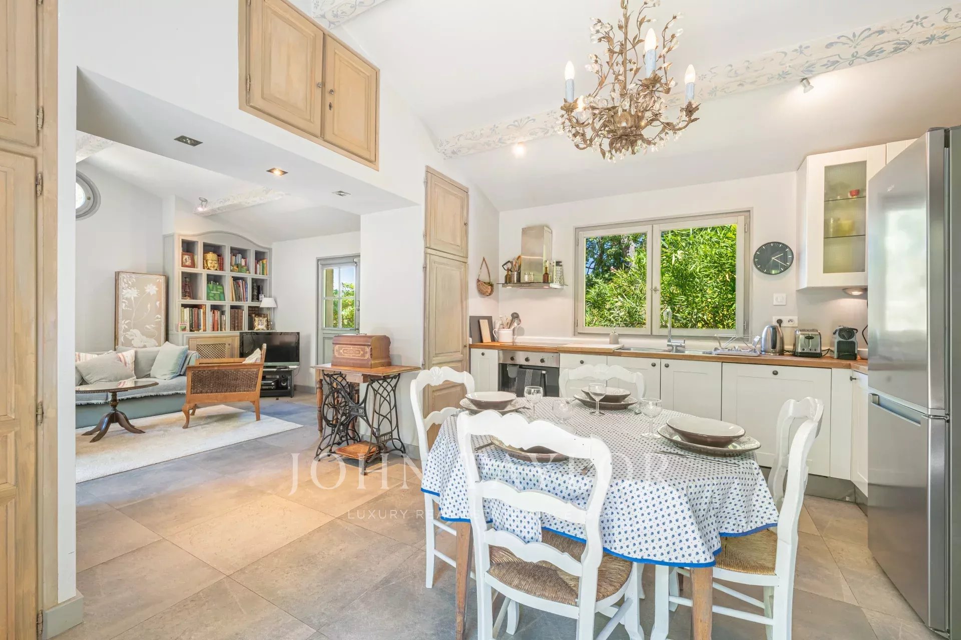 Die offene, perfekt ausgestattete Küche öffnet sich zu einem großen, durch einen eleganten Kamin veredelten Wohnzimmer, das zu raffinierten geselligen Momenten einlädt.