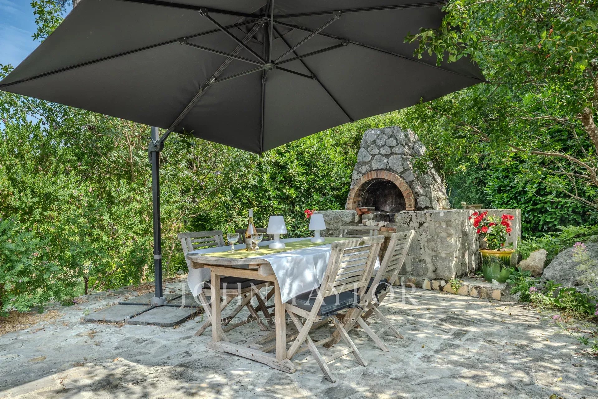 Auf einem großen, flachen Grundstück von 3.171 m² gelegen, genießt das Anwesen eine Südlage und einen wunderschön gepflegten, mit mediterranen Arten bepflanzten provenzalischen Garten mit einem Teich und einem Springbrunnen, die ein Gefühl von Ruhe und Charme vermitteln.