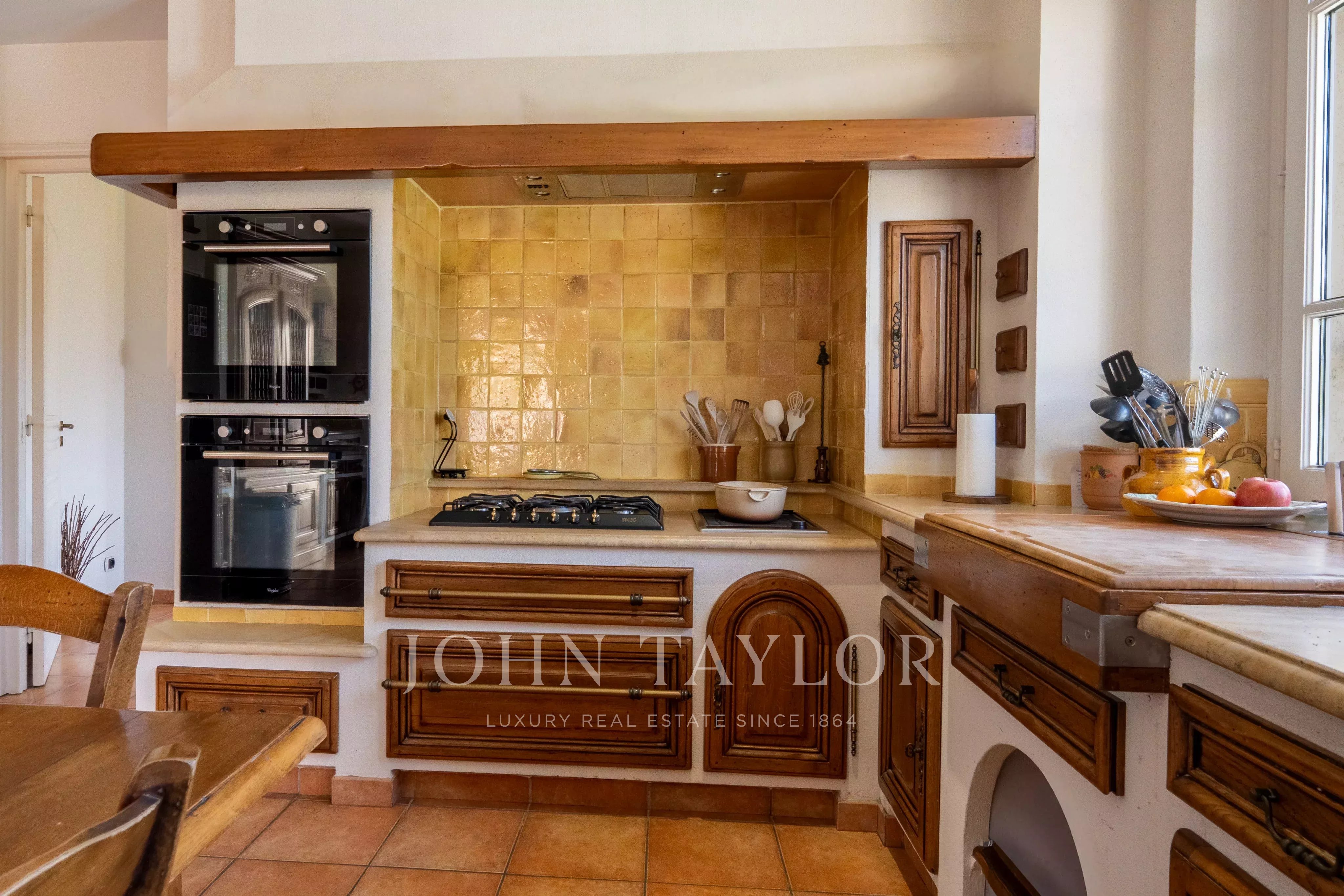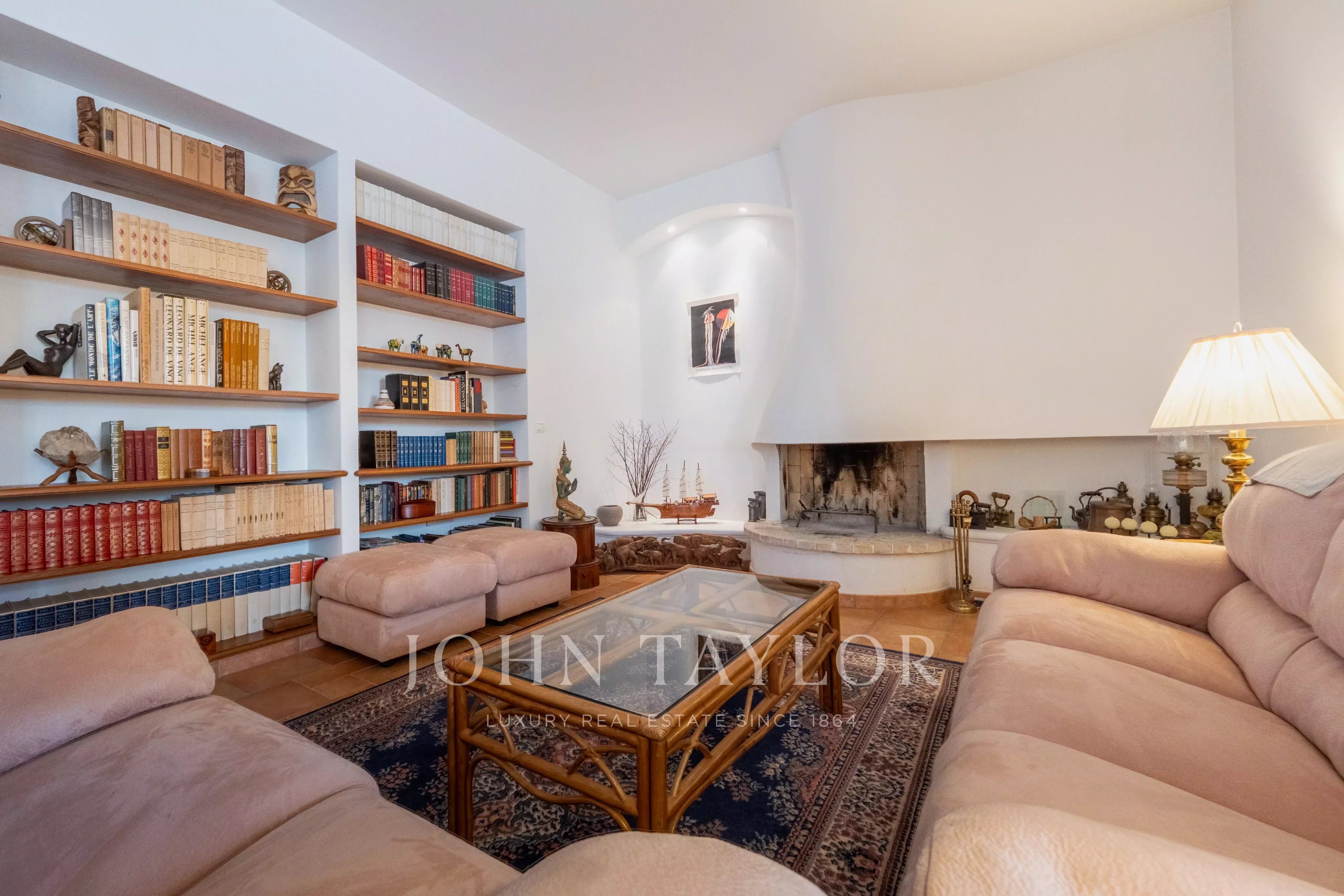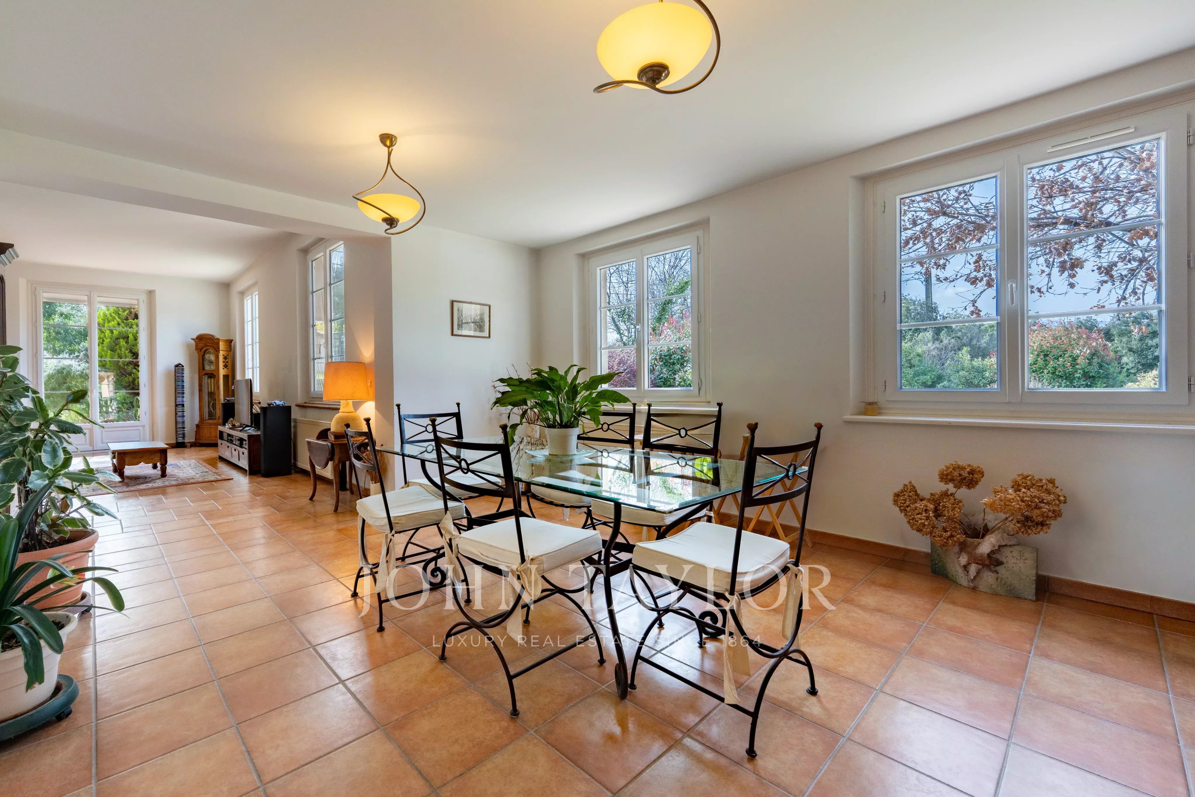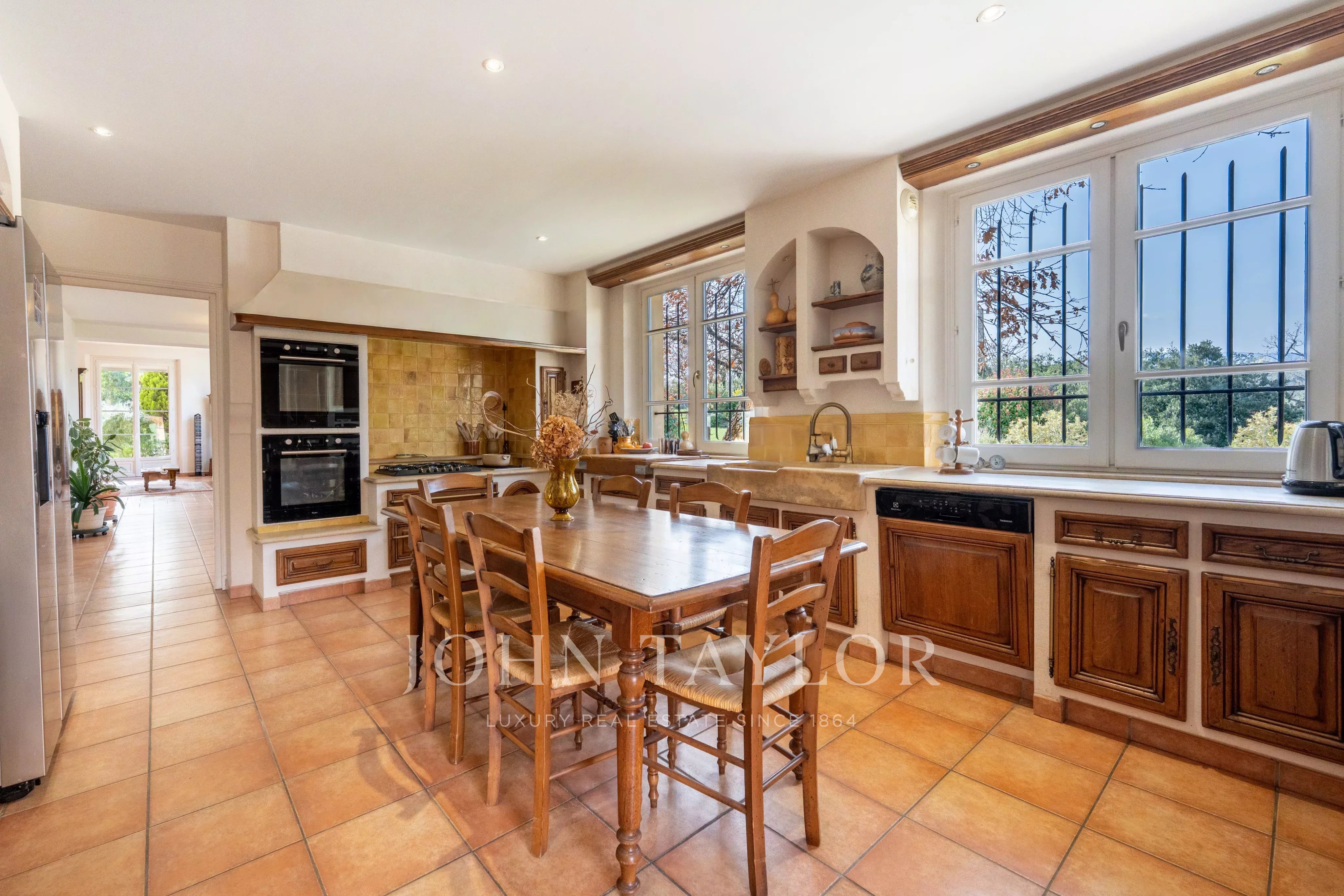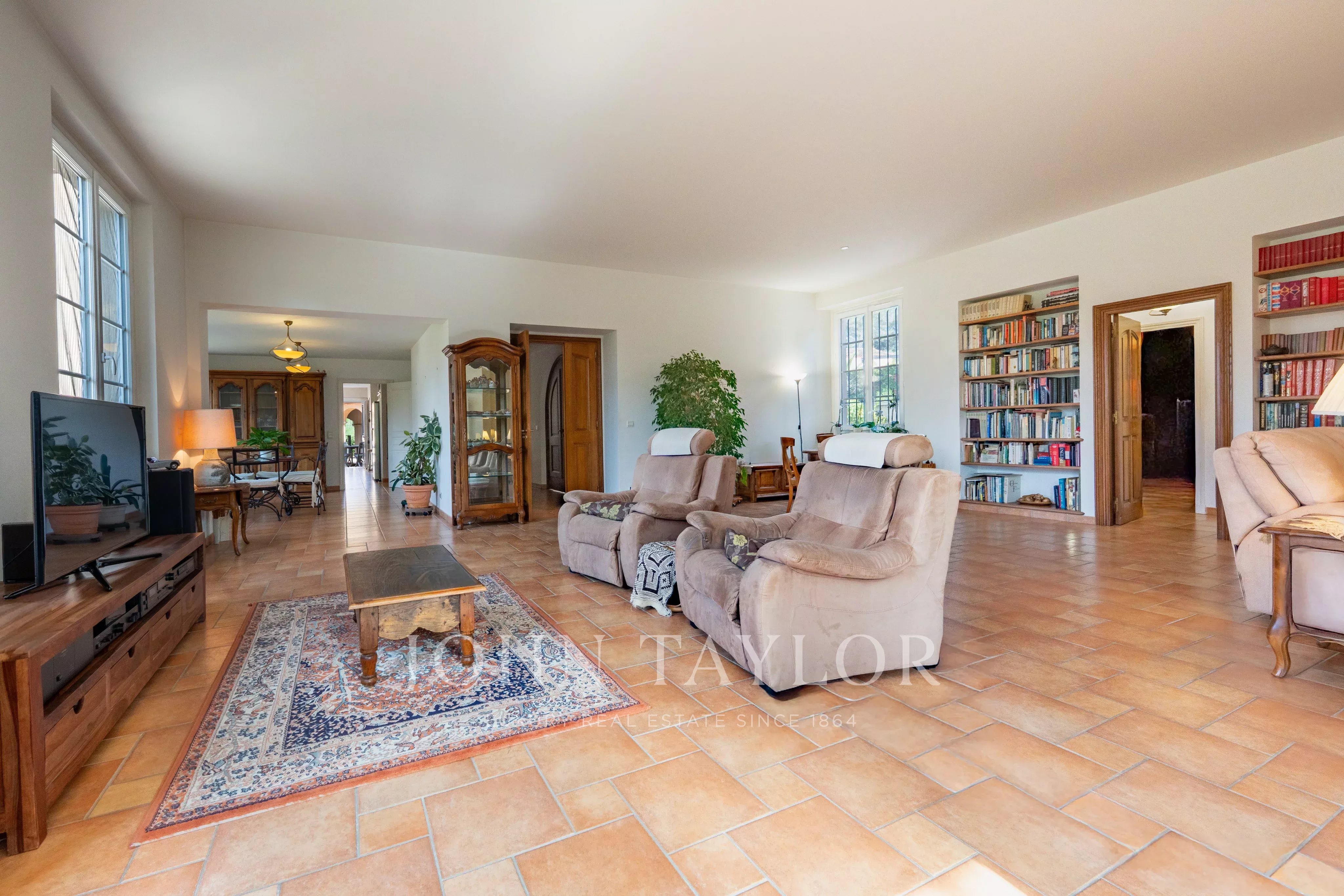 Die ebenerdige Hauptvilla (272 m²) öffnet sich zu einem großzügigen Wohnzimmer von 90 m² mit Kamin und hohen Decken. Verlängert durch eine separate Küche von 24 m².