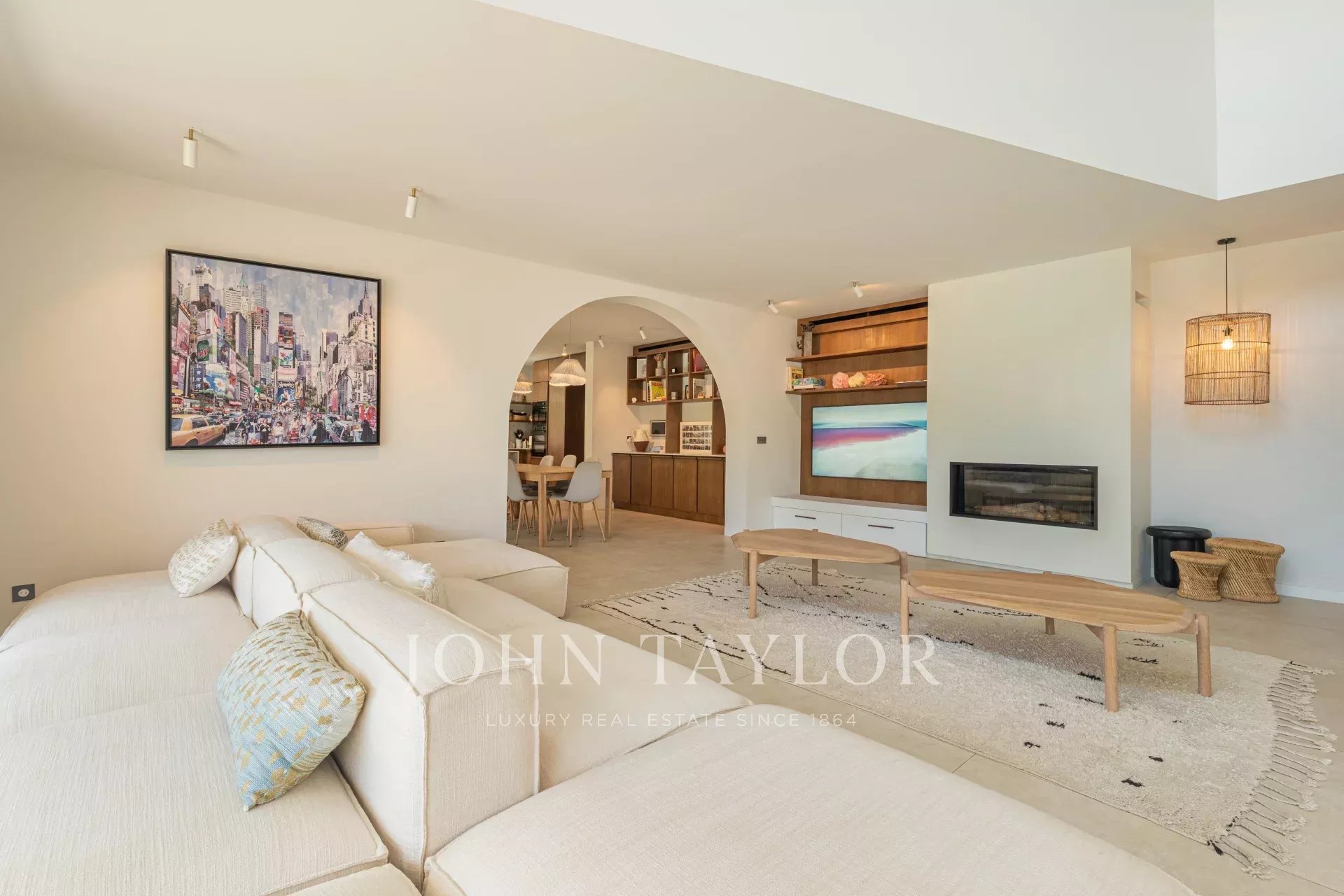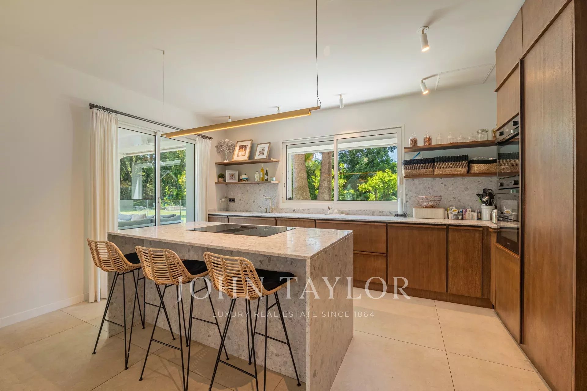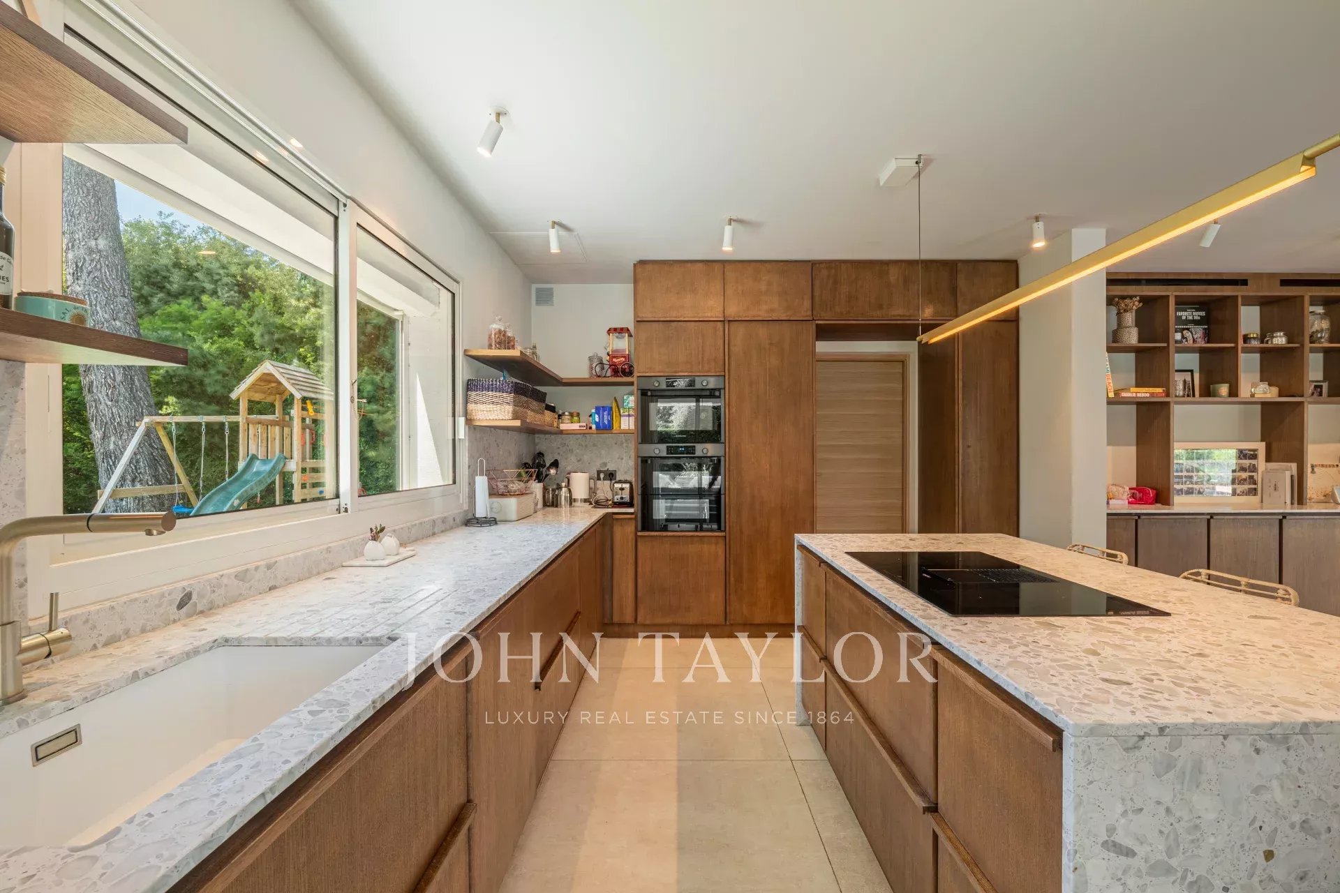 Die hellen und großzügigen Wohnräume sind so gestaltet, dass sie das Zusammenleben fördern. Das Wohnzimmer, das mit einem Kamin ausgestattet ist und sich durch große Fensterfronten nach außen öffnet, verfügt über eine hohe Decke, die das Gefühl von Geräumigkeit unterstreicht. Die offene, voll ausgestattete Küche fügt sich harmonisch in das Gesamtbild ein und bietet den idealen Rahmen für Familienessen.