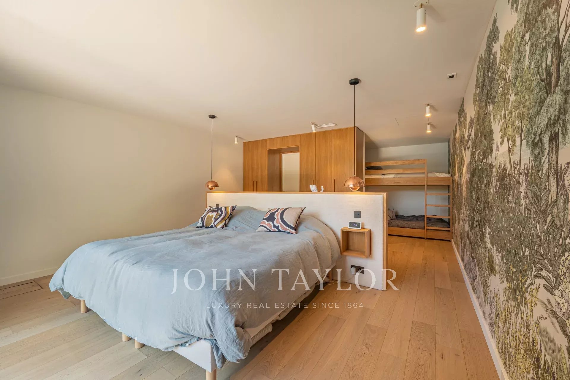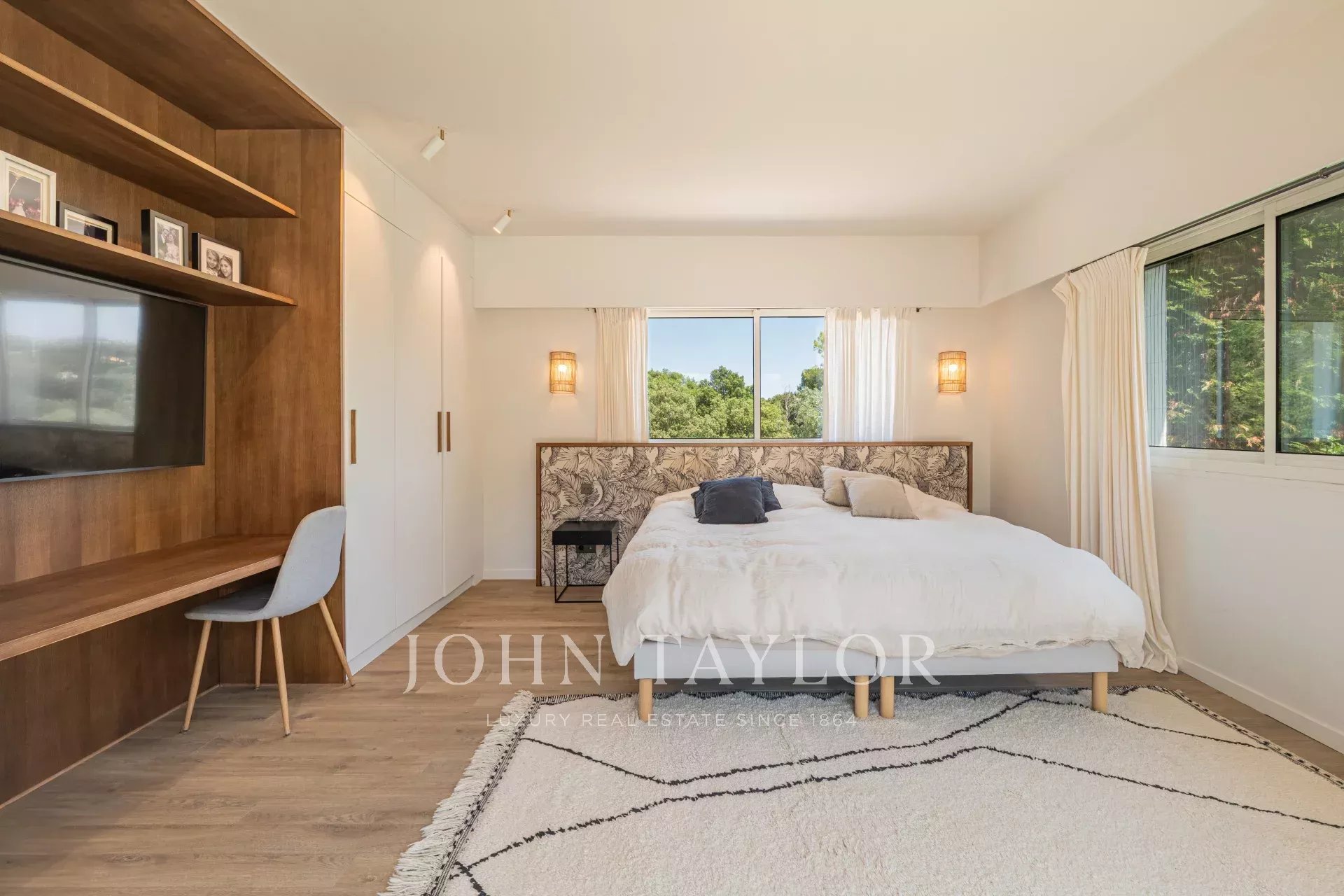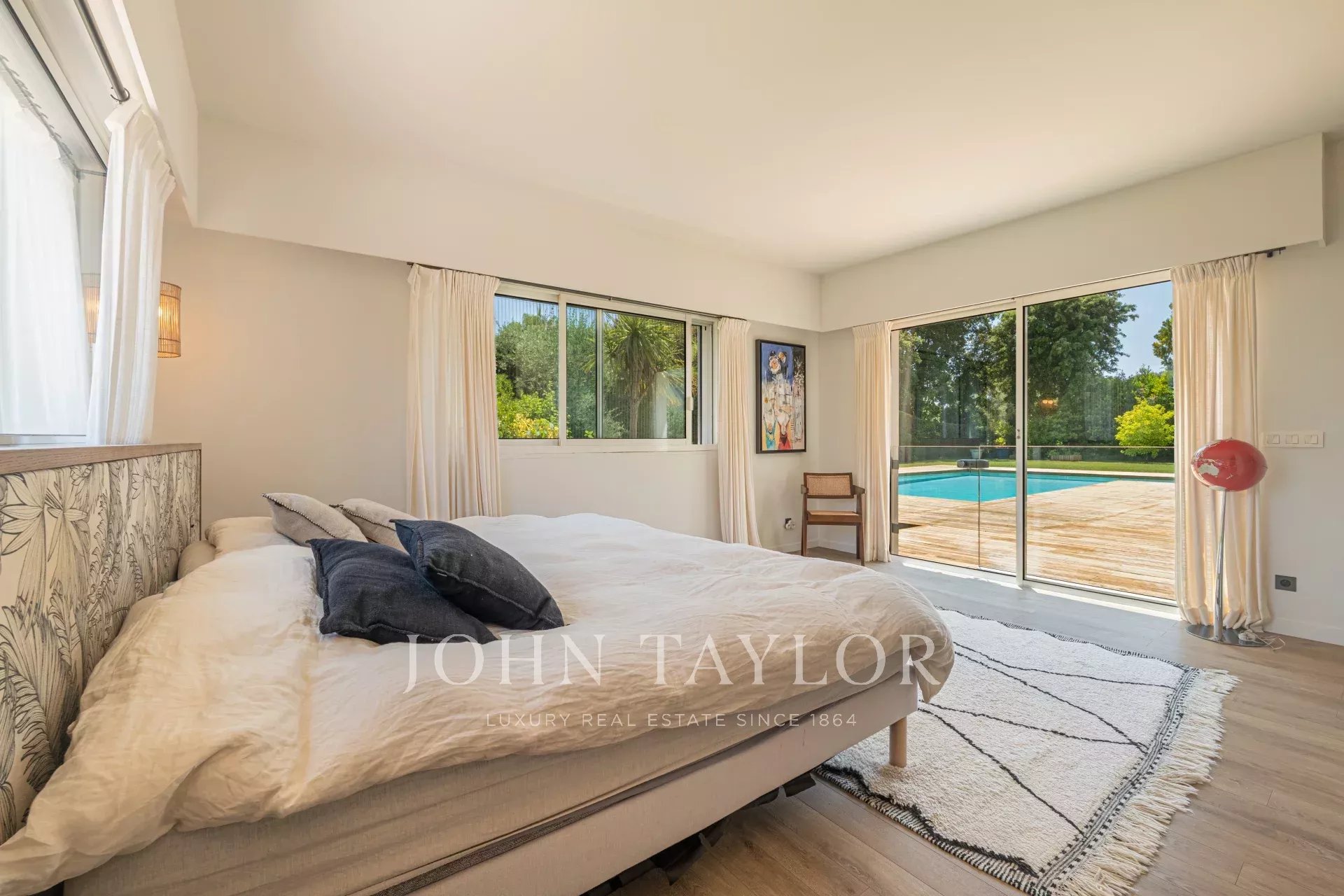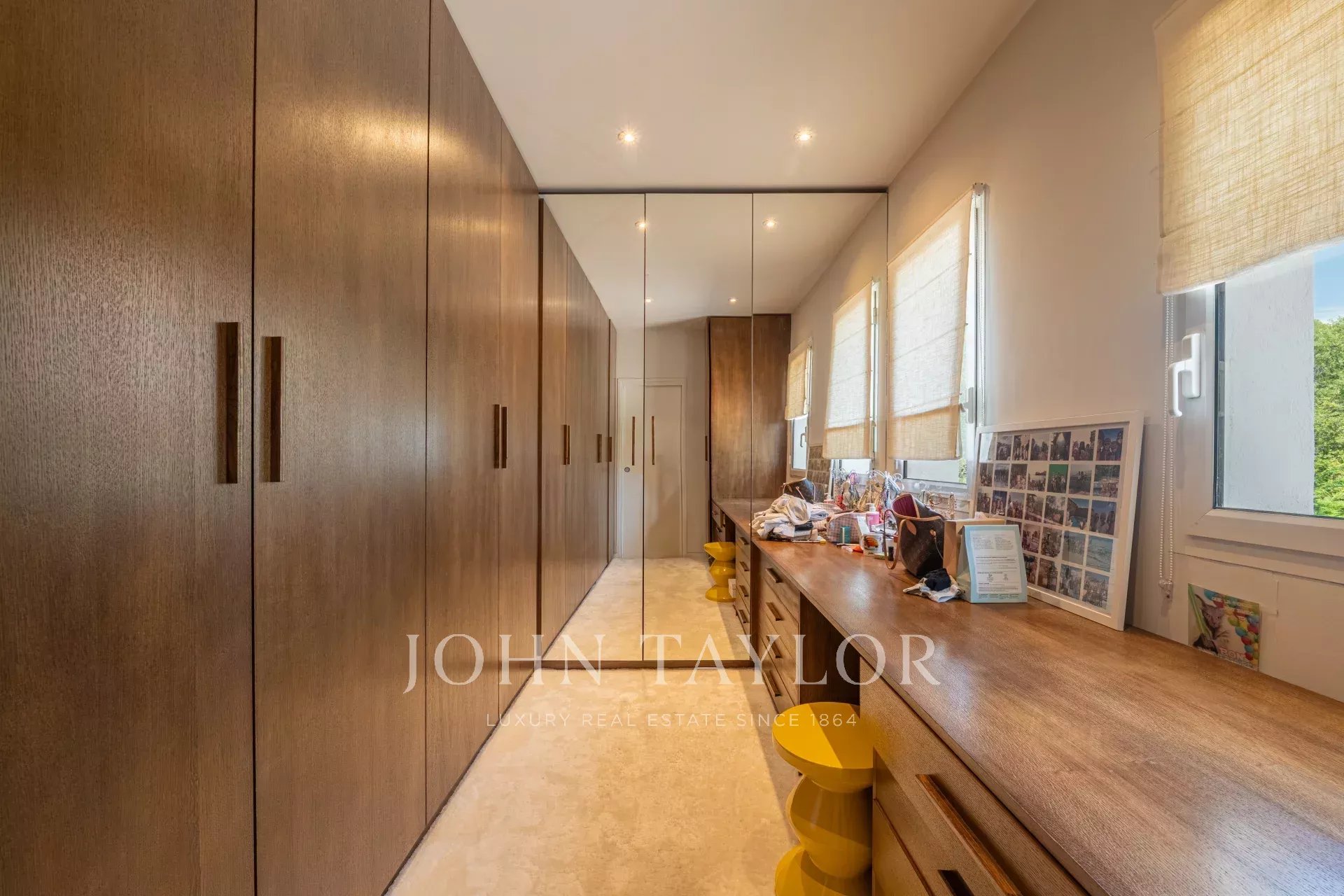Der Schlafbereich besteht aus fünf Schlafzimmern, darunter eine bemerkenswerte Master-Suite mit Ankleidezimmer und eigenem Bad, sowie fünf Badezimmern. Ein Büro vervollständigt die Räume und bietet eine komfortable Lösung für Telearbeit oder eine selbstständige Tätigkeit. Ein separates Studio bietet die Möglichkeit, Familie, Freunde oder Personal in aller Diskretion zu empfangen.
