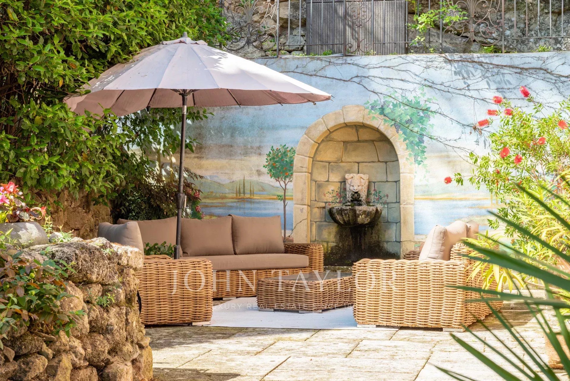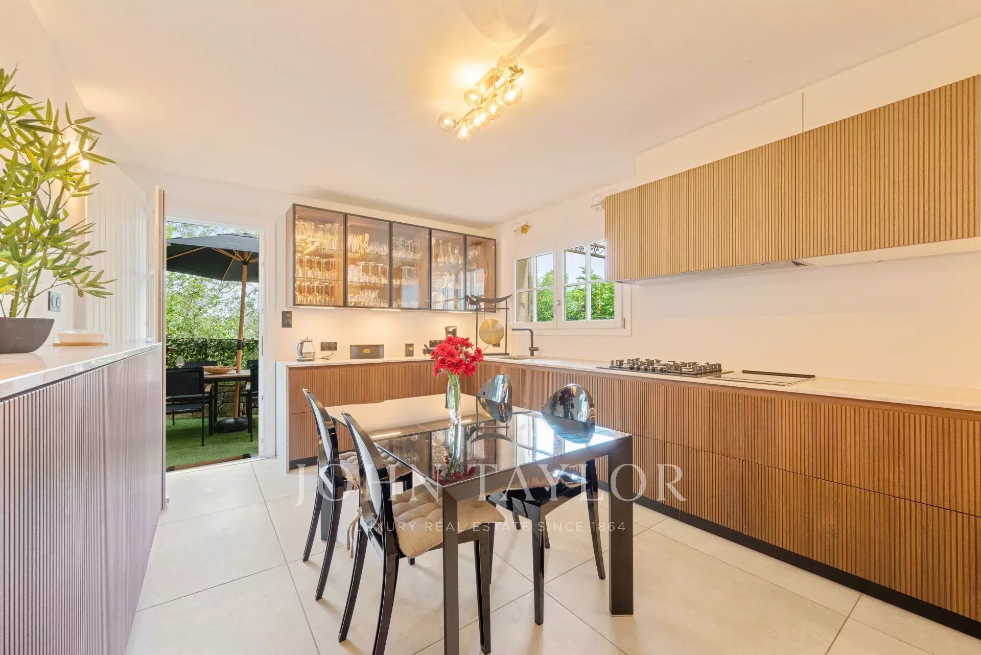Das Landhaus besticht durch seine großzügigen Räume (3,5 m Deckenhöhe), sein großes Wohnzimmer mit Kamin, das sich zu einer großen Sonnenterrasse hin öffnet, ein elegantes Esszimmer und eine kürzlich renovierte Küche.