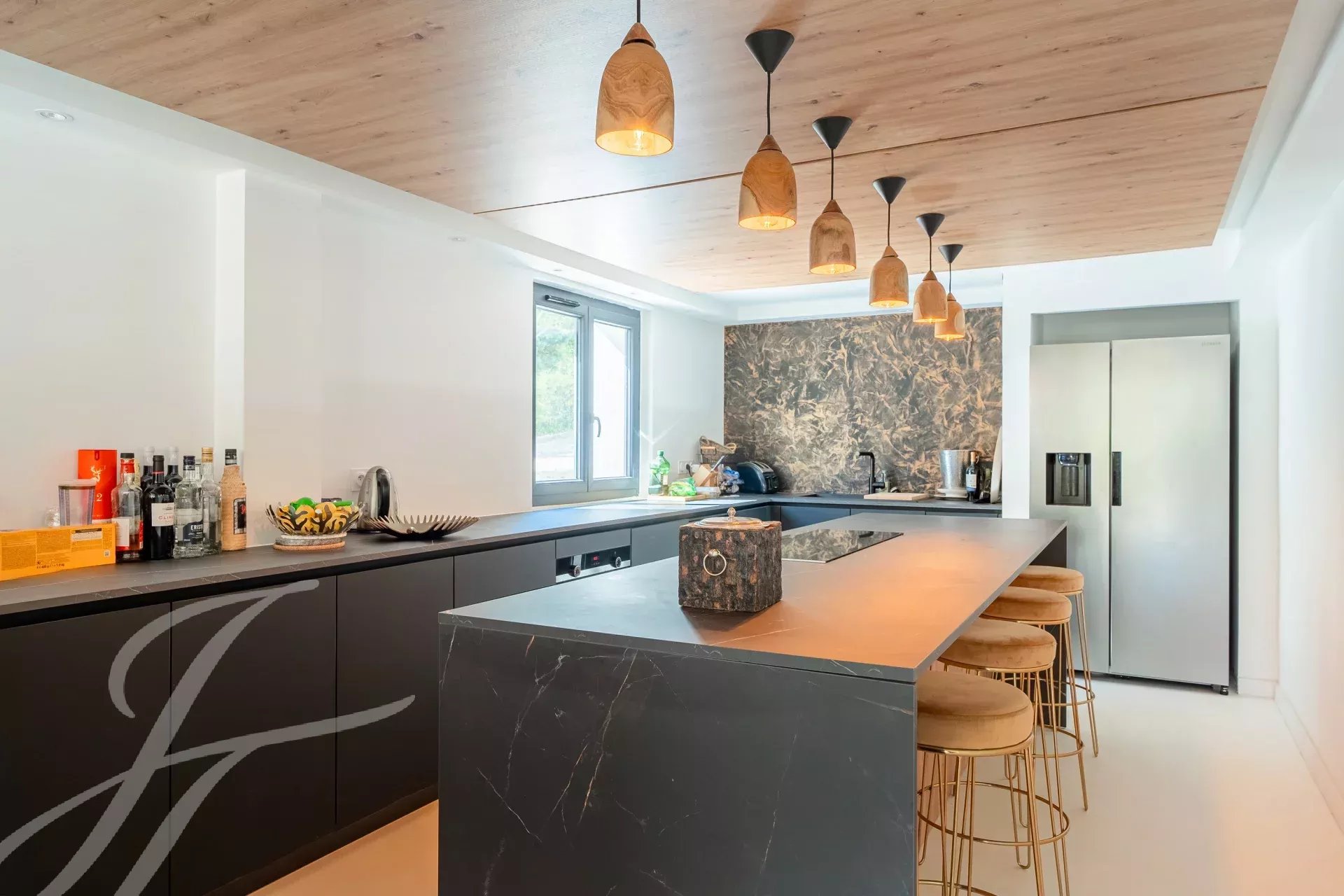 Beim Eintreten überzeugen die Räumlichkeiten und die Helligkeit: Ein großzügiges Wohnzimmer, das Wohnzimmer, die Essecke und die ausgestattete Küche vereint, offen nach außen, schafft einen freundlichen Raum, ideal zum Empfang.