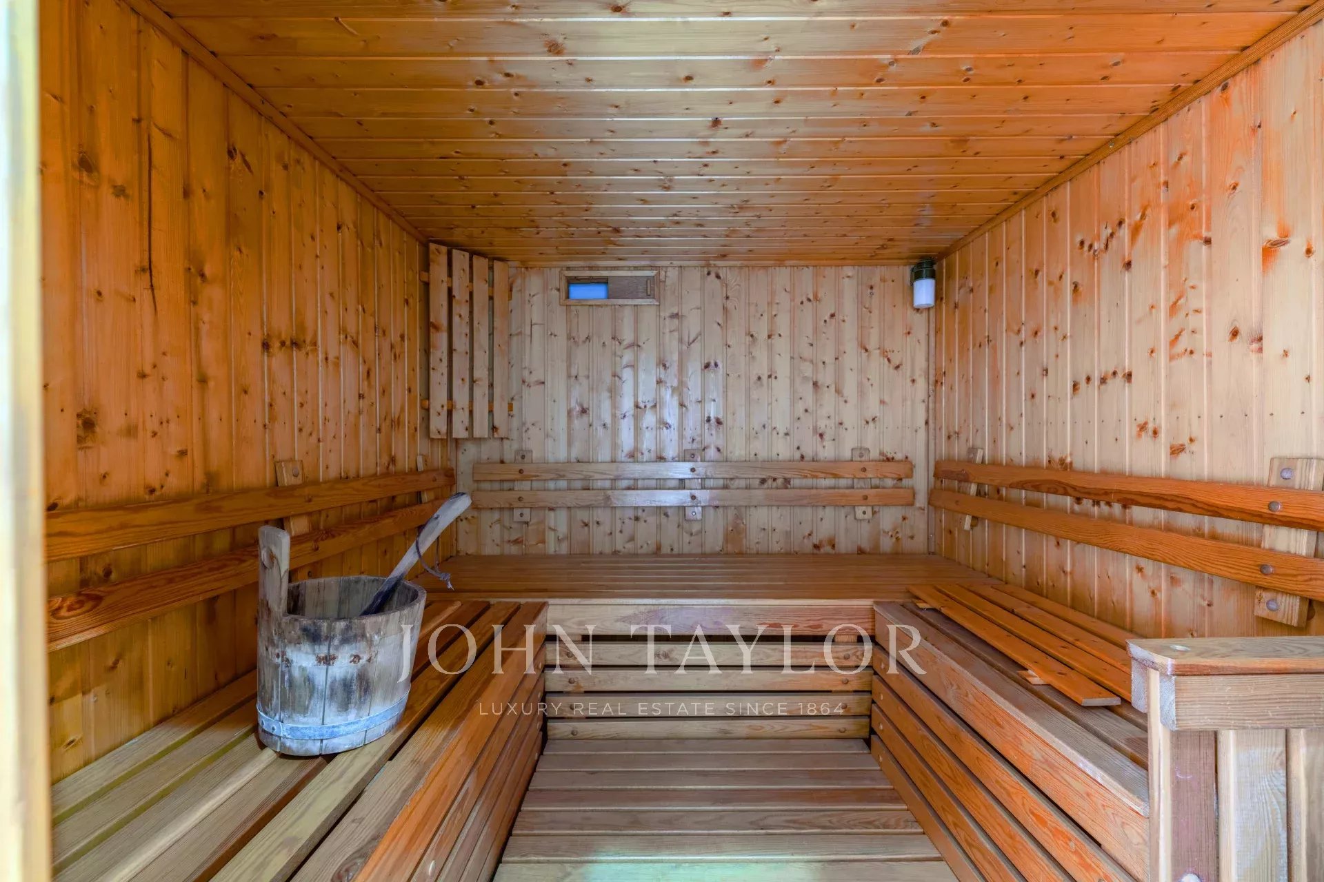 Im Schlafbereich bietet das Haus vier komfortable Schlafzimmer, jedes mit eigenem Bad, sowie zwei separate Toiletten, einen großen begehbaren Kleiderschrank und ein Badezimmer mit Sauna für entspannende Momente.