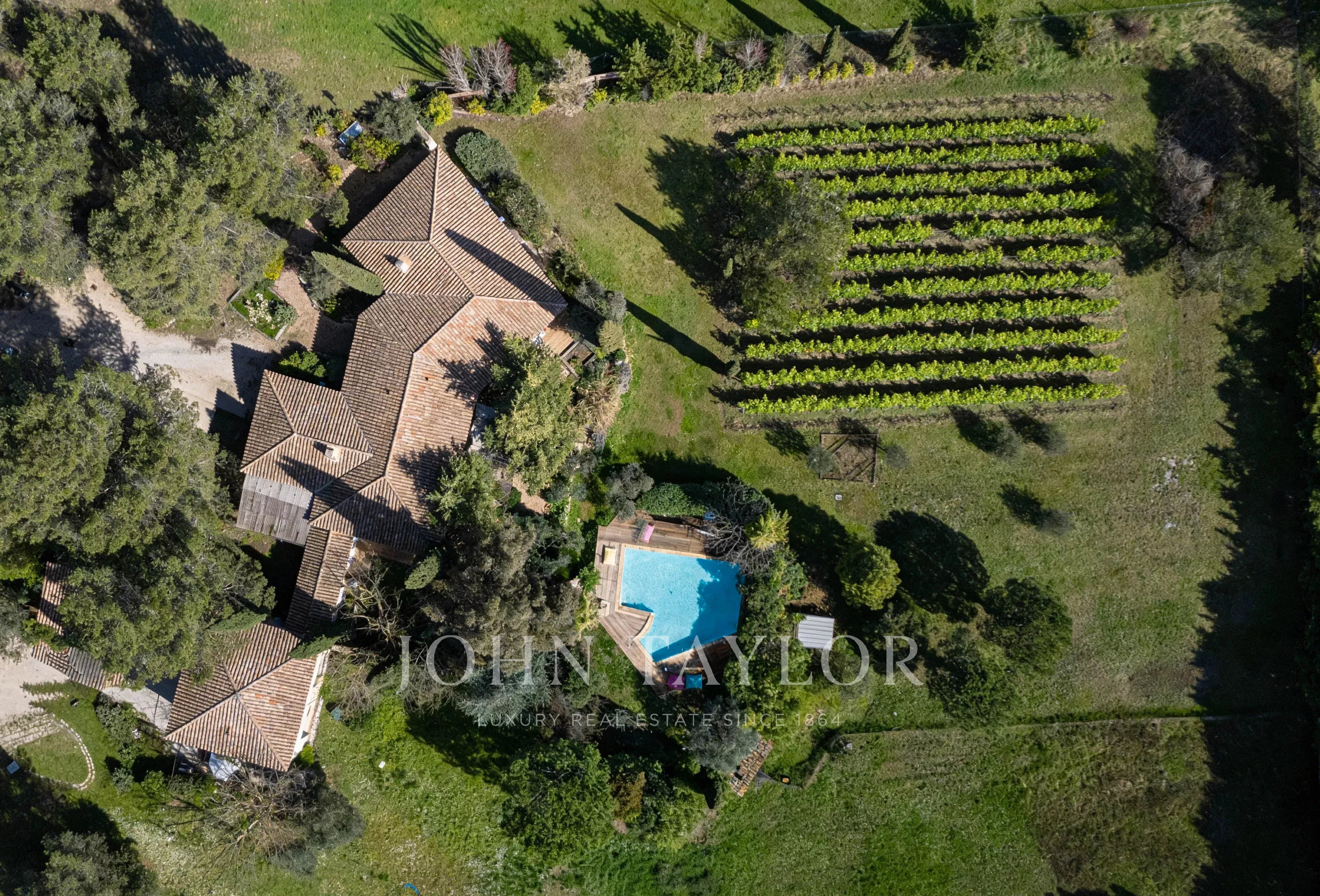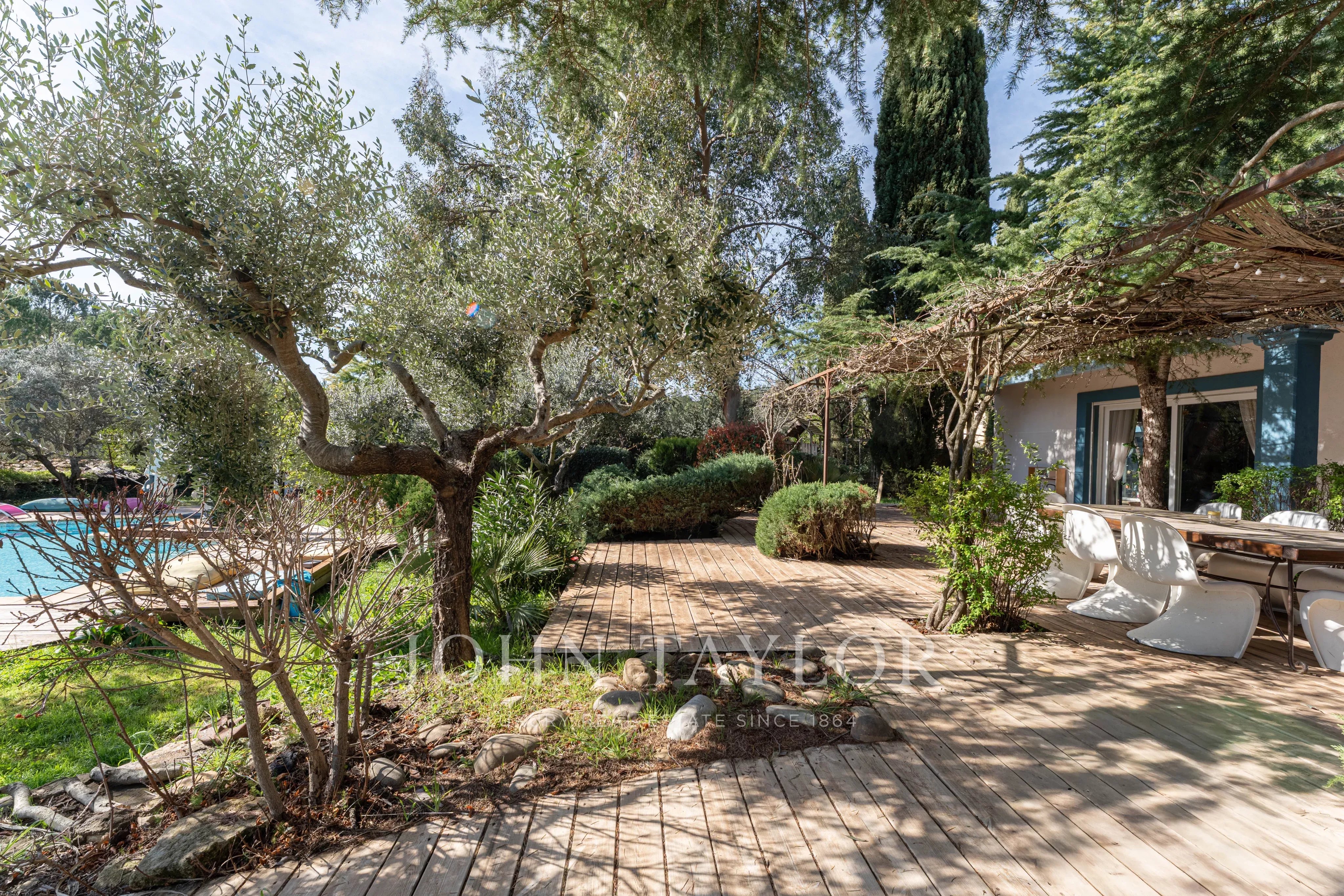 Im Herzen des wunderschön angelegten, ruhigen Gartens genießen Sie absolute Privatsphäre und ein einzigartiges mediterranes Ambiente. Der große Swimmingpool lädt an sonnigen Tagen zum Entspannen und Verweilen ein. Mehrere Terrassen mit schattigen Sitzgelegenheiten bieten den idealen Rahmen für gesellige Stunden im Freien, umgeben von üppigem Grün und gepflegten Weinreben.