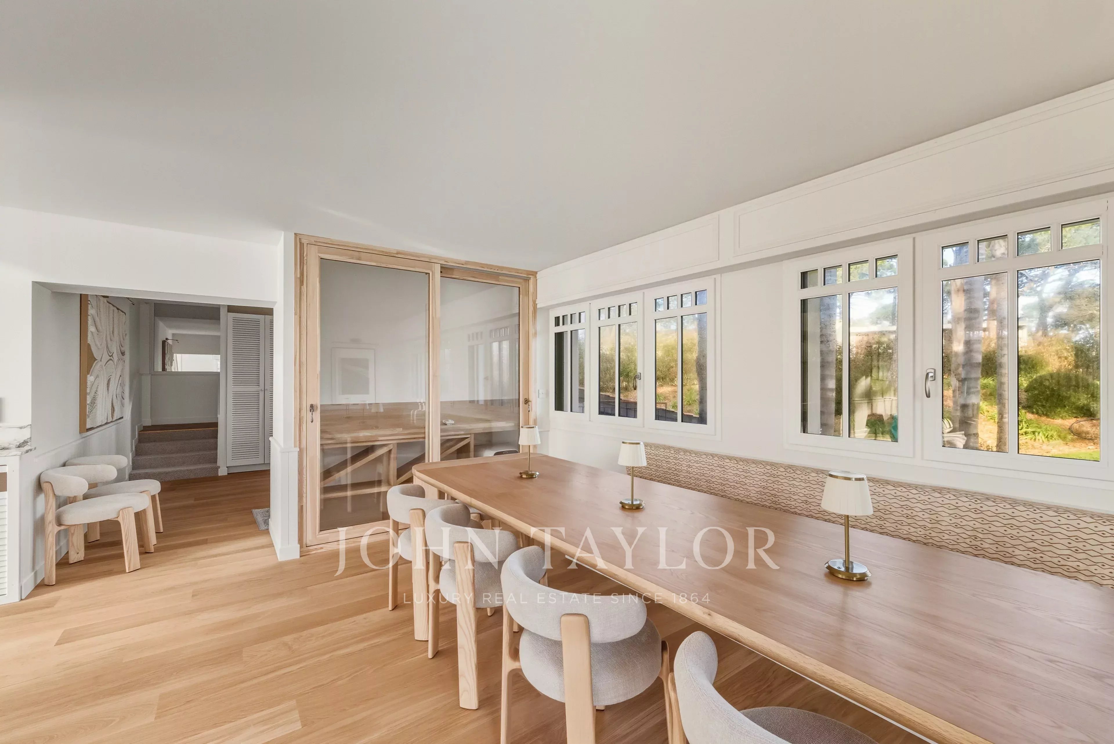 Die Innenräume, die in weiches, natürliches Licht getaucht sind, öffnen sich zu einem majestätischen Landschaftspark. Der Garten, ein wahres grünes Schmuckkästchen mit lokalen Baumarten, lädt zur Kontemplation und Gelassenheit ein, weit weg von jeglicher Hektik.