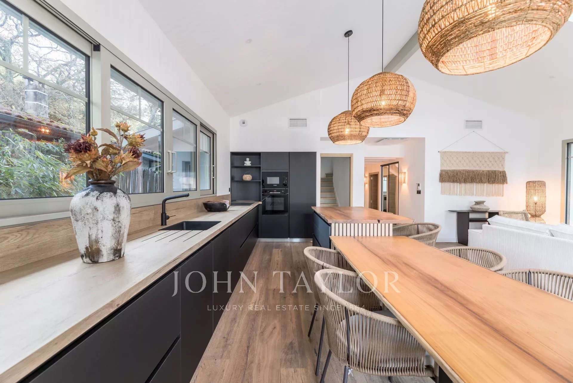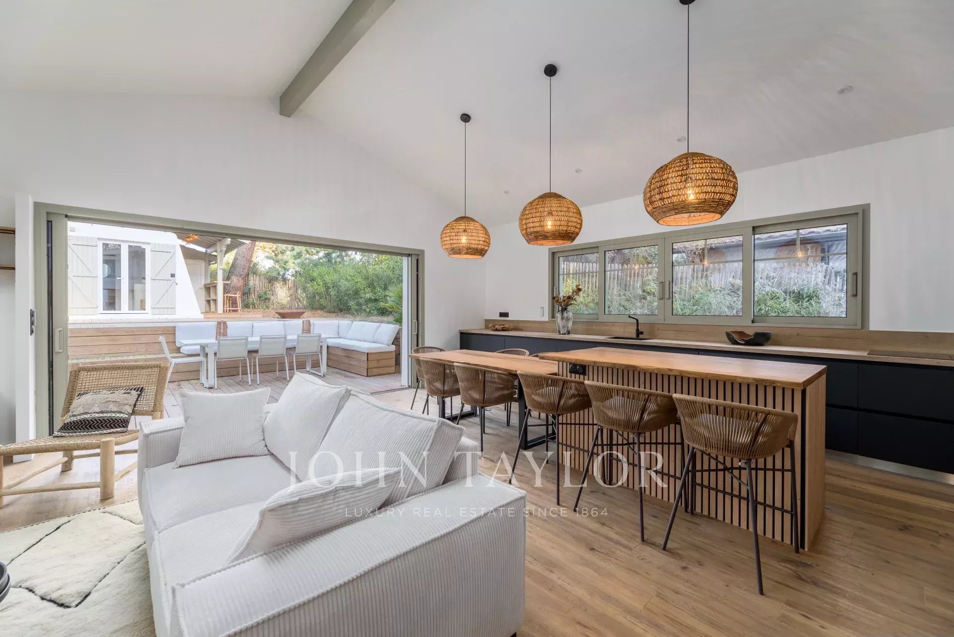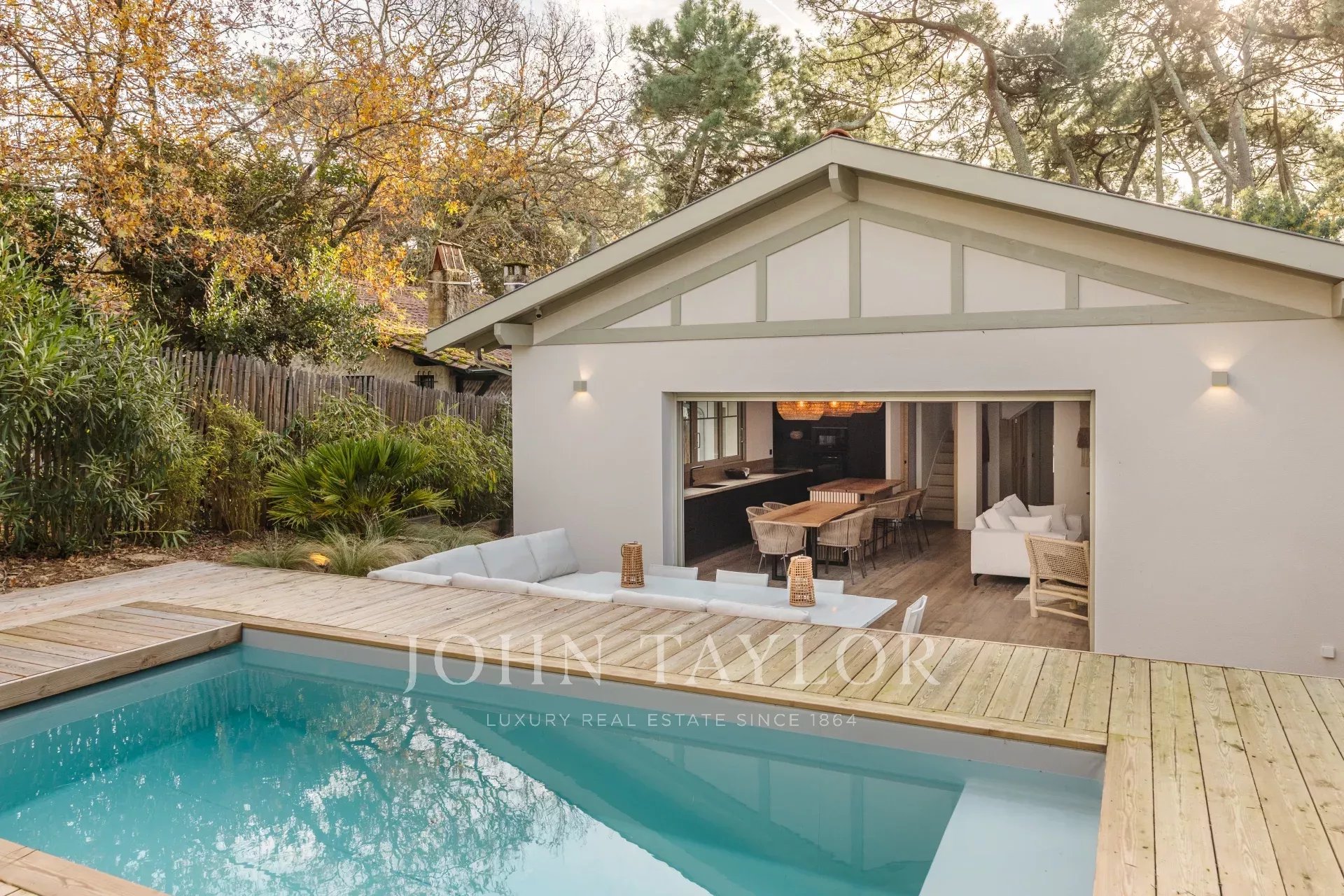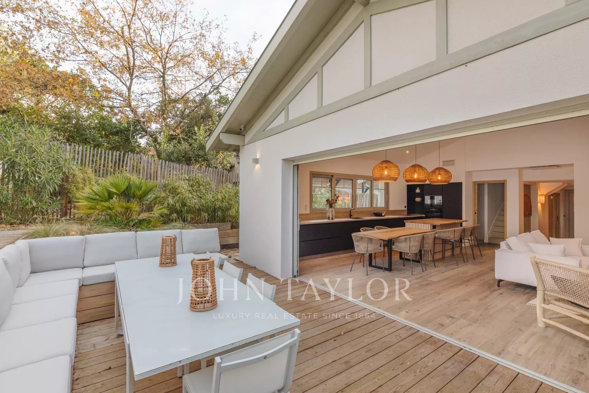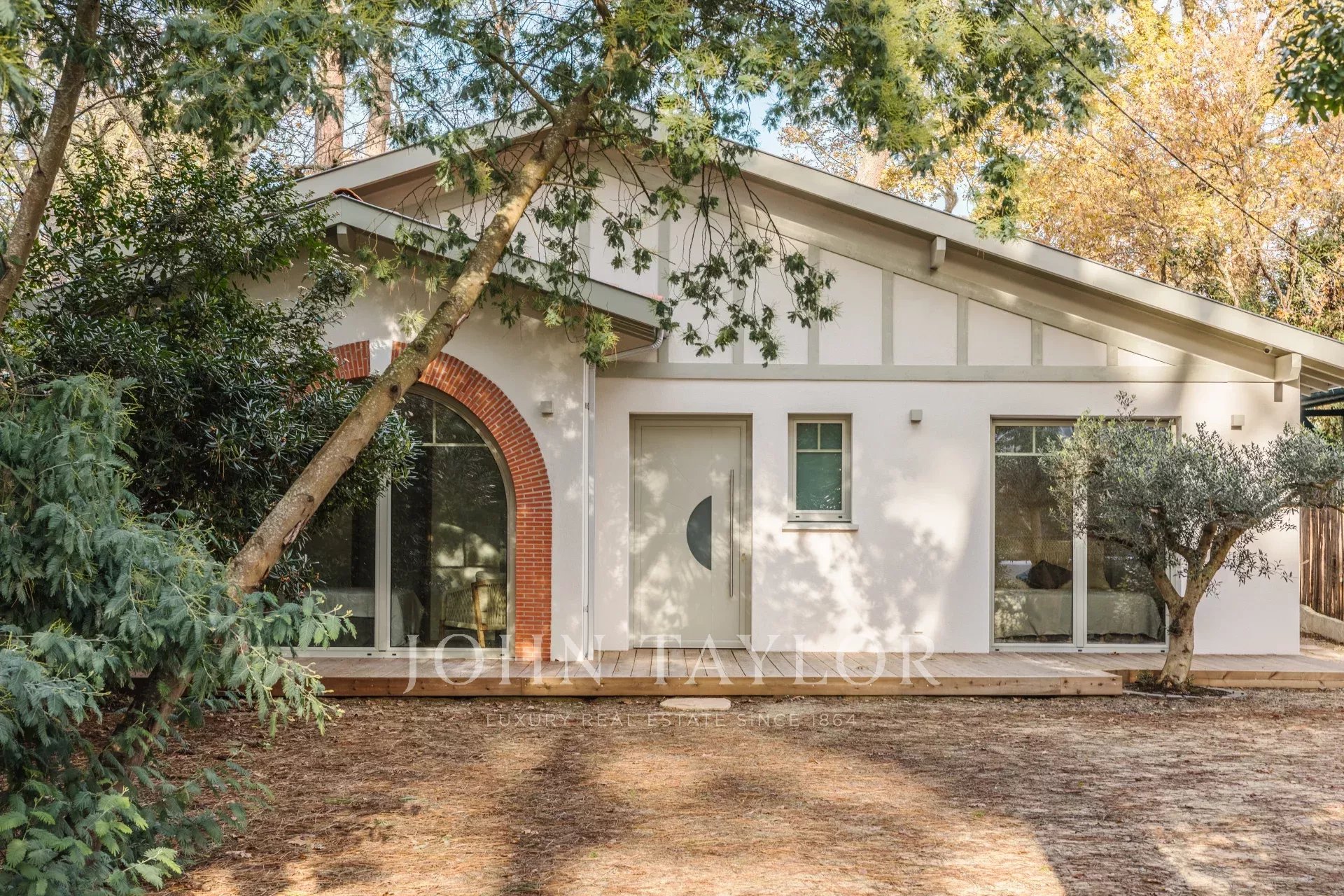 John Taylor Arcachon präsentiert diese beeindruckend renovierte Villa, die sich in der begehrten Gegend von Haïtza befindet, nur 200 Meter vom Strand entfernt.