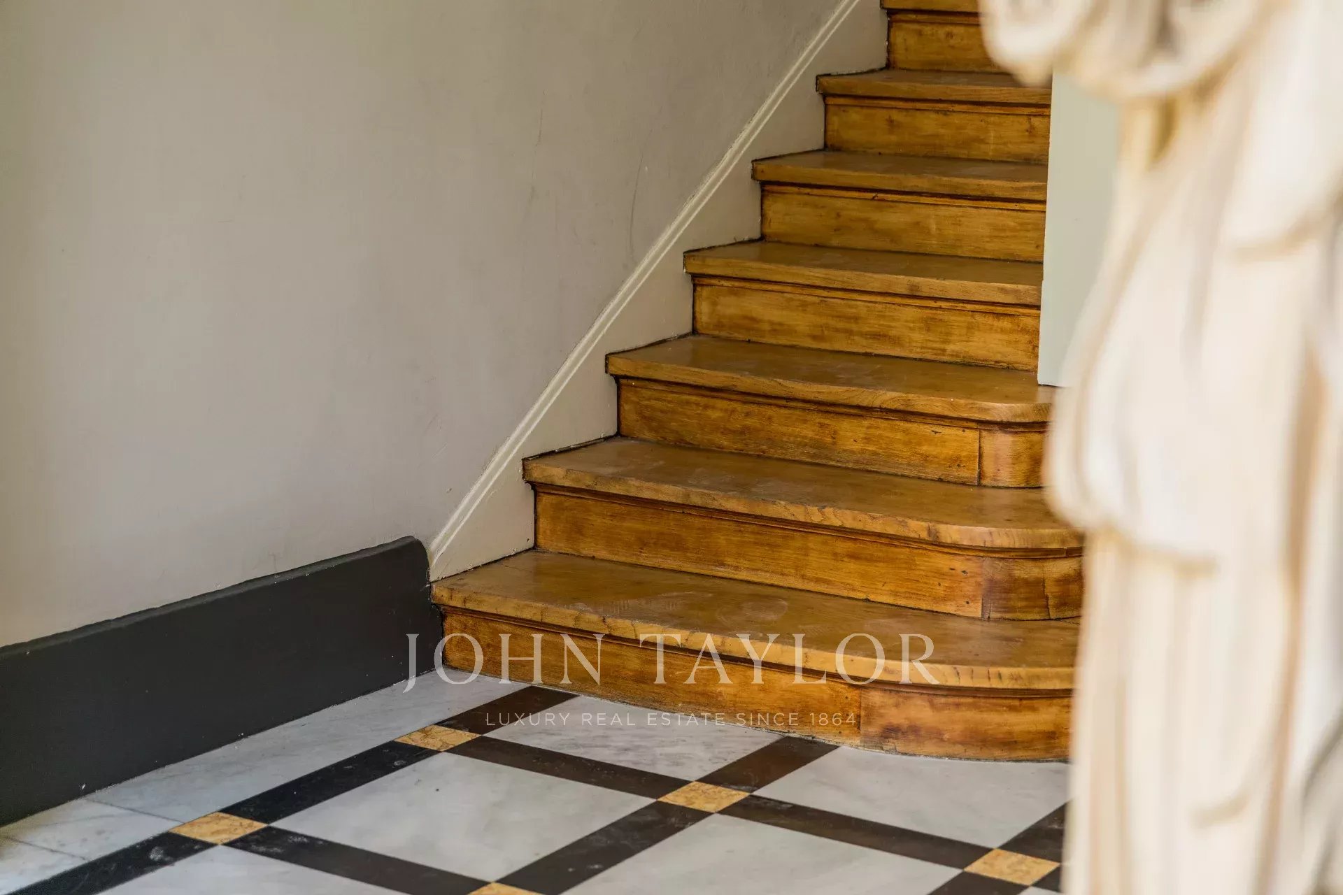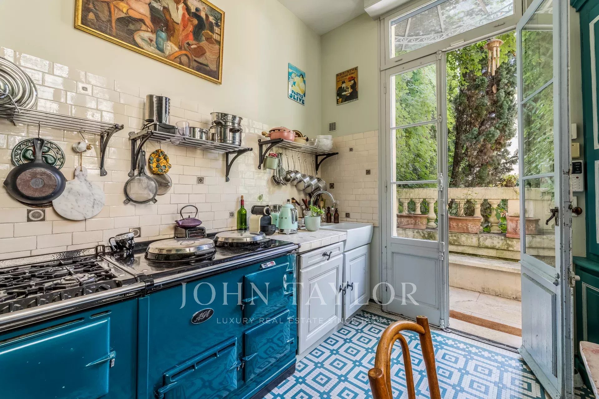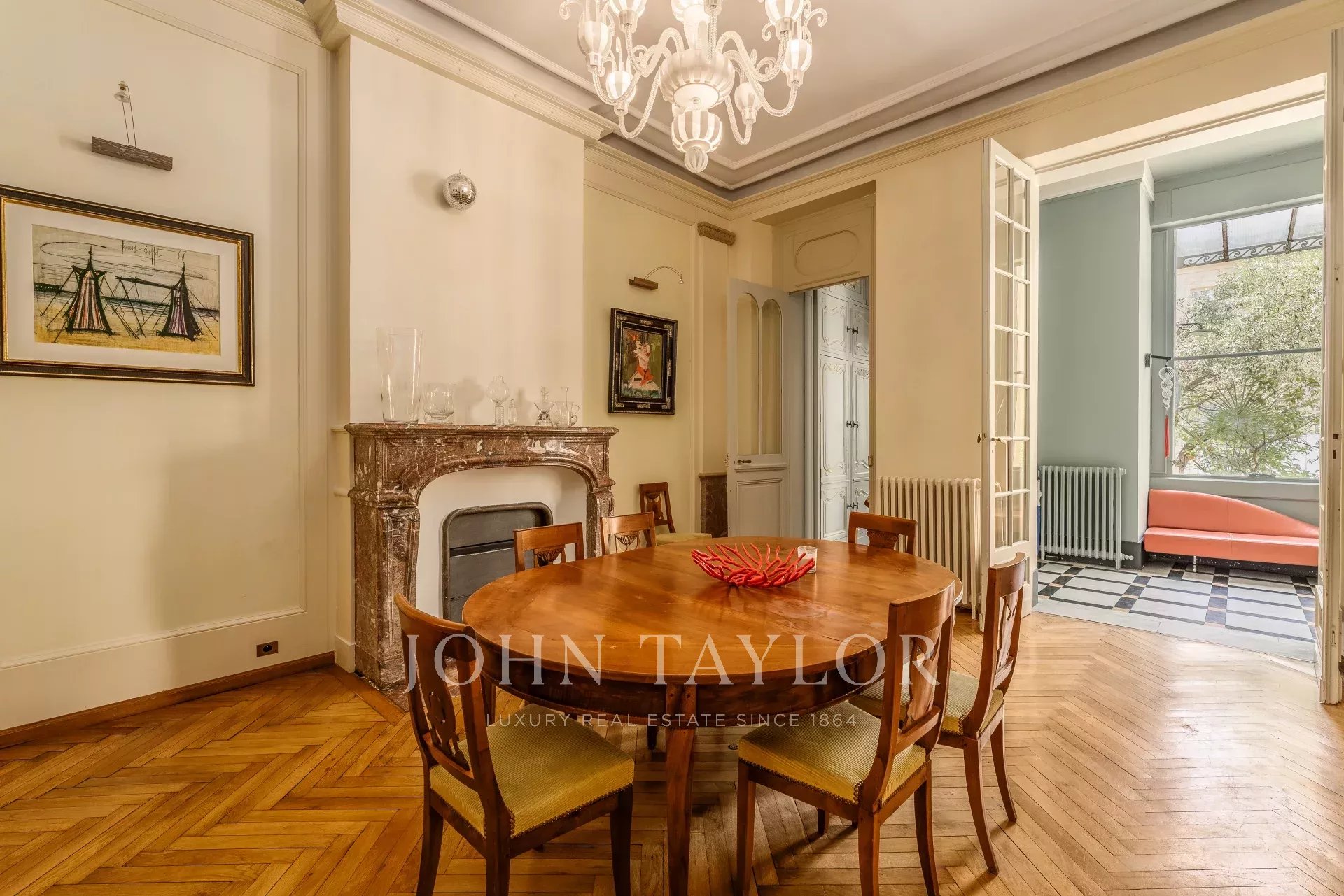 Erhaltene antike Ausstattung: Steinfassade, Kamine, Parkett, Zementfliesen, Zierleisten, Wandgesimse und Buntglasfenster. Absolute Ruhe und ideale Raumaufteilung für ein Familienleben.