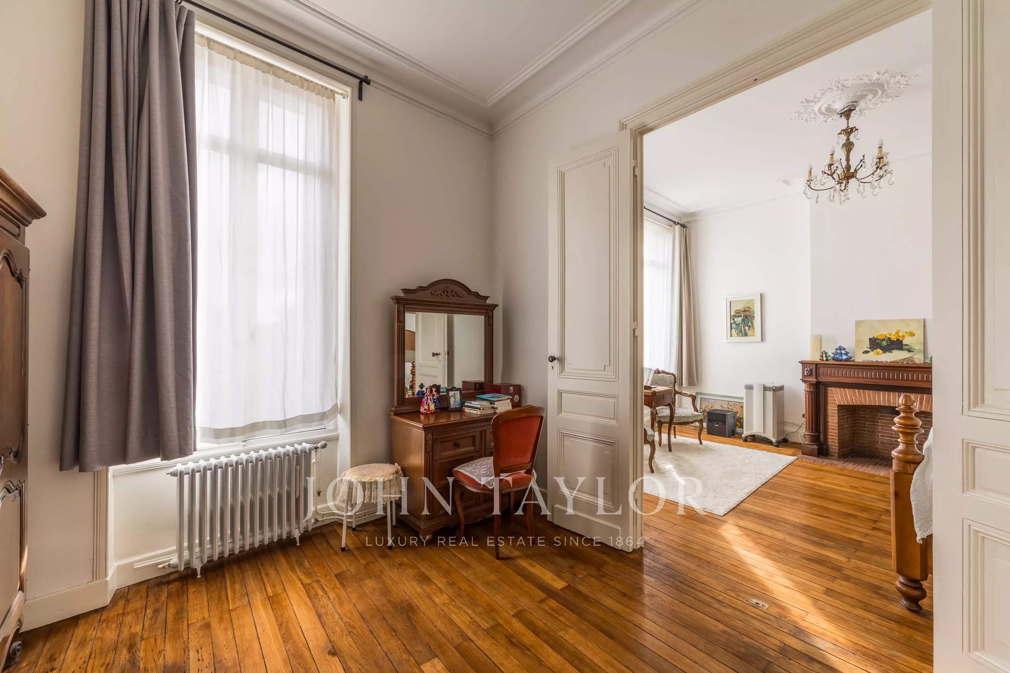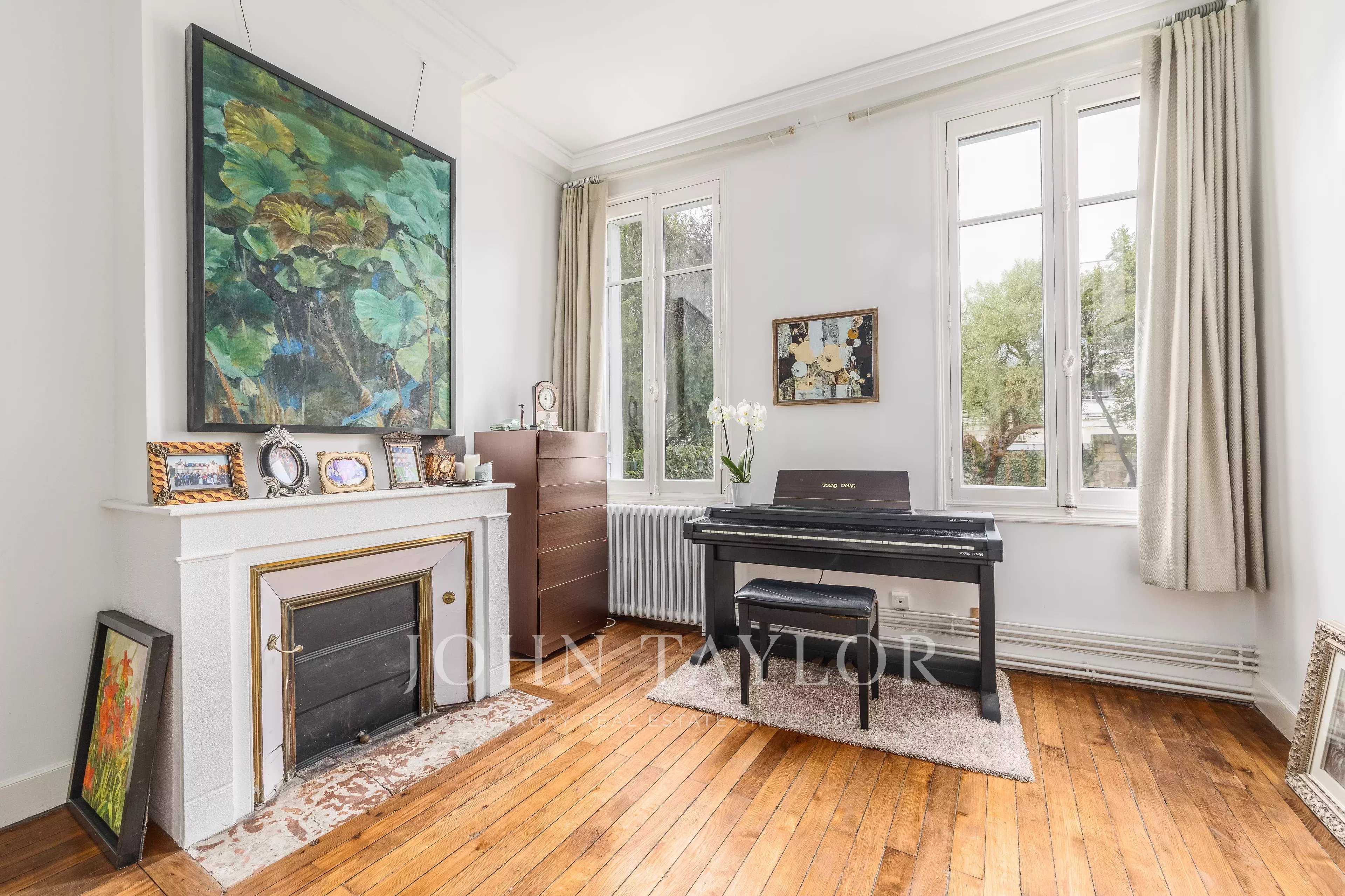 Eine breite und prächtige Treppe aus der Epoche, die von einem schönen Oberlicht unter einem Glasdach beleuchtet wird, führt Sie zu den beiden Etagen: helle Mastersuite mit eigenem Bad, vier Schlafzimmer, zwei weitere Badezimmer und ein separates Apartment mit offener Küche, ideal für einen Studenten oder einen Teenager. Eine geräumige Waschküche und ein schöner Keller von 30 m² vervollständigen das Ensemble.