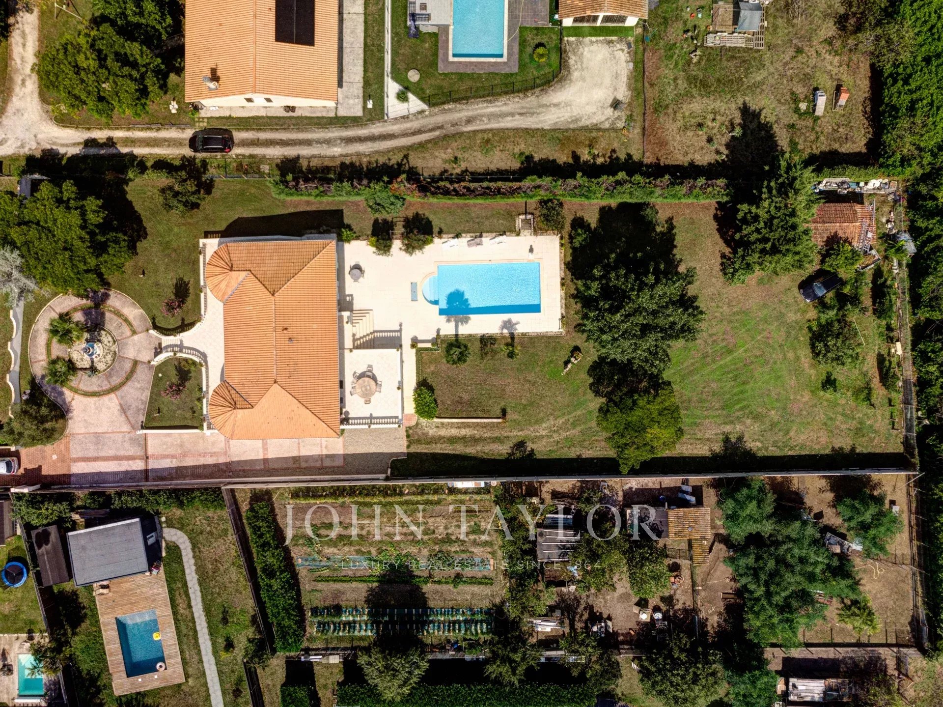 Der Außenbereich bietet einen ruhigen, uneinsehbaren Garten mit Pool, ein bebaubares Grundstück am Ende des Grundstücks und einen überdachten Bereich für zwei Fahrzeuge.