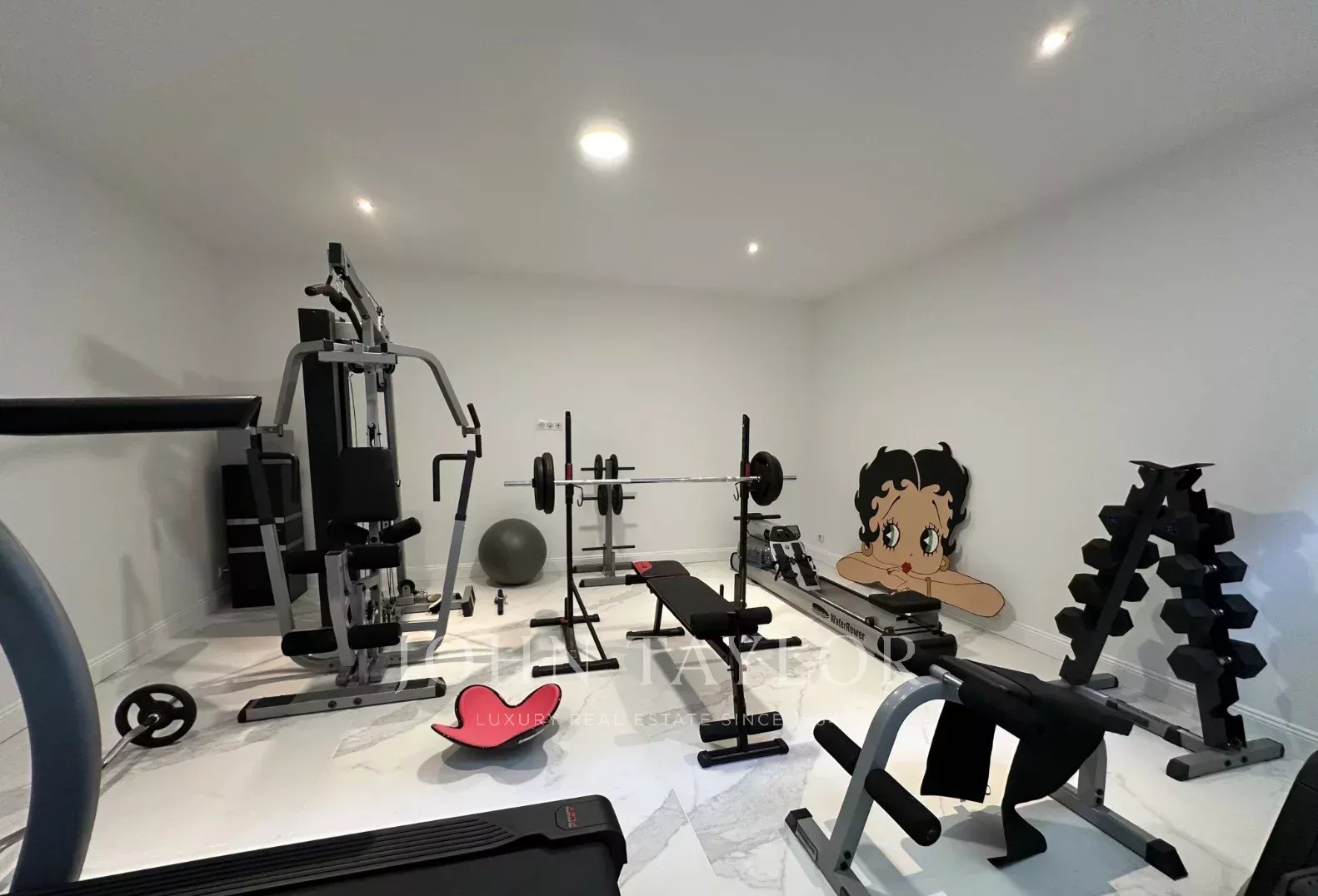 Im Erdgeschoss befinden sich außerdem ein Fitnessraum, ein Büro und eine Suite, die aus einem Schlafzimmer mit eigenem Badezimmer besteht.