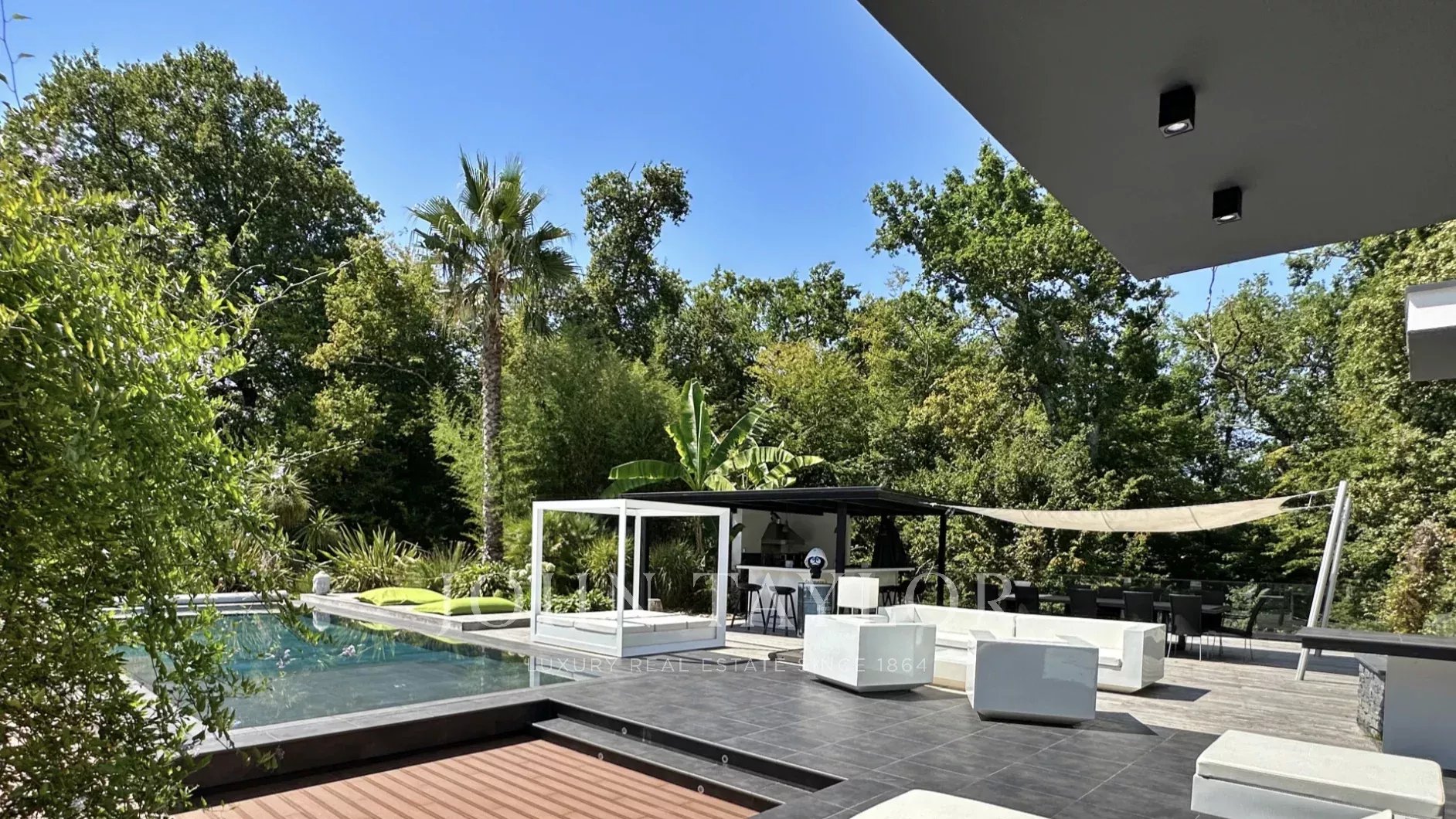 Die Außenanlagen stehen der Villa in nichts nach: eine große Terrasse mit Sommerküche, ein Bouleplatz und ein wunderschöner 11 x 4 m großer beheizter Spiegelpool, der den Wald überragt und Momente der Entspannung in absoluter Privatsphäre bietet.