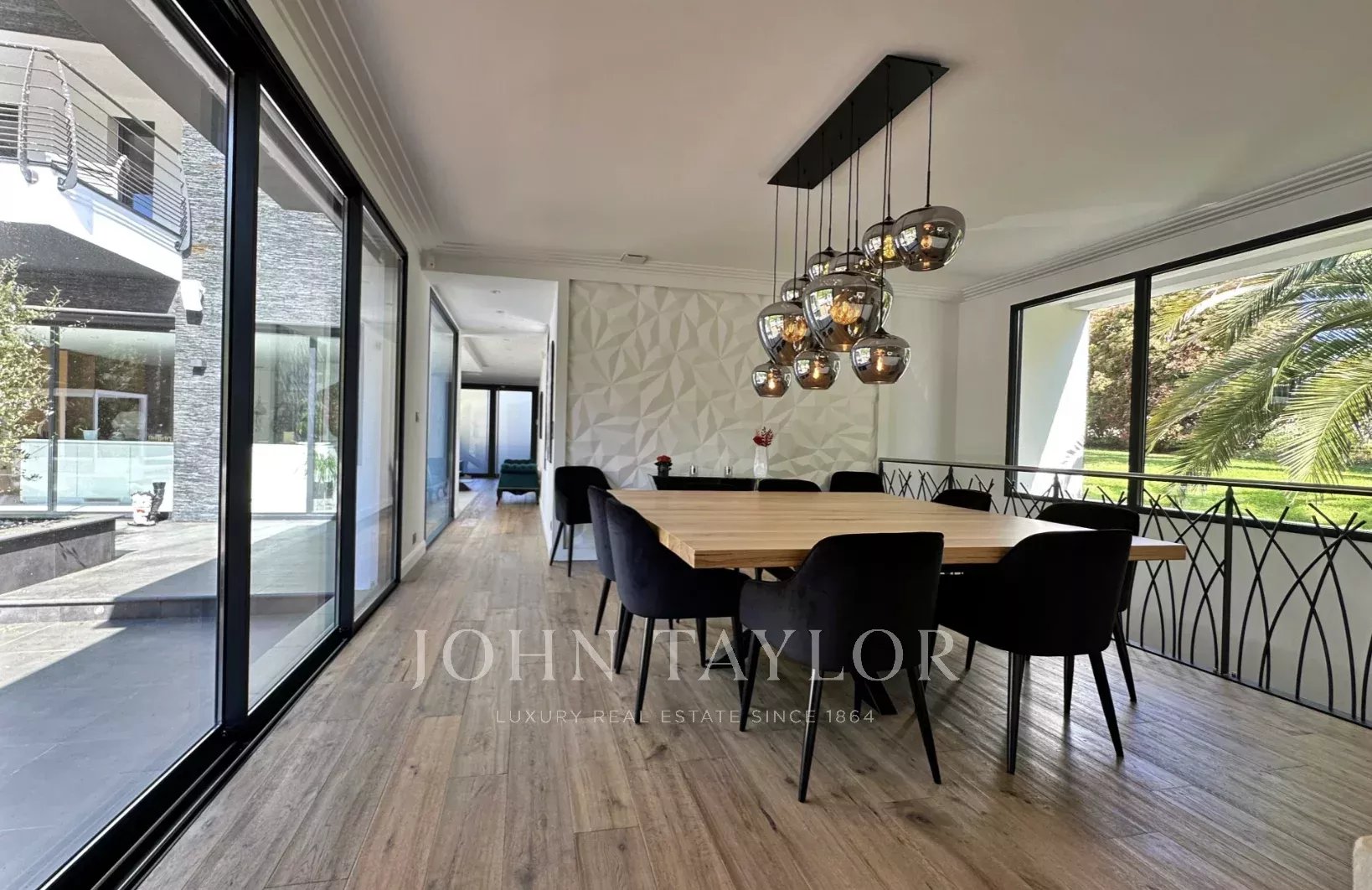 Schon beim Betreten des Hauses wird der Ton angegeben: großzügige Volumen, raffinierte Ausführungen und hochwertige Leistungen. Die Villa bietet eine große, voll ausgestattete Essküche, die durch eine zweite, unabhängige Küche ergänzt wird. Das Esszimmer dominiert ein spektakuläres Wohnzimmer von fast 90 m² mit Kamineinsatz, das durch eine hohe Decke hervorgehoben wird, die dem Ganzen eine warme und elegante Atmosphäre verleiht.
