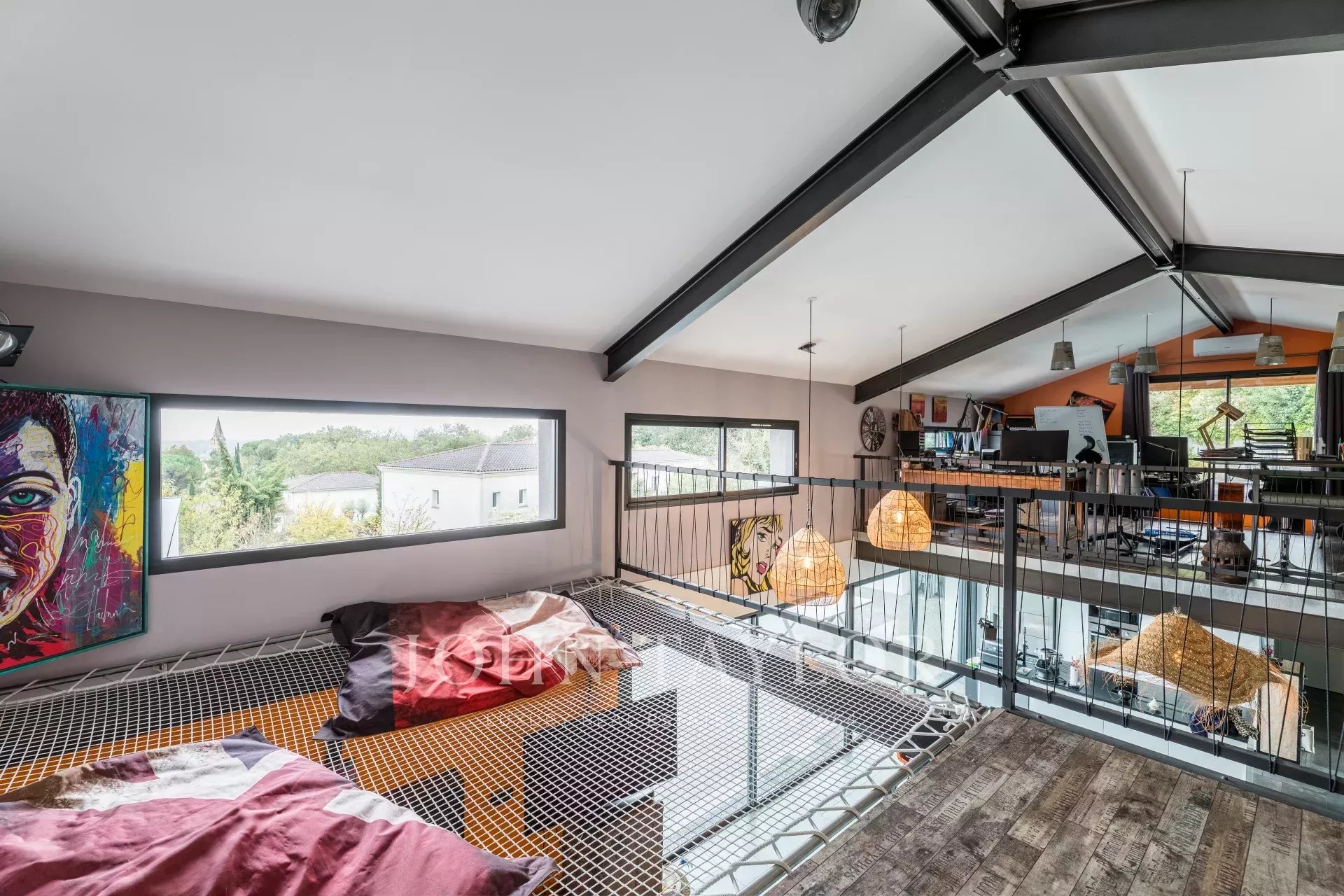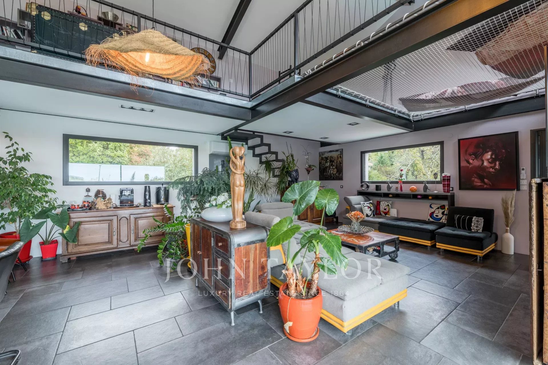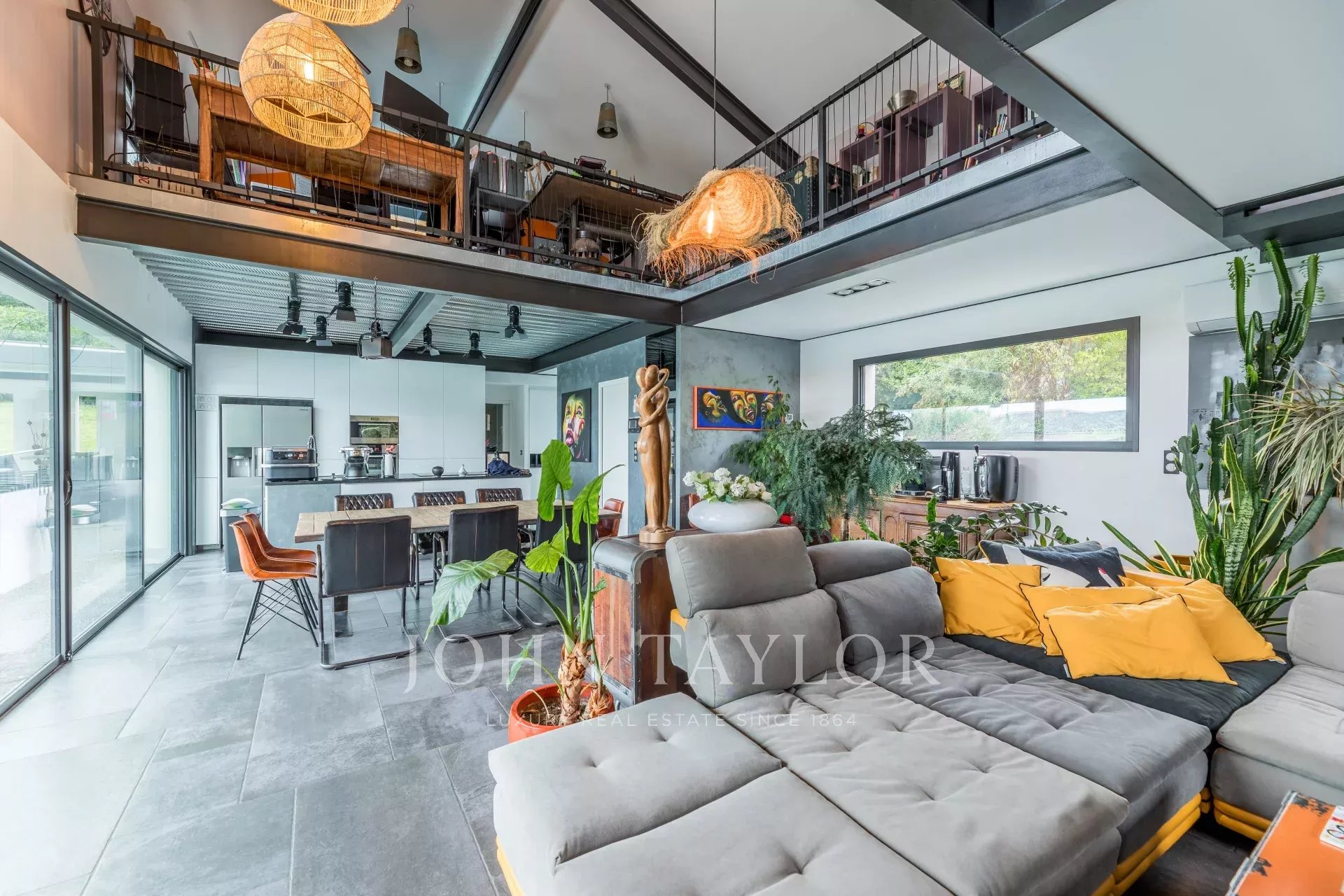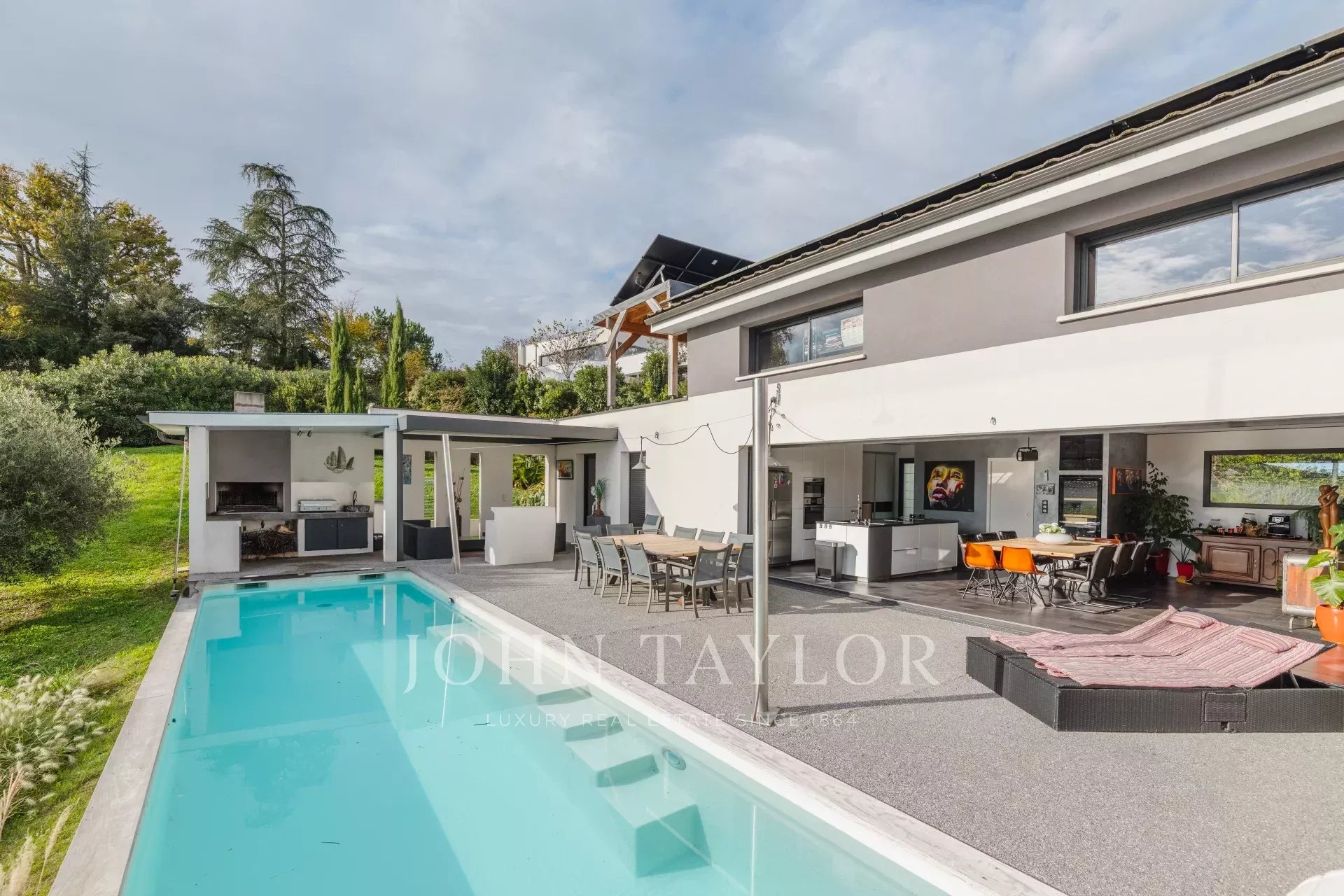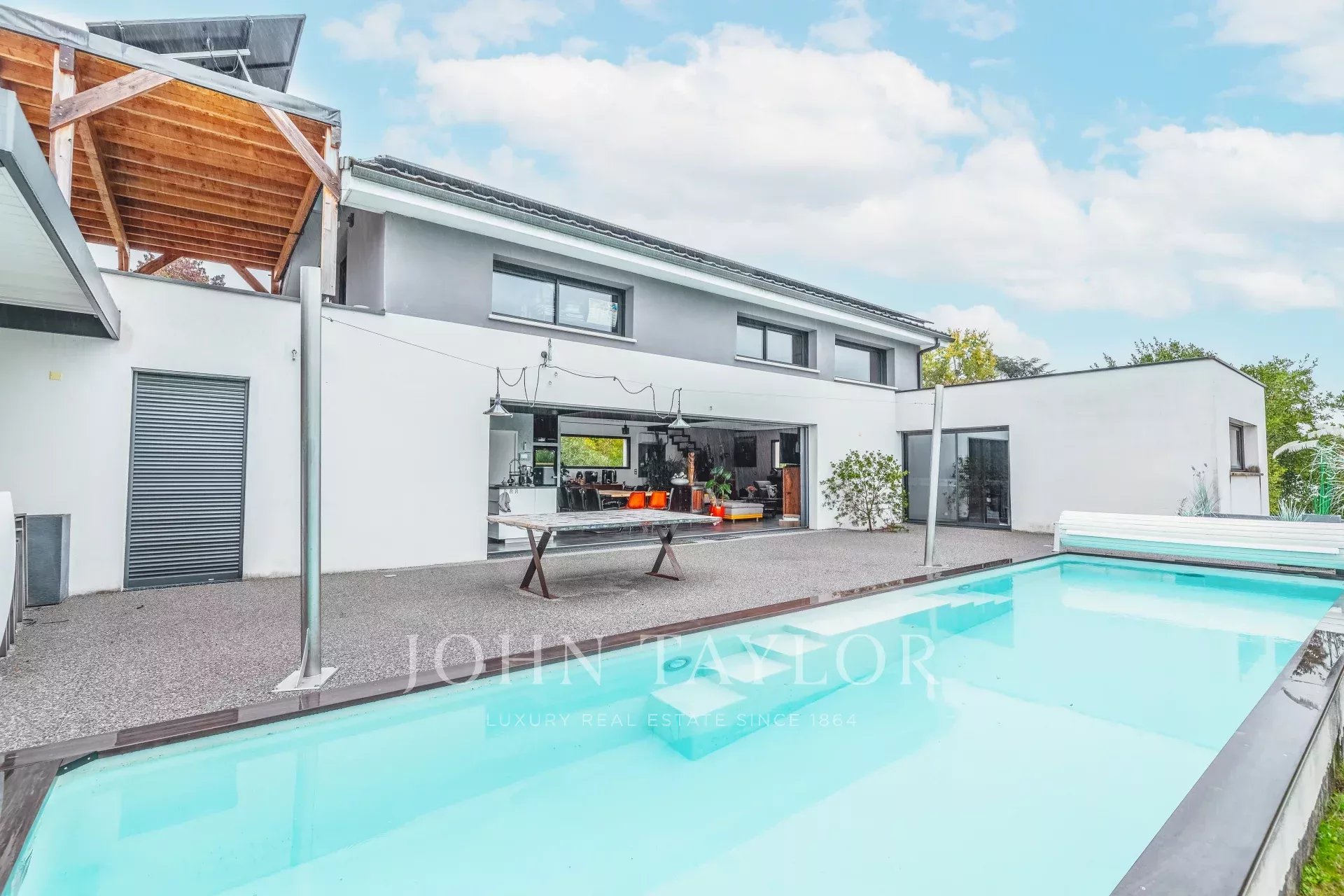 Fertiggestellt im Jahr 2014, verkörpert dieses moderne Haus eine perfekte Verbindung zwischen mutigem architektonischem Design und Funktionalität. Mit einer Gesamtfläche von 270 m² (220 m² Wohnfläche) liegt es eingebettet in einem gepflegten Grundstück von 1288 m². Jedes Detail wurde mit Sorgfalt durchdacht, um Ästhetik, Komfort und Langlebigkeit zu vereinen.