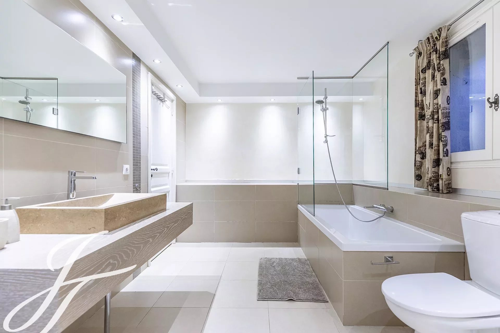 Ein gemeinsames Badezimmer (Badewanne, Waschbecken, WC)