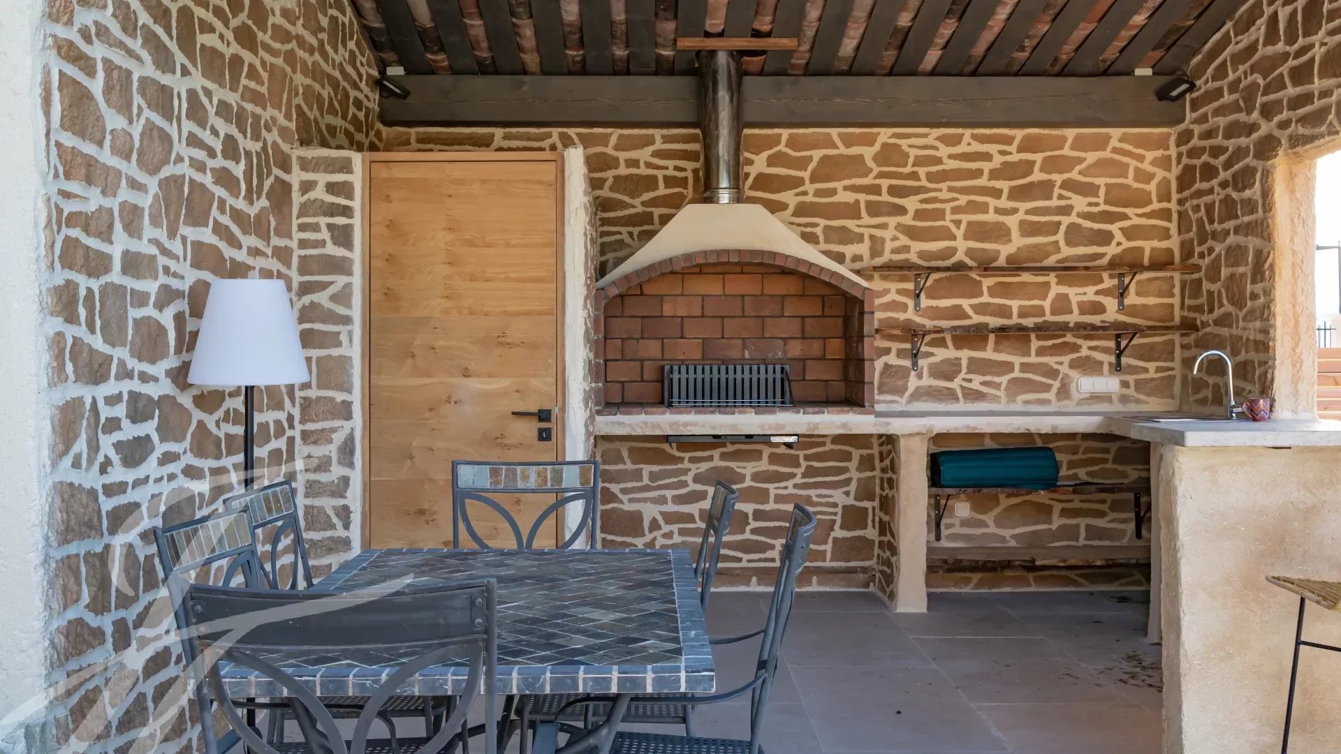 Swimmingpool, Liegestühle, ausgestattetes Poolhaus, Grill, Esstisch im Freien.
