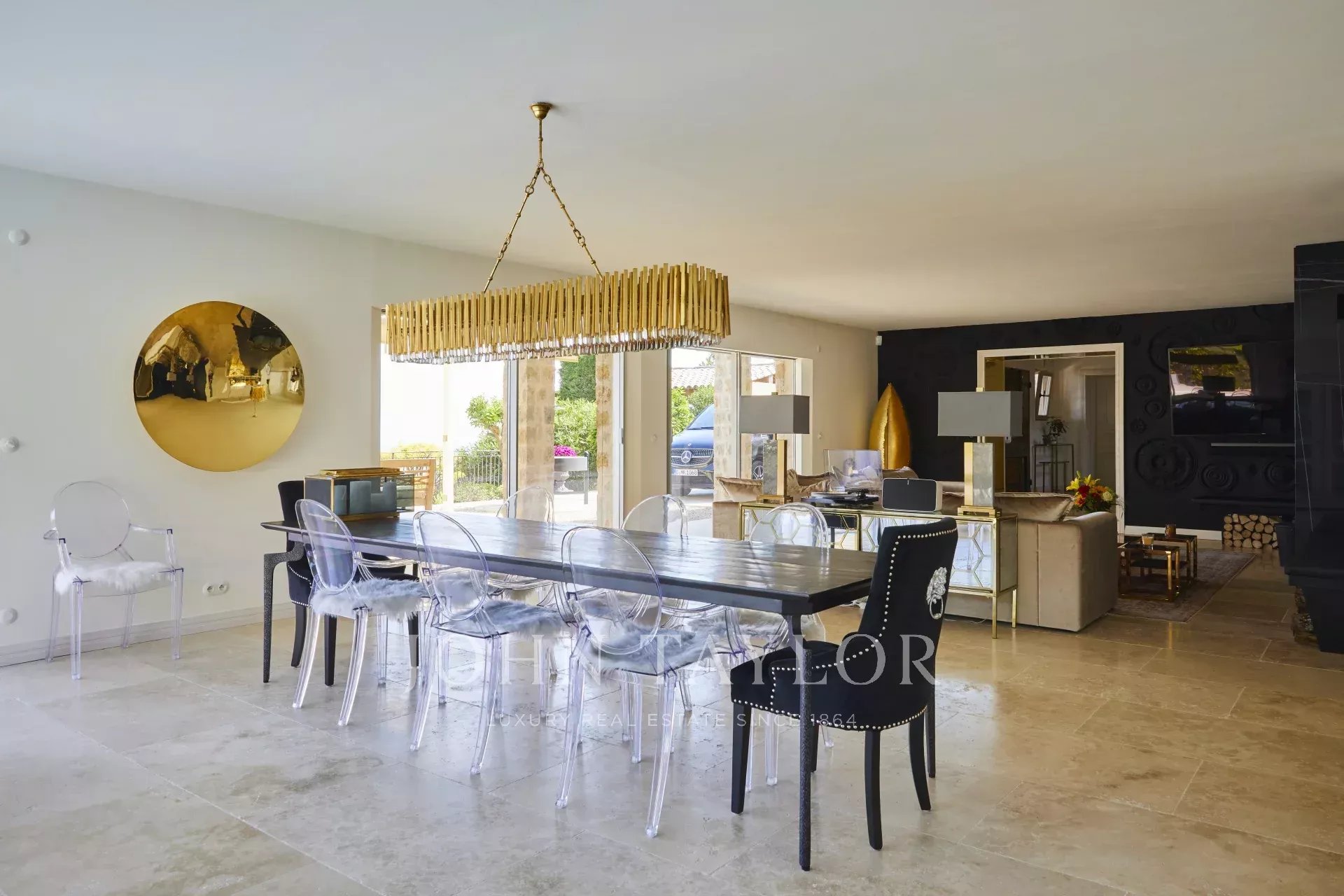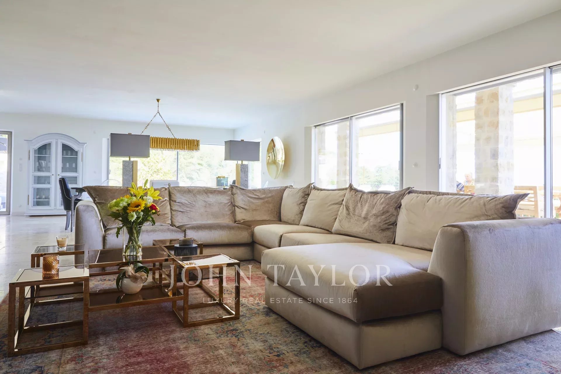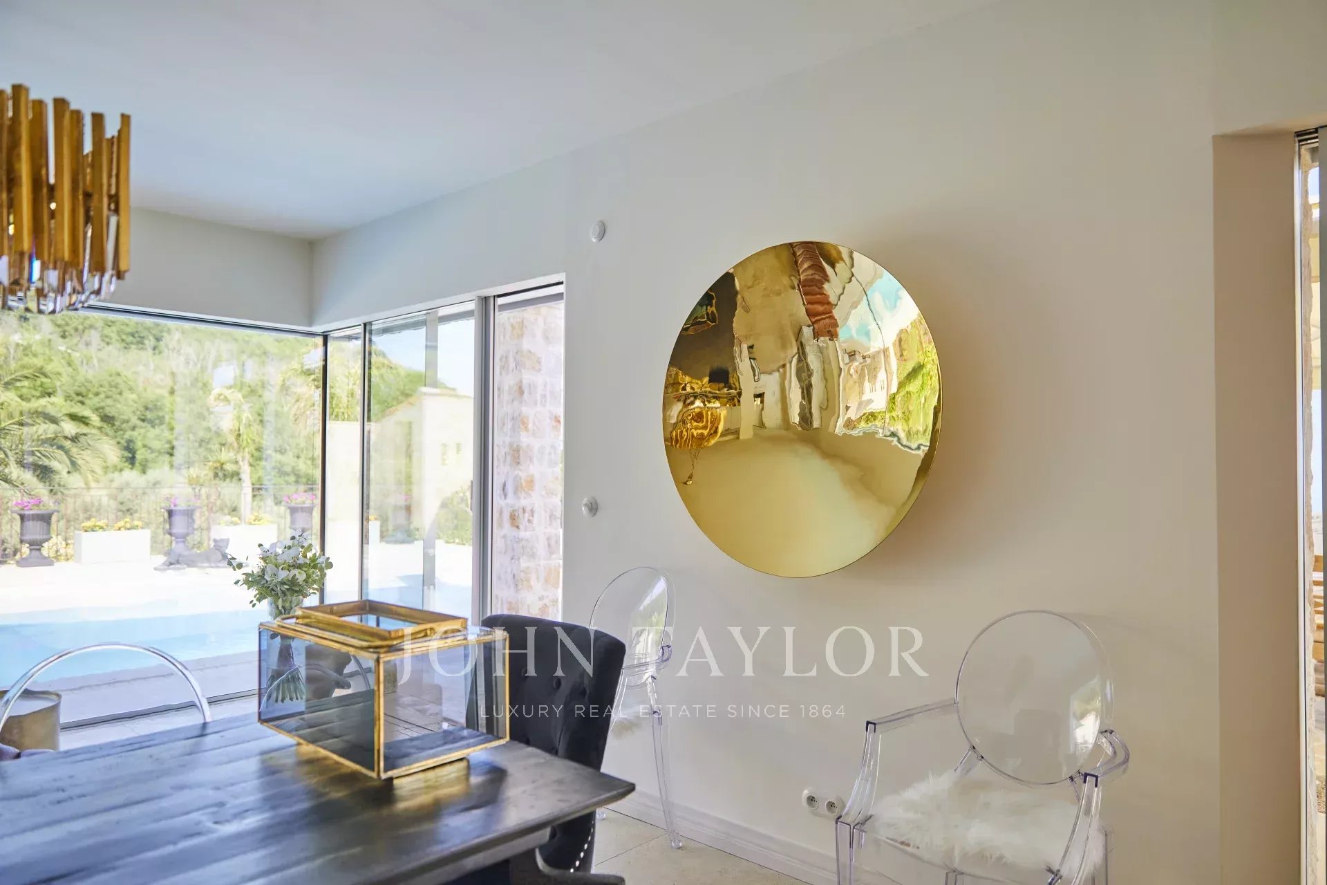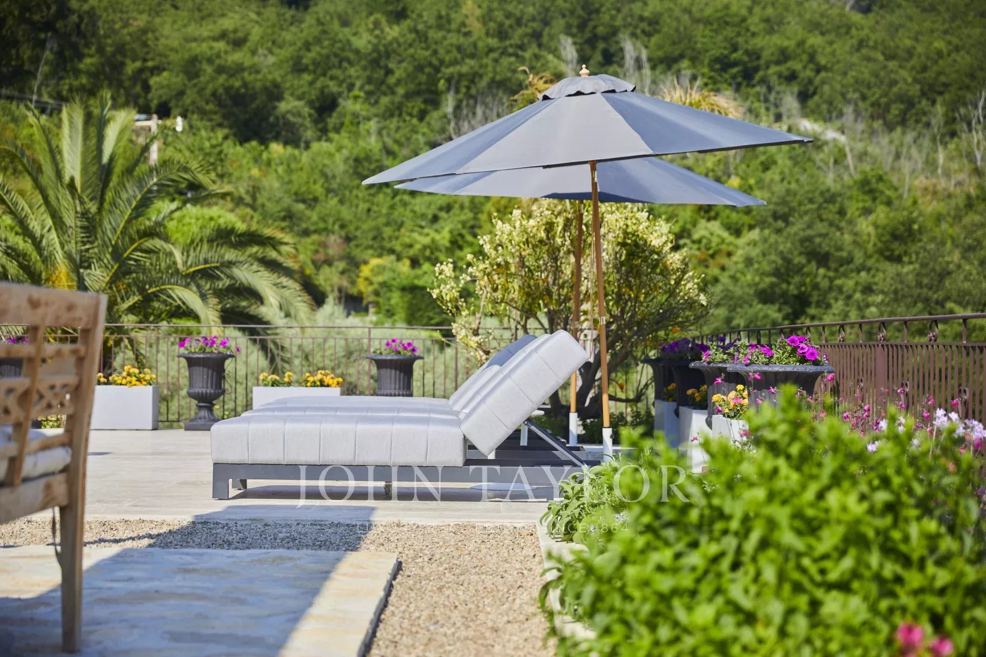 Außen gibt es eine große Terrasse mit Essbereich, beheiztem Pool und Außendusche. Ein bewaldeter Garten mit Bouleplatz und vielen Olivenbäumen.
