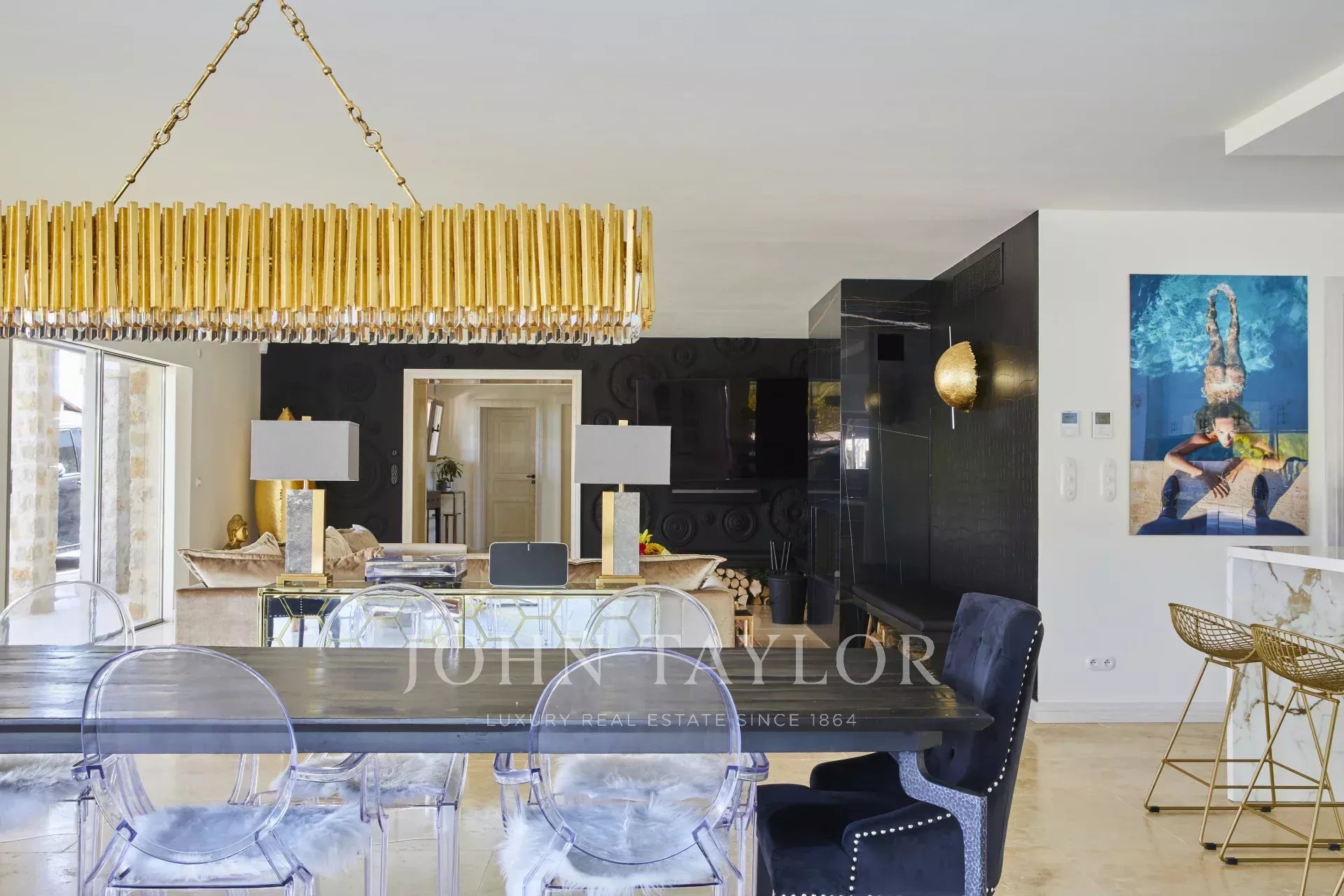 Im Erdgeschoss befindet sich ein schöner Wohnbereich mit Wohnzimmer, ausgestattet mit einem Fernseher, Sonos-Soundsystem, Holzofen. Das Wohnzimmer ist lichtdurchflutet mit einem wunderschönen Glaswinkel und ist in Verlängerung der voll ausgestatteten Küche mit zentraler Insel.
