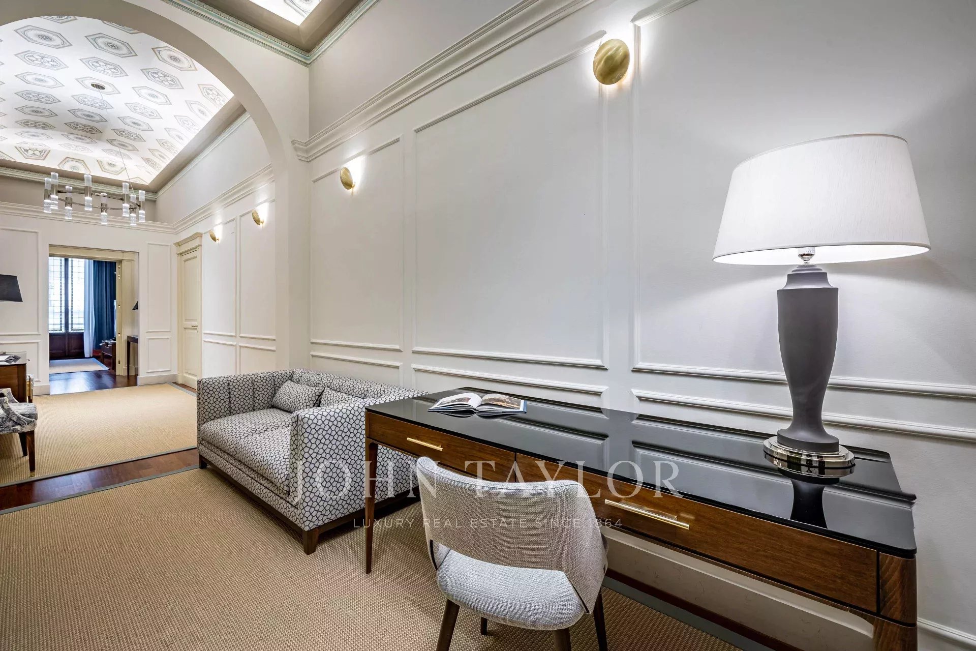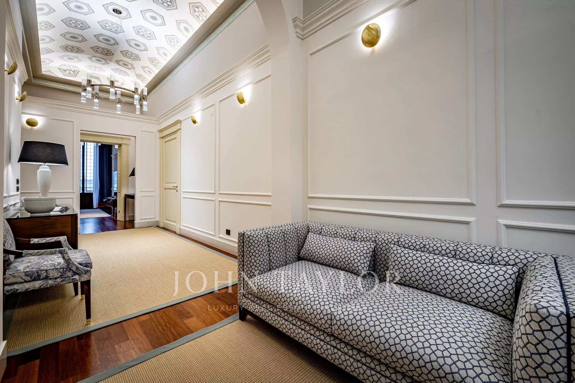 Im Inneren ist der geräumige Wohnbereich mit Originalfresken und majestätischen Kassettendecken ausgestattet. Die moderne Küche bietet einen direkten Zugang zum Balkon, ergänzt durch zwei große Schlafzimmer, vier Bäder und eine praktische Waschküche.