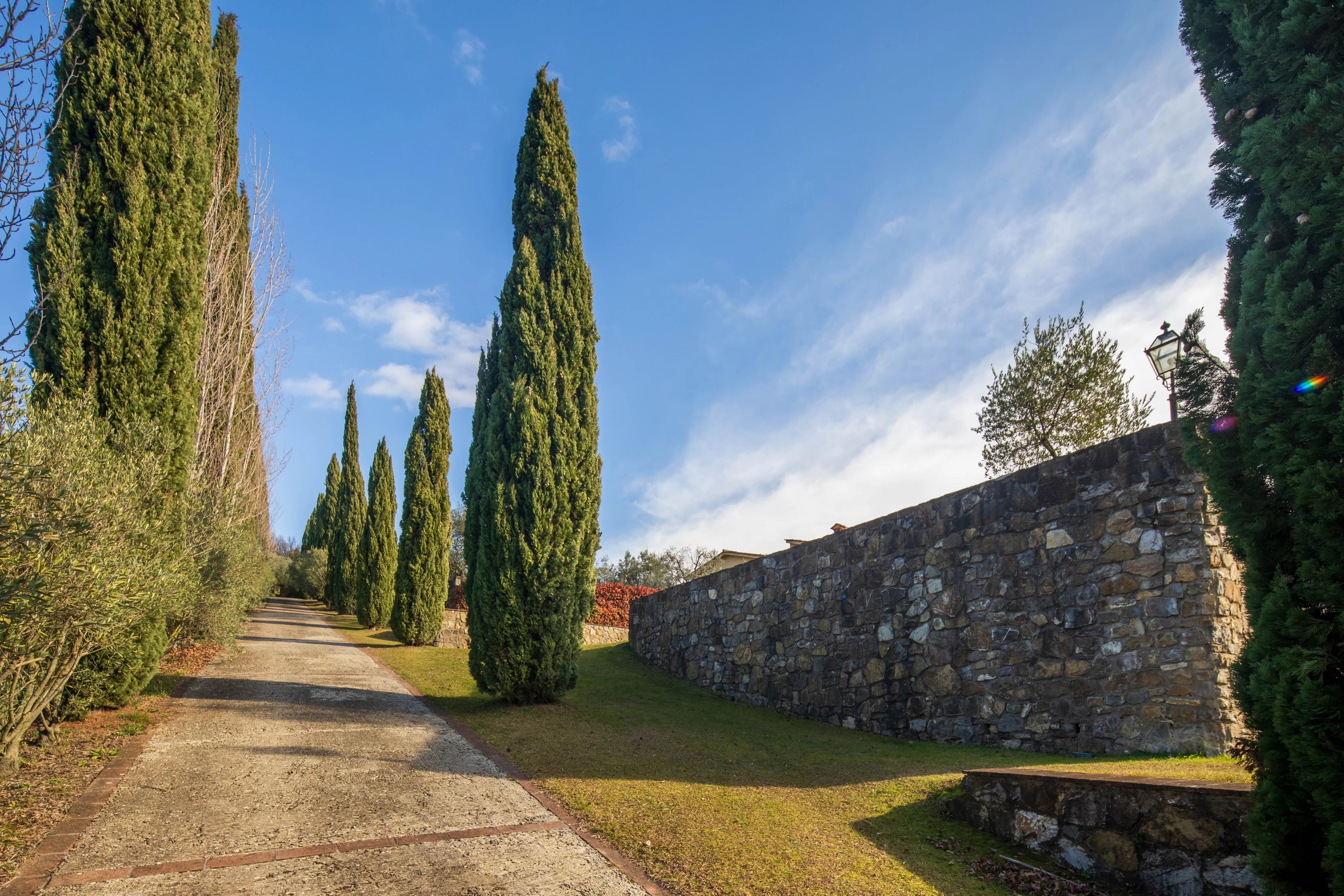 Der Park erstreckt sich über etwa fünf Hektar, die in Terrassen mit Olivenbäumen, Bäumen und Blumensorten unterteilt sind, die dem natürlichen Verlauf des Geländes folgen. Ein Teil des Anwesens ist mit Weinreben bepflanzt, aus denen jedes Jahr ein Wein hergestellt wird, der ein authentischer Ausdruck des Gebiets von Carmignano ist.