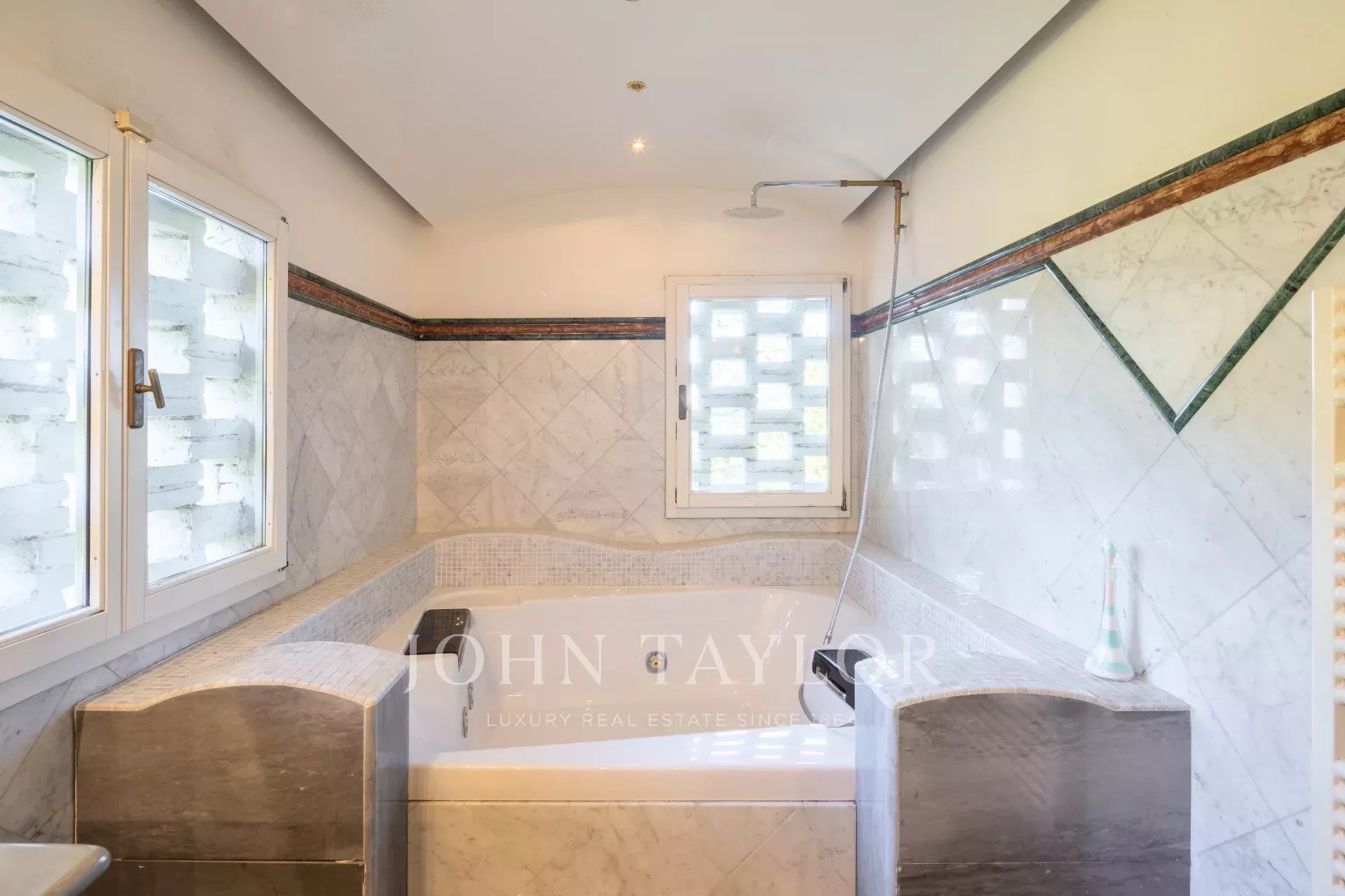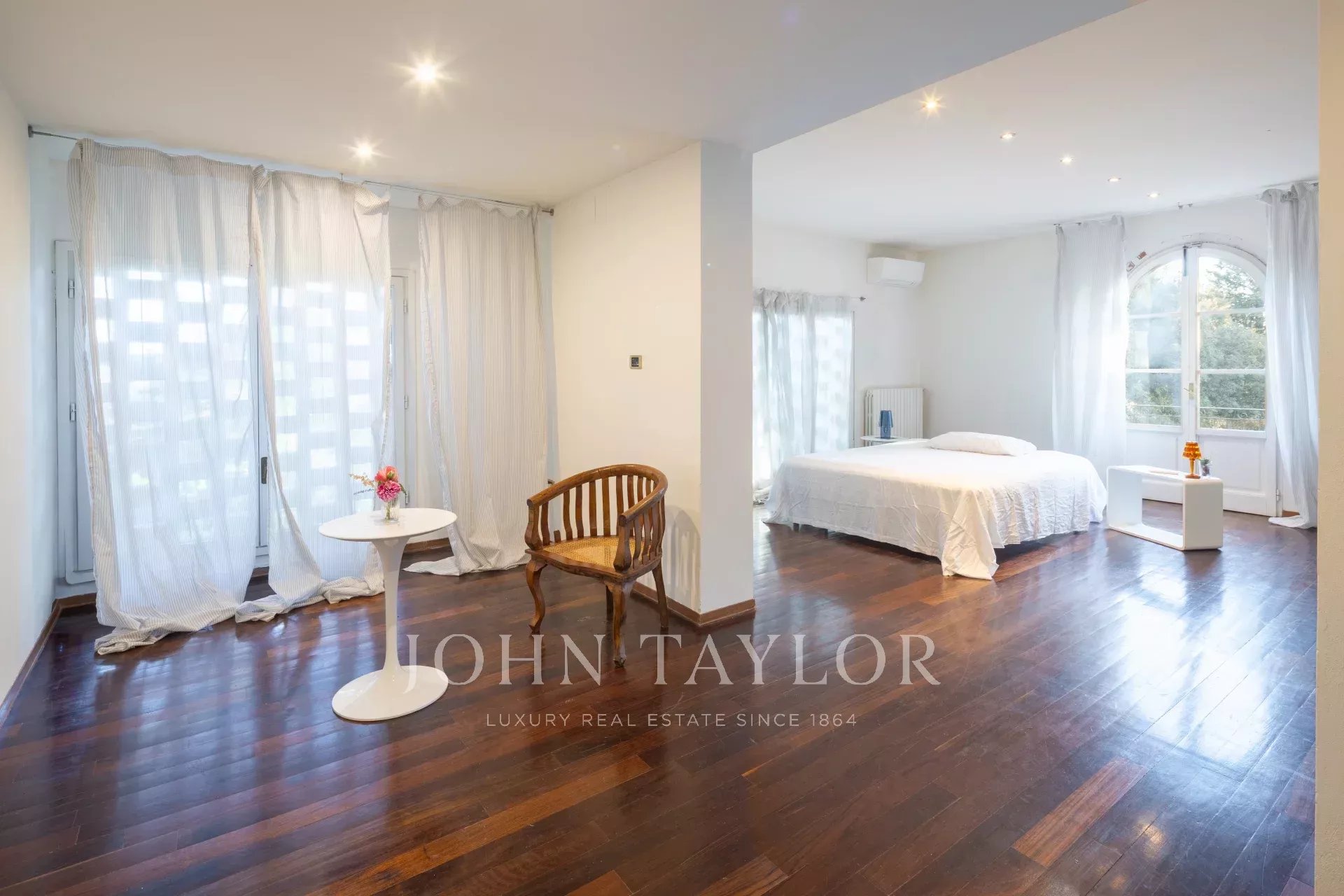 Die Villa verfügt über insgesamt 5 Schlafzimmer und 4 Bäder, eine geräumige Einbauküche, ein Esszimmer mit Kamin und Keller, zwei Wohnzimmer - eines mit großem Kamin und das andere mit Blick auf den Garten - sowie ein Gästebad im Erdgeschoss. Die Küche geht nahtlos in einen großzügigen Innenhof über, der einen idealen Platz für Versammlungen bietet.