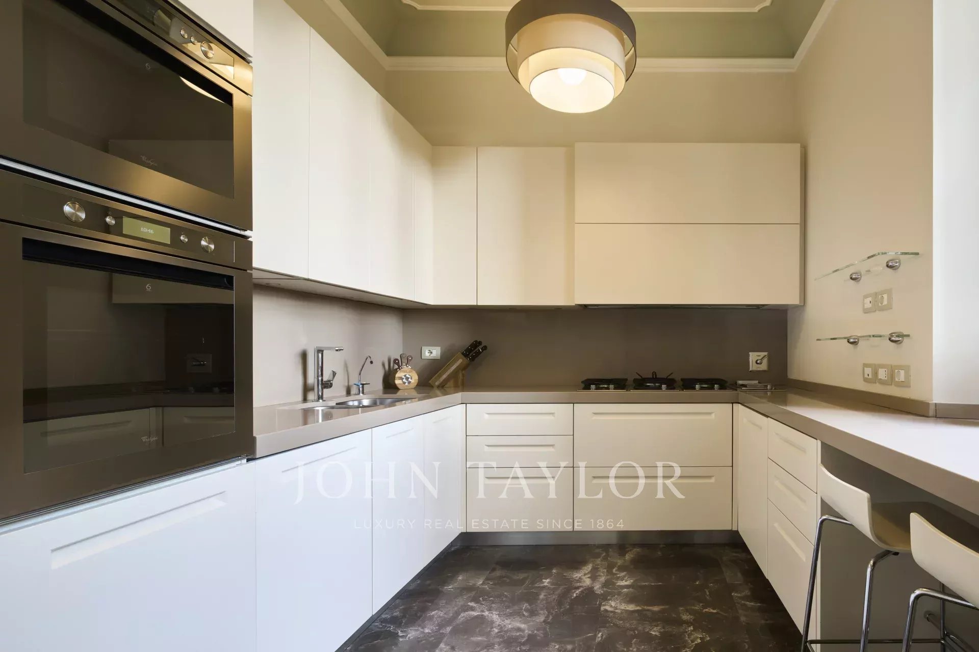 Die Wohnung verfügt über ein helles Doppelwohnzimmer mit Kamin, einen eleganten Essbereich und eine moderne Küche, die mit modernsten Geräten und einem Wasserfiltersystem ausgestattet ist.