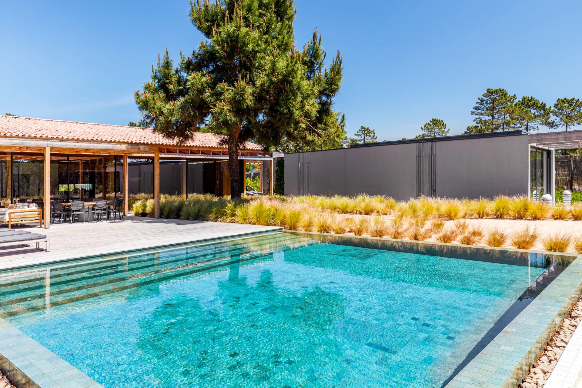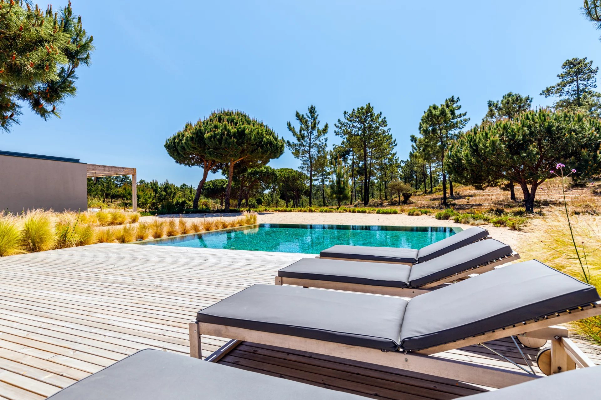 Im Außenbereich bietet ein beheizter Salzwasser-Pool den perfekten Rückzugsort, und auf Wunsch stehen Grill und Tischtennisplatte zur Verfügung. Sonnenuntergänge über den umliegenden Pinienwäldern vervollständigen die ruhige Atmosphäre der Villa.
