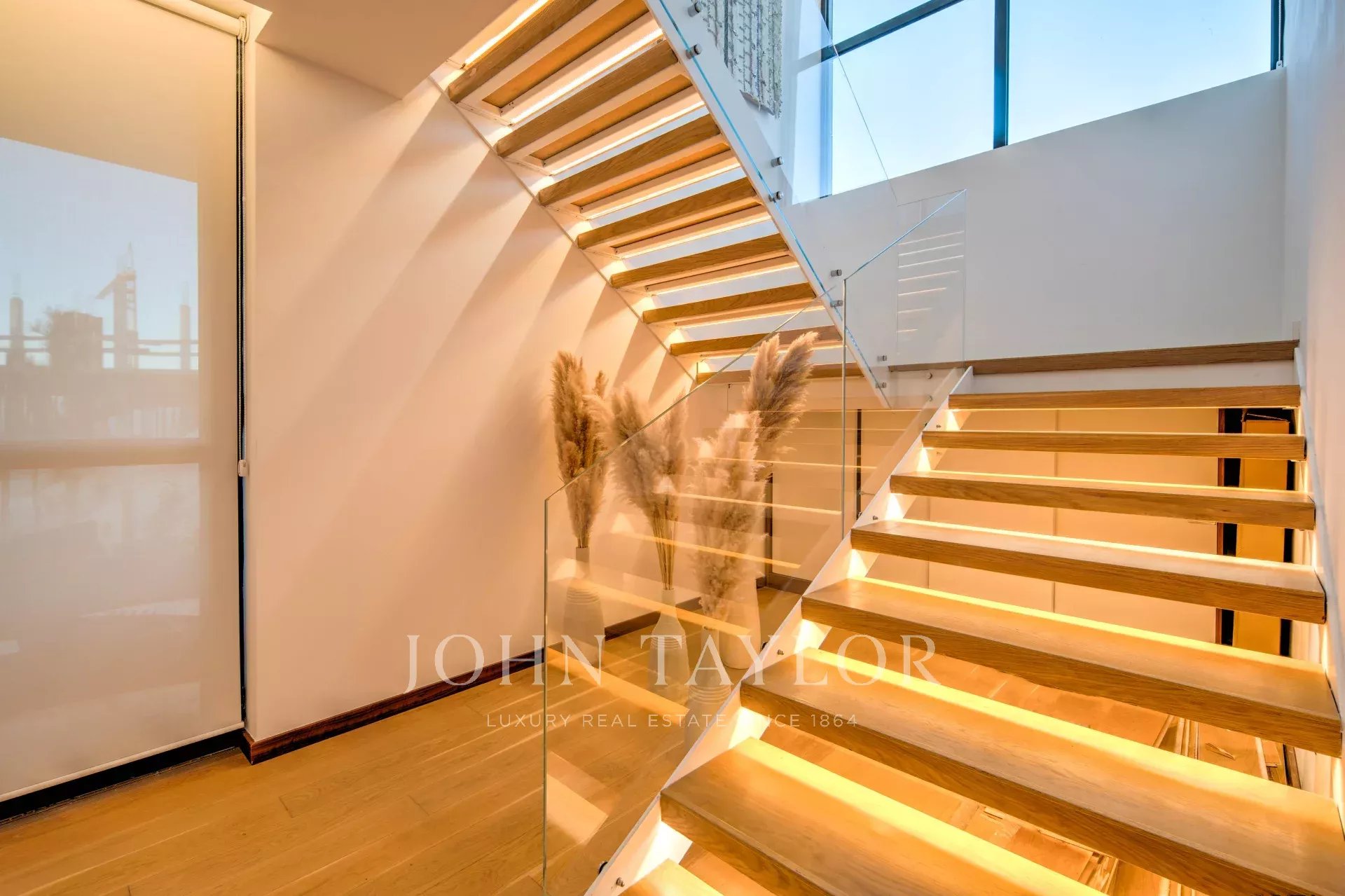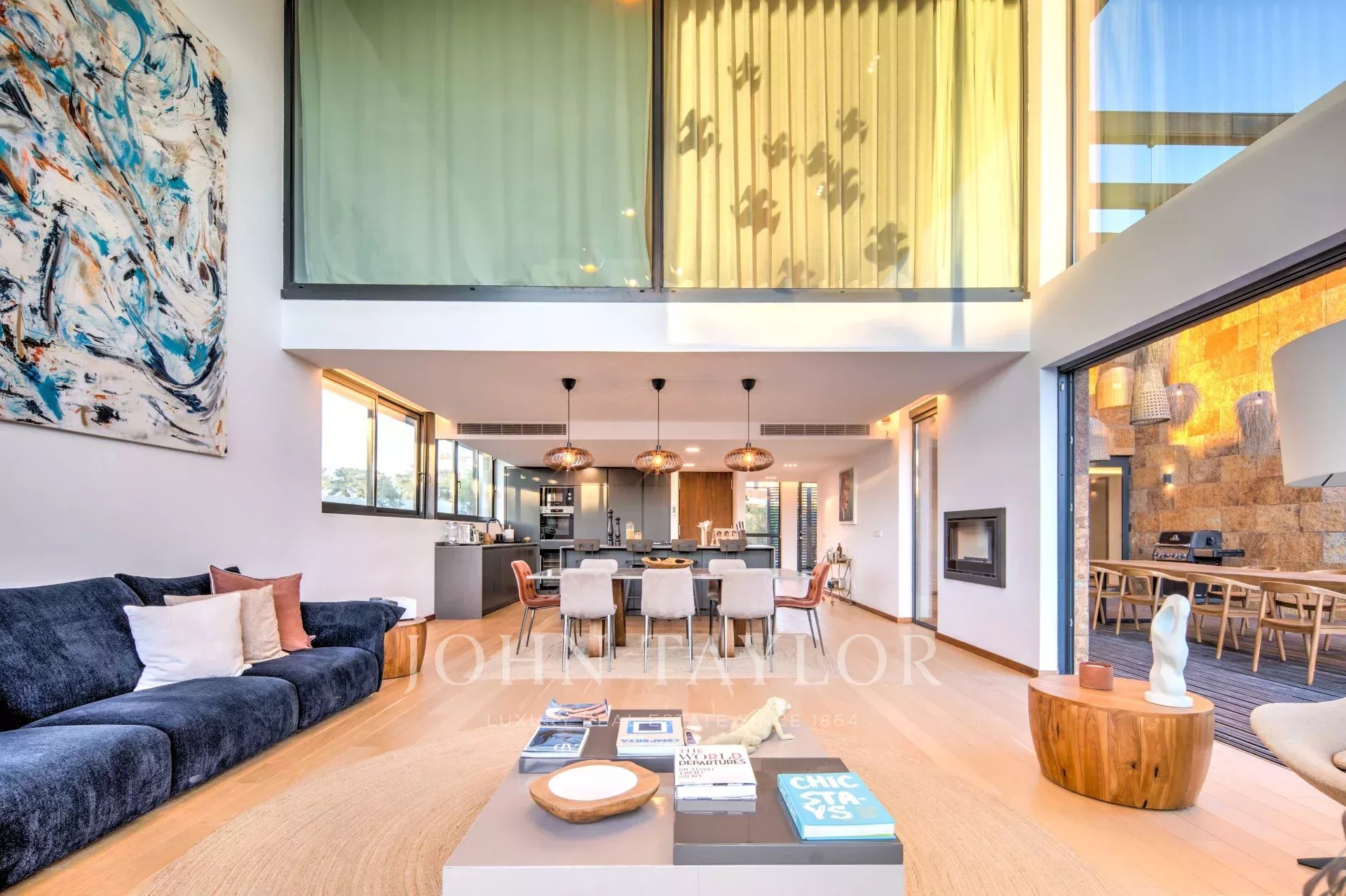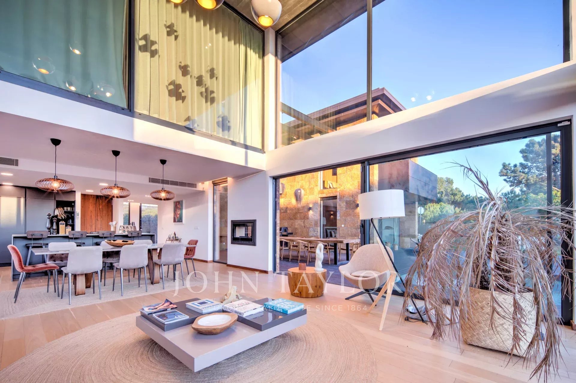 Im Inneren sind die Räume hell, geräumig und geschmackvoll eingerichtet und verbinden Komfort mit raffiniertem Stil. Der offene Wohn- und Küchenbereich geht mühelos in eine Holzterrasse über, auf der Sie im Freien speisen, ein Sonnenbad nehmen oder den beheizten Swimmingpool genießen können.