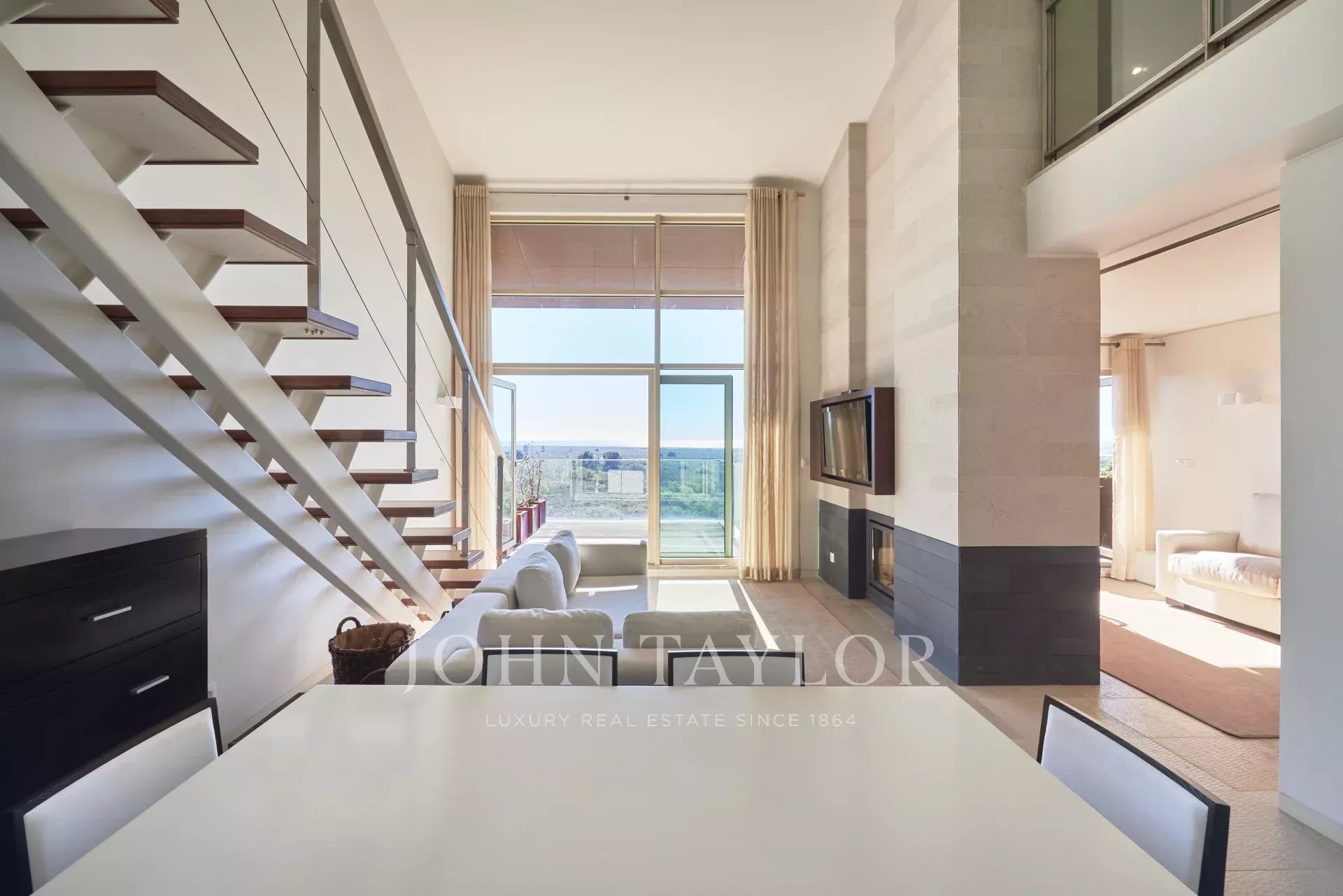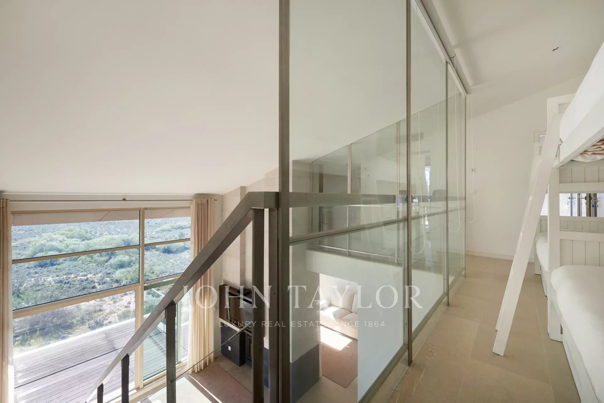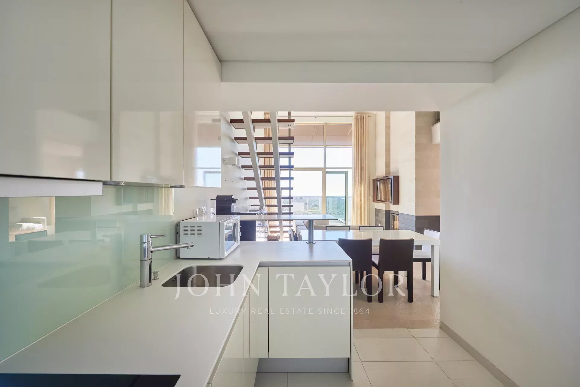 Die obere Etage verfügt über ein Zwischengeschoss mit einem Wohnbereich, ein Badezimmer und eine private Terrasse mit Whirlpool. In der unteren Etage gibt es eine voll ausgestattete Küche, ein Wohnzimmer, eine Suite und ein Gästebad.