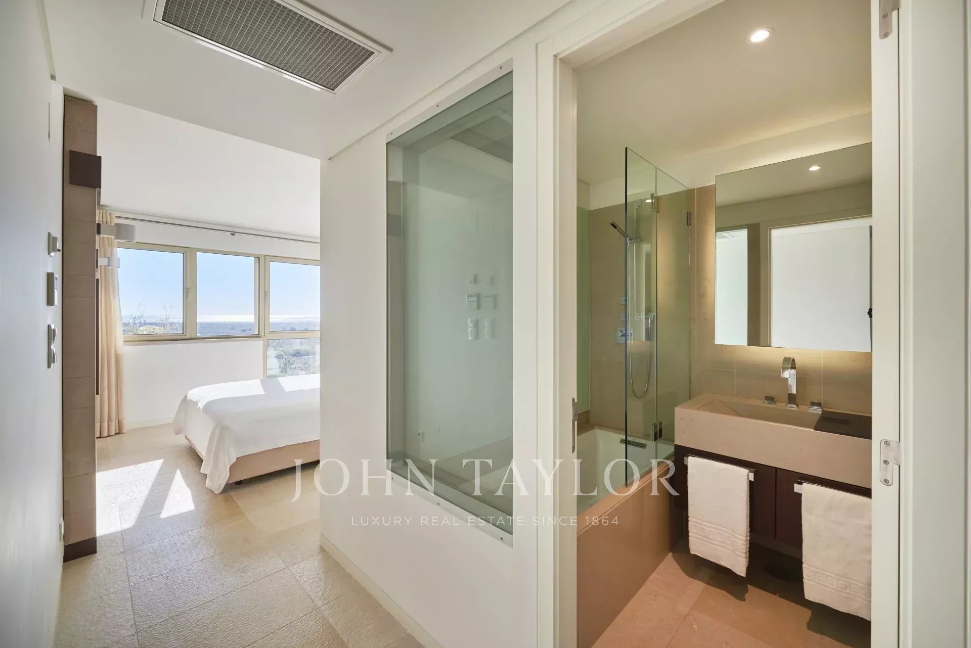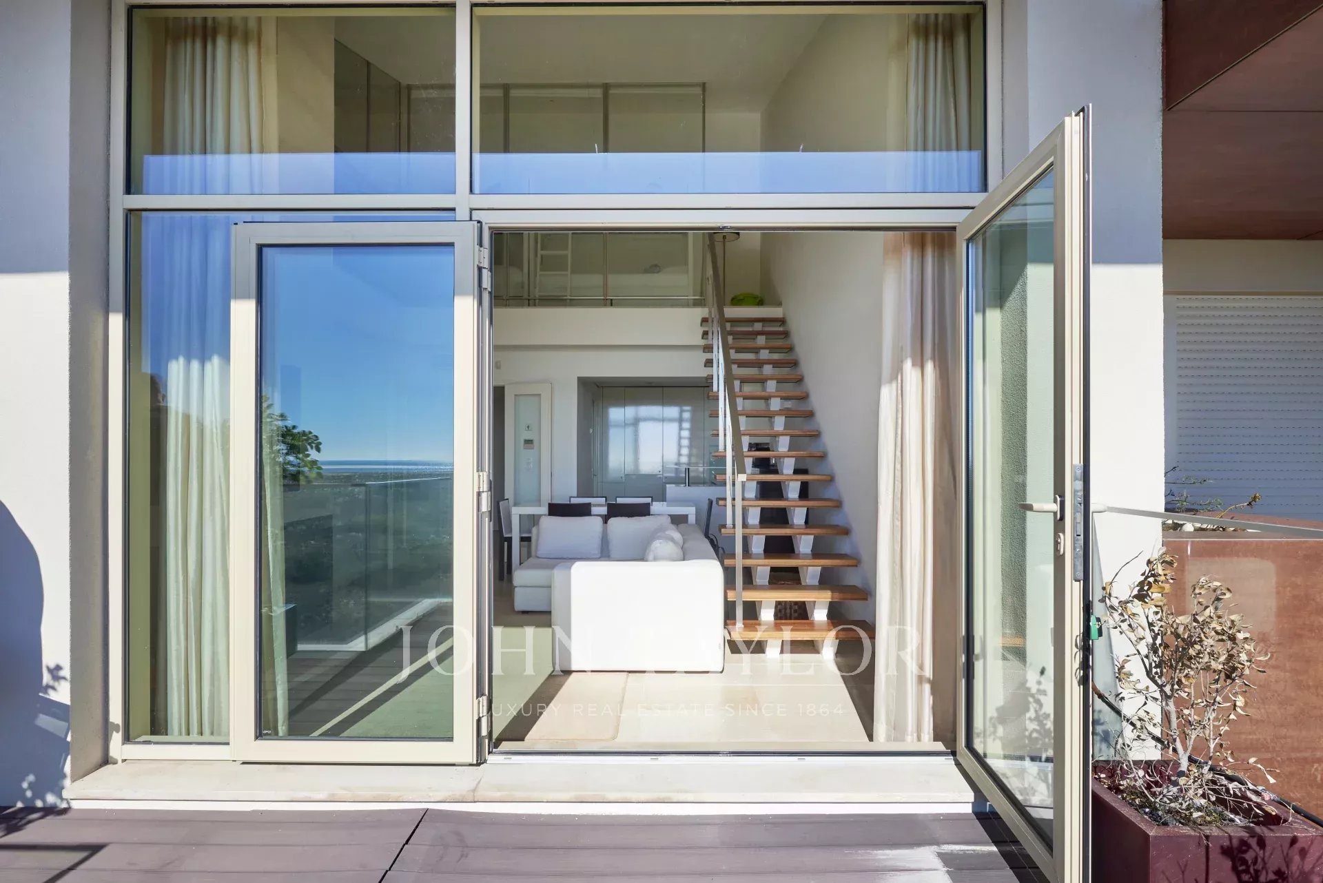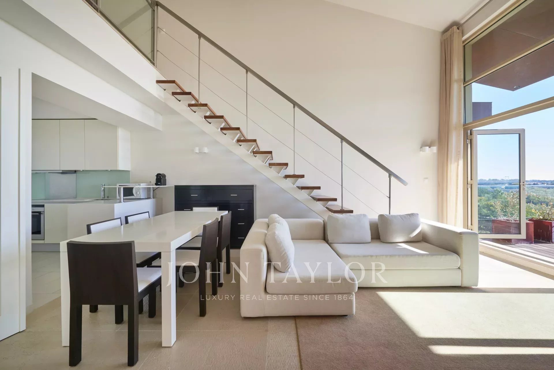 Die obere Etage verfügt über ein Zwischengeschoss mit einem Wohnbereich, ein Badezimmer und eine private Terrasse mit Whirlpool. In der unteren Etage gibt es eine voll ausgestattete Küche, ein Wohnzimmer, eine Suite und ein Gästebad.