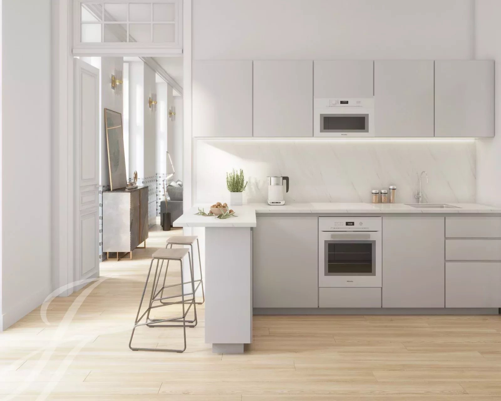 Das Wohnzimmer ist geräumig und lichtdurchflutet und bietet viel Platz für geselliges Beisammensein. Jedes der drei Schlafzimmer verfügt über ein eigenes Bad und einen Kleiderschrank. Ein Büro unterstreicht die Funktionalität und Exklusivität der Wohnung. Zu den bevorzugten Materialien gehören Lioz-Kalkstein, Marmor, Granit und Hartholz.