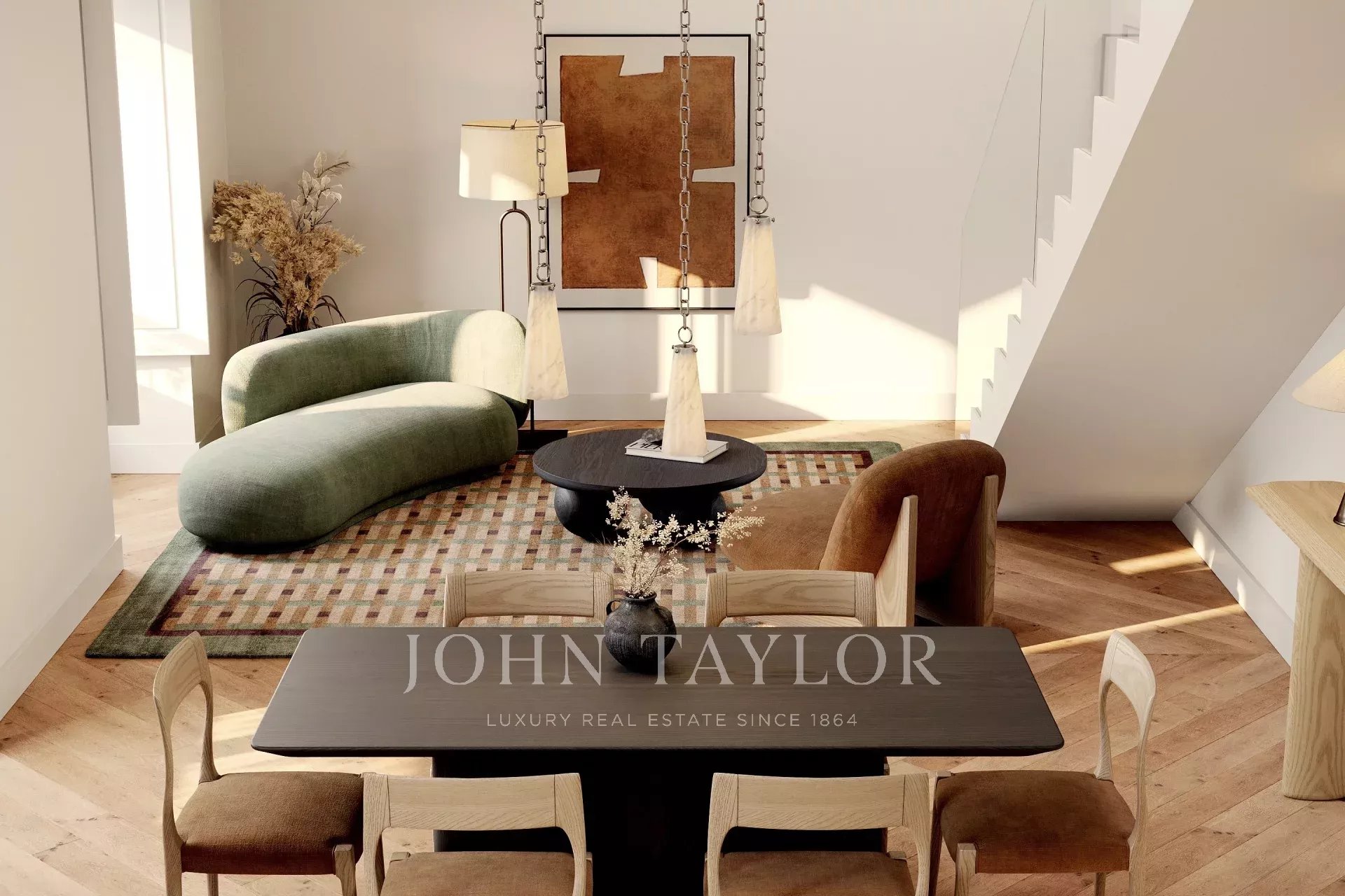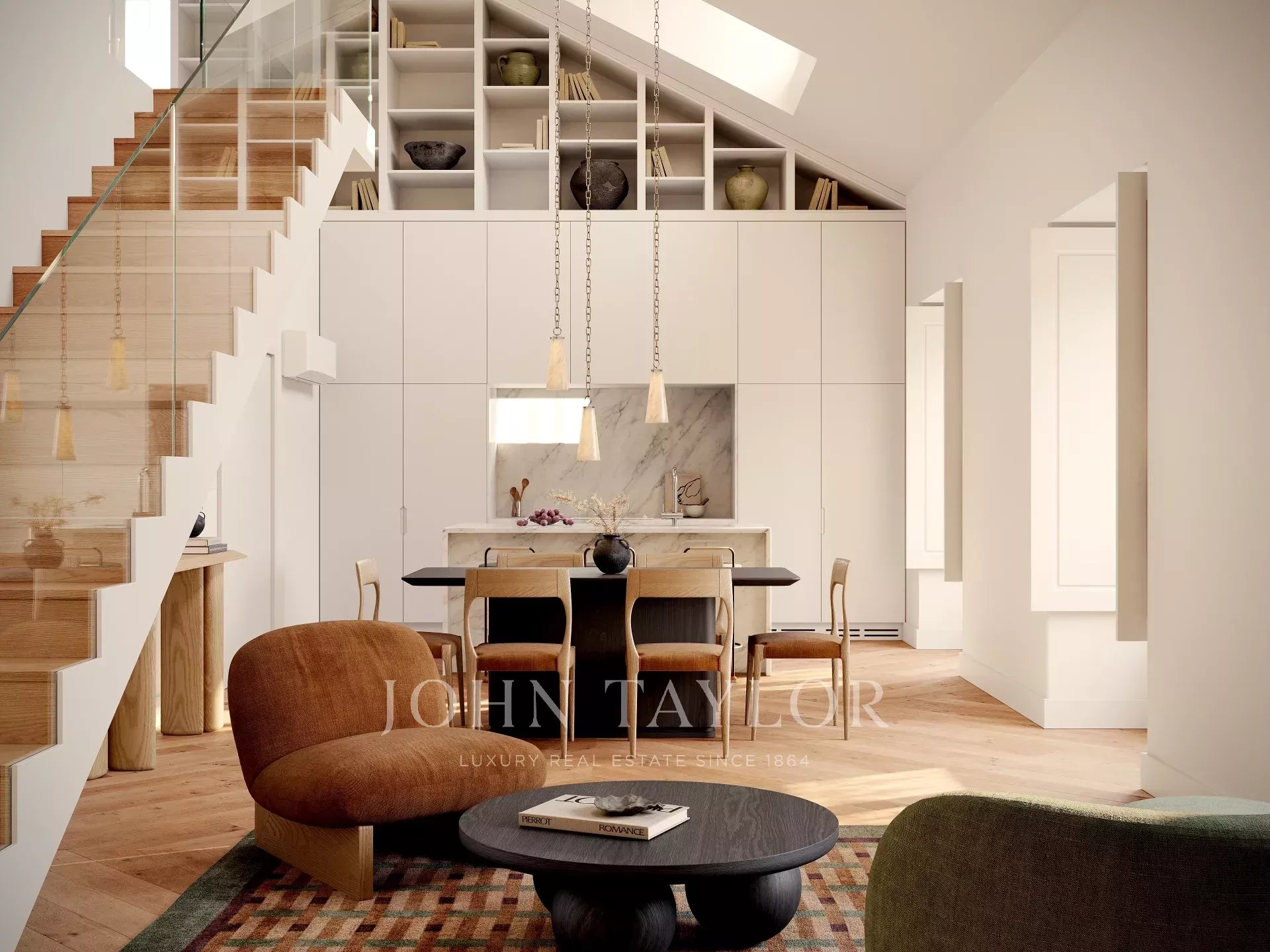 Mit einer Innenfläche von etwa 187 m² verfügt die Wohnung über einen hellen und offenen Wohn- und Essbereich mit hohen Decken und großen traditionellen Fenstern. Die Küche ist voll ausgestattet und nahtlos in den Wohnbereich integriert, was sie sowohl funktional als auch einladend macht. Zwei Schlafzimmer und zwei Bäder befinden sich im Hauptgeschoss, während sich im Obergeschoss ein geräumiges Schlafzimmer mit eigenem Bad befindet, das privater und höher gelegen ist und sich ideal als Master-Suite oder Gästebereich eignet.