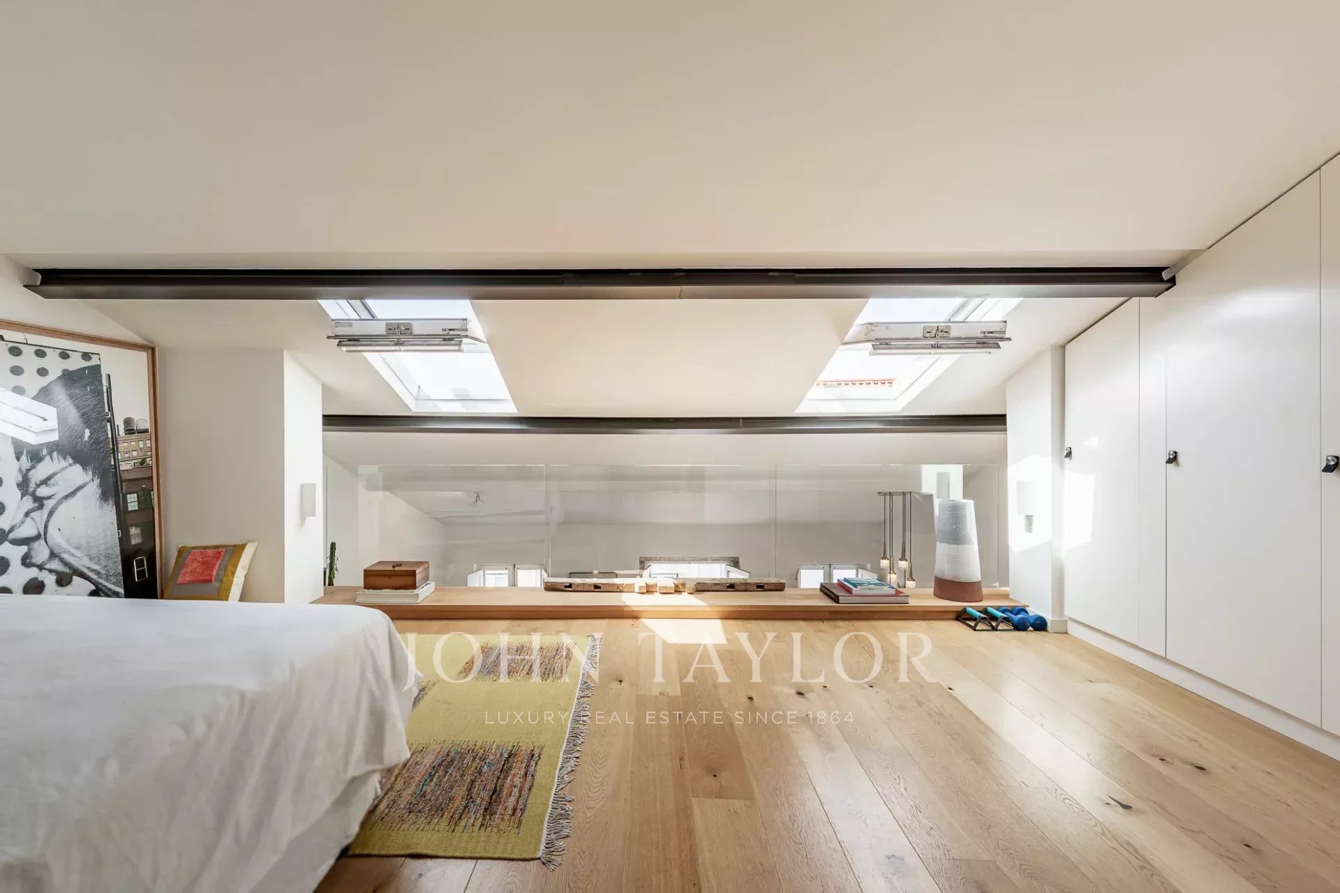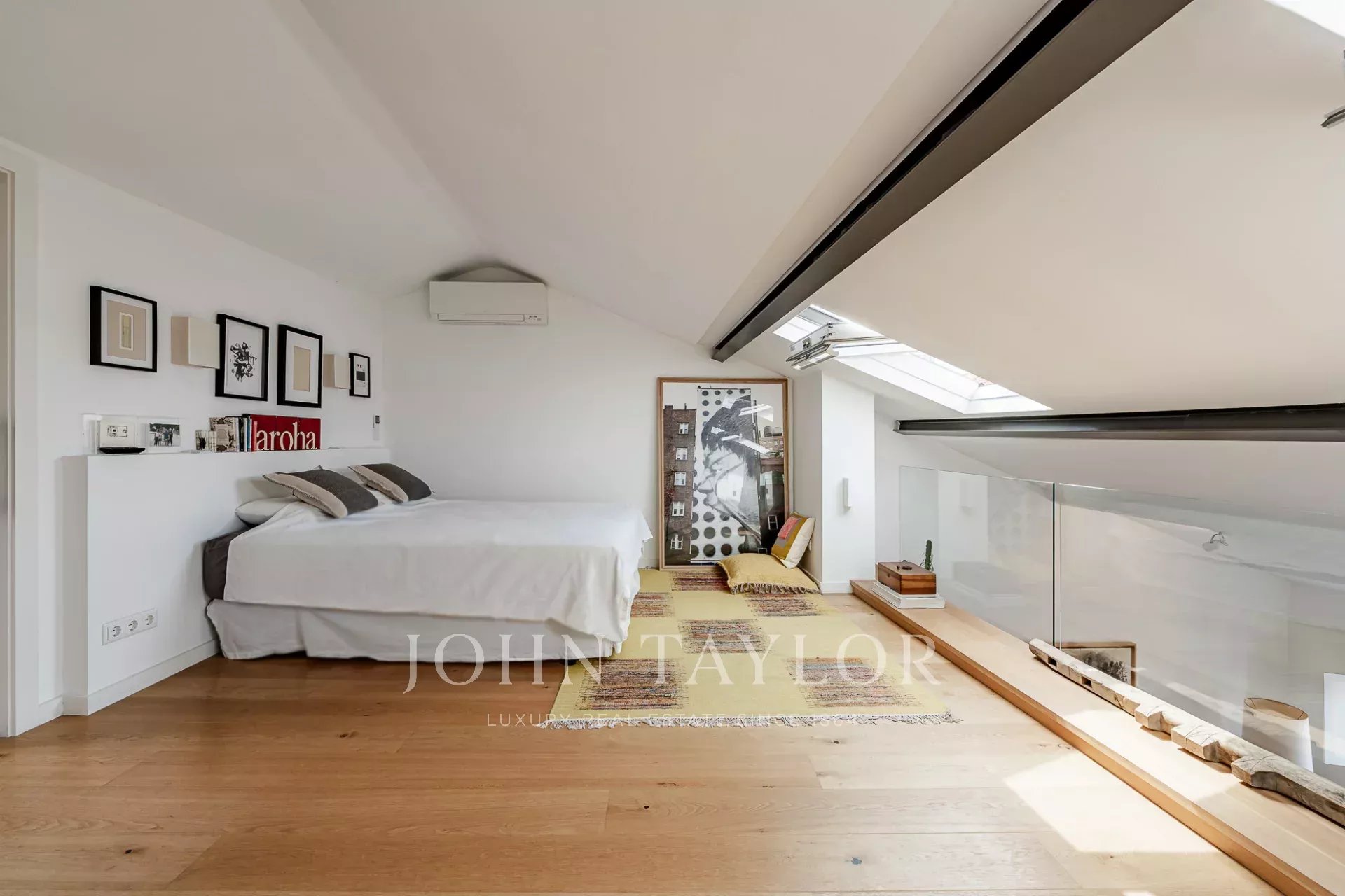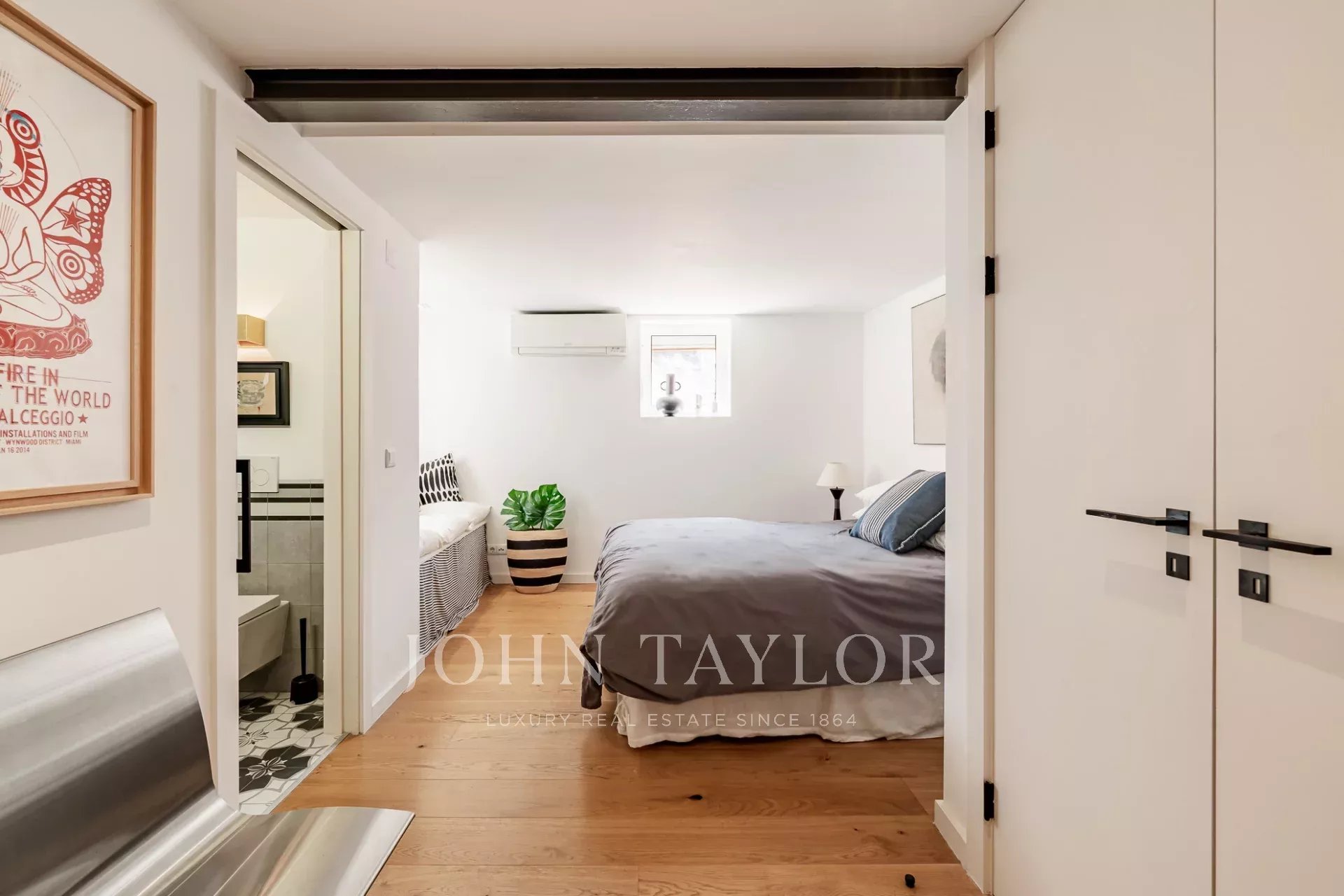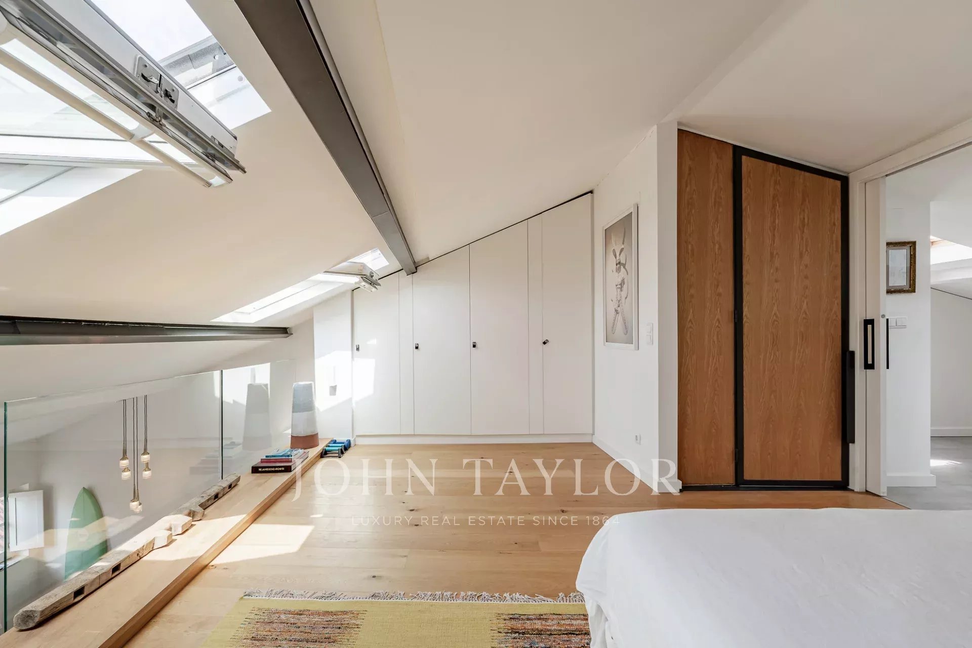 Im Obergeschoss profitiert die großzügige Master-Suite von ihrer Südausrichtung, die den Raum mit natürlichem Licht durchflutet und einen spektakulären Blick auf den Fluss Tejo bietet. Hohe Decken und große Fenster in der gesamten Wohnung schaffen eine helle und luftige Atmosphäre.
