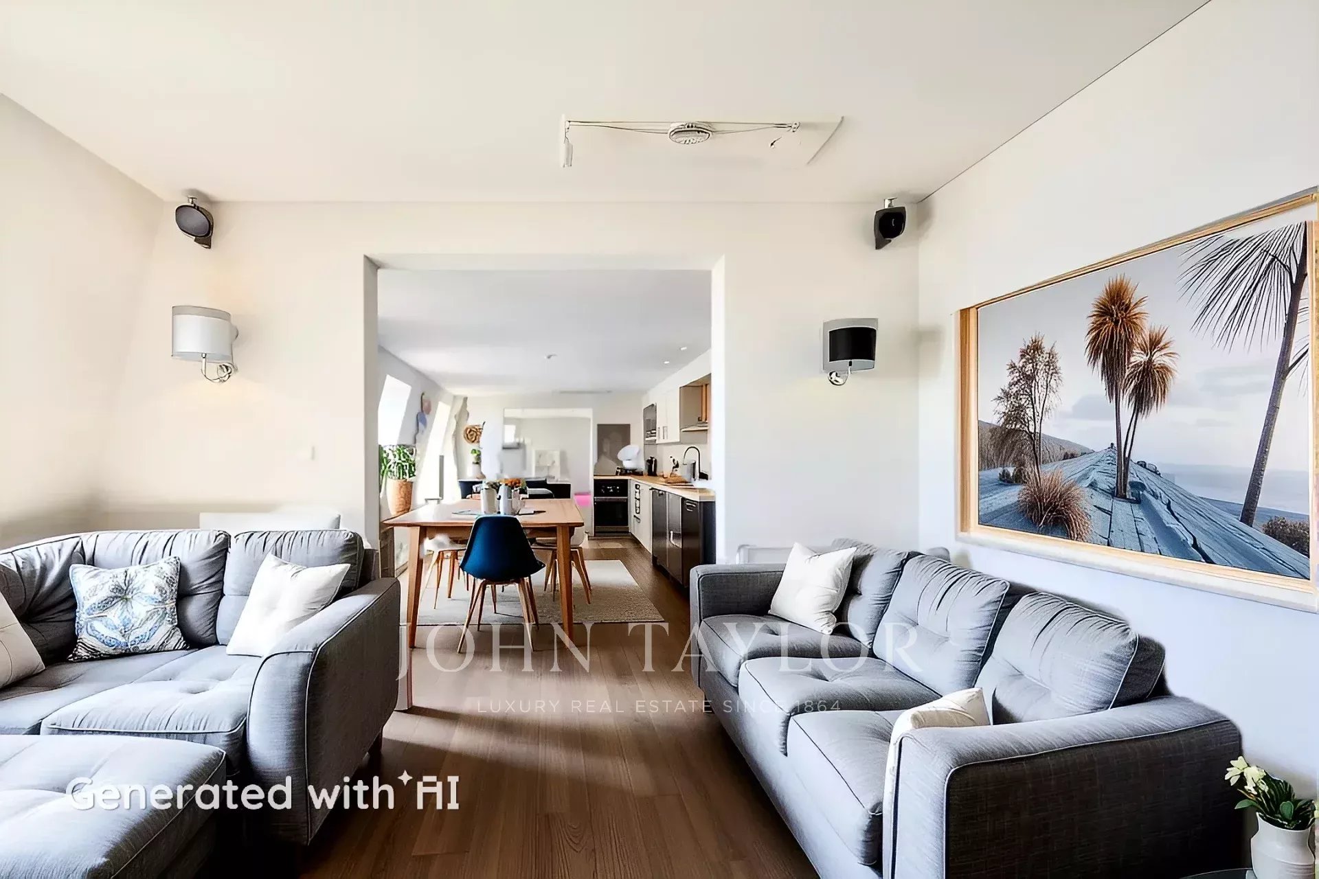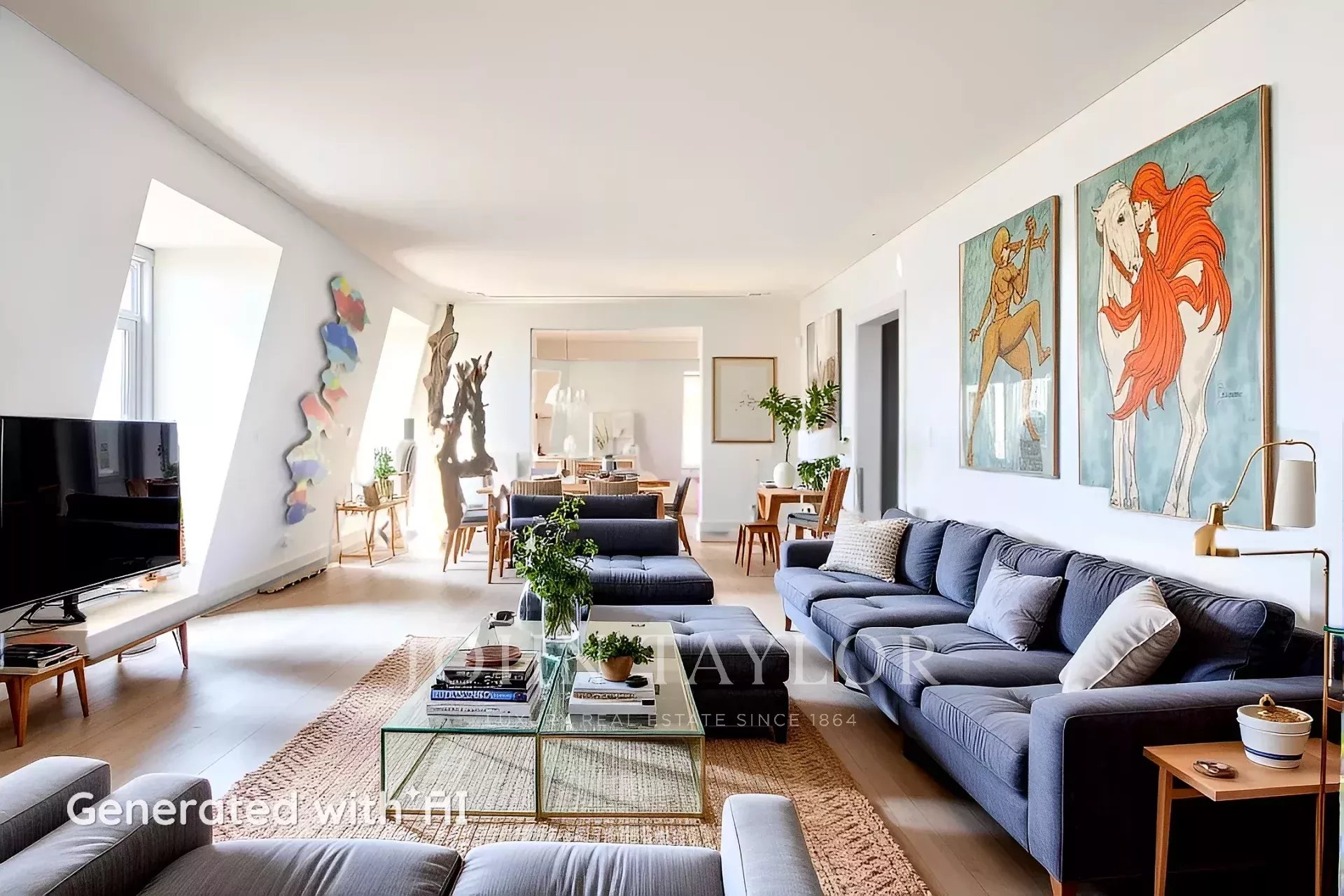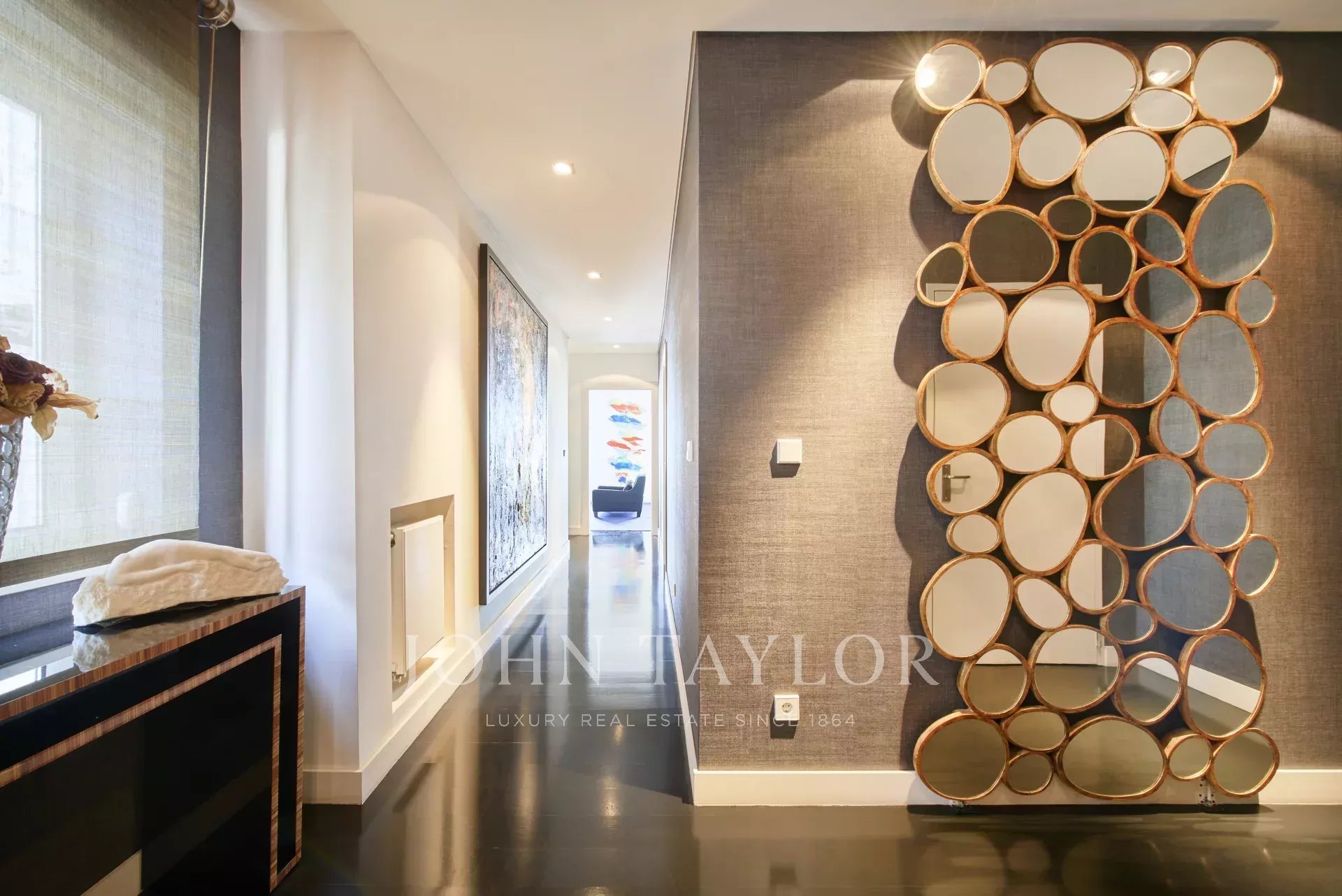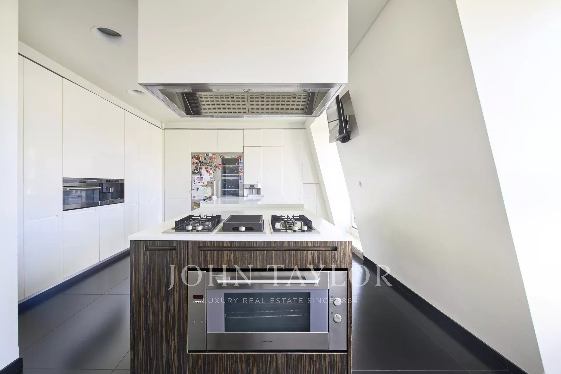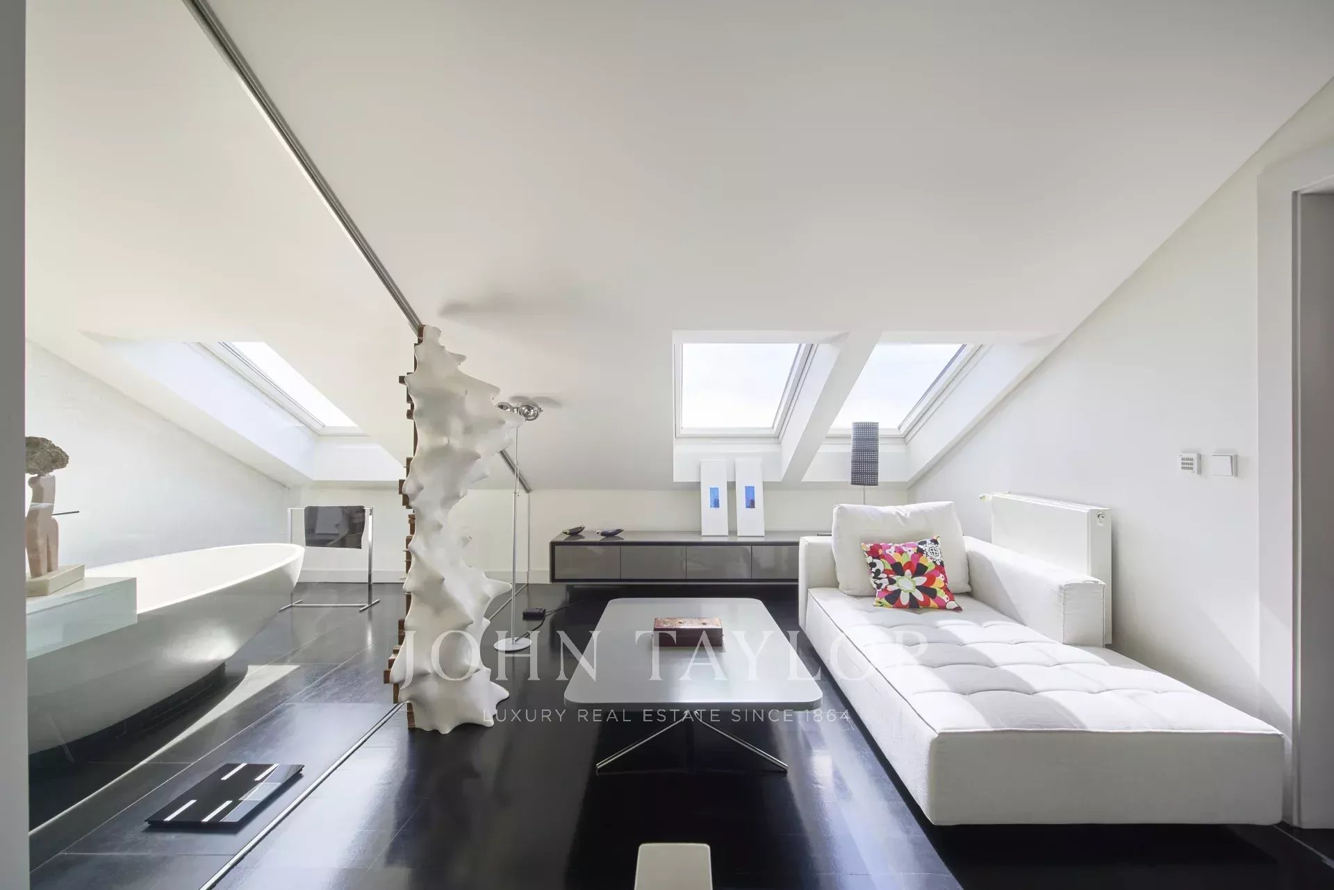 Die Privaträume verfügen über zwei Schlafzimmer mit eigenem Bad, darunter eine prächtige Hauptsuite mit einem gläsernen Badezimmer, einer skulpturalen Badewanne unter einem Oberlicht und einem großen begehbaren Kleiderschrank. Zwei weitere Schlafzimmer bieten Flexibilität, von denen eines in einen privaten Fitnessraum umgewandelt wurde. Die Küche befindet sich derzeit im Bau, was dem zukünftigen Besitzer die einzigartige Möglichkeit bietet, sie nach seinem Geschmack zu gestalten.