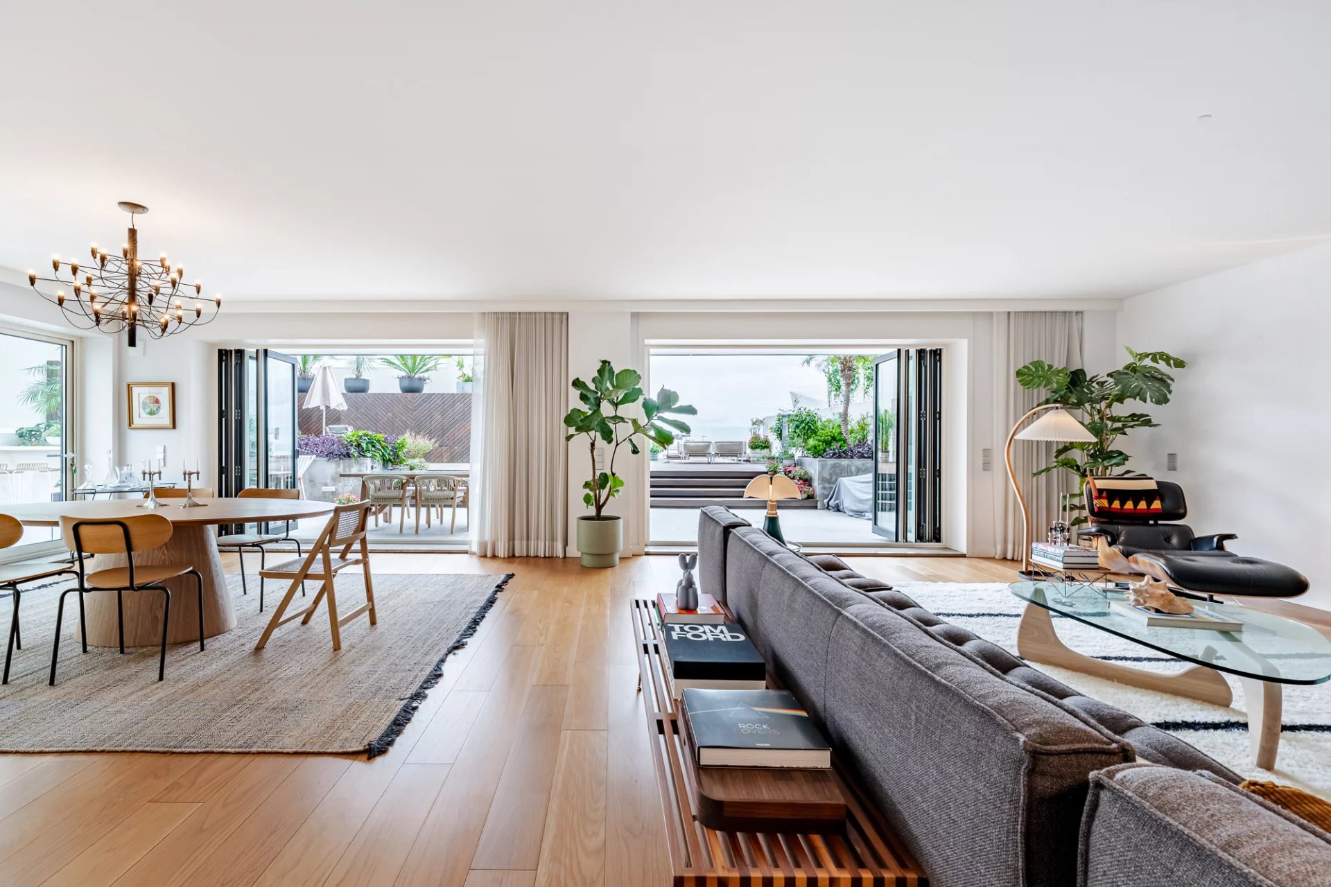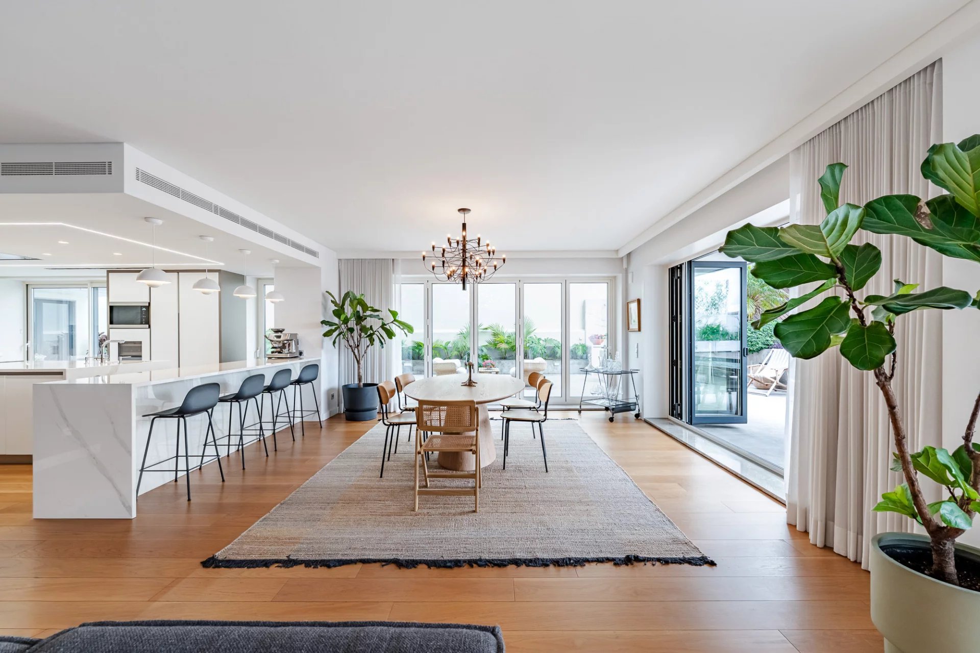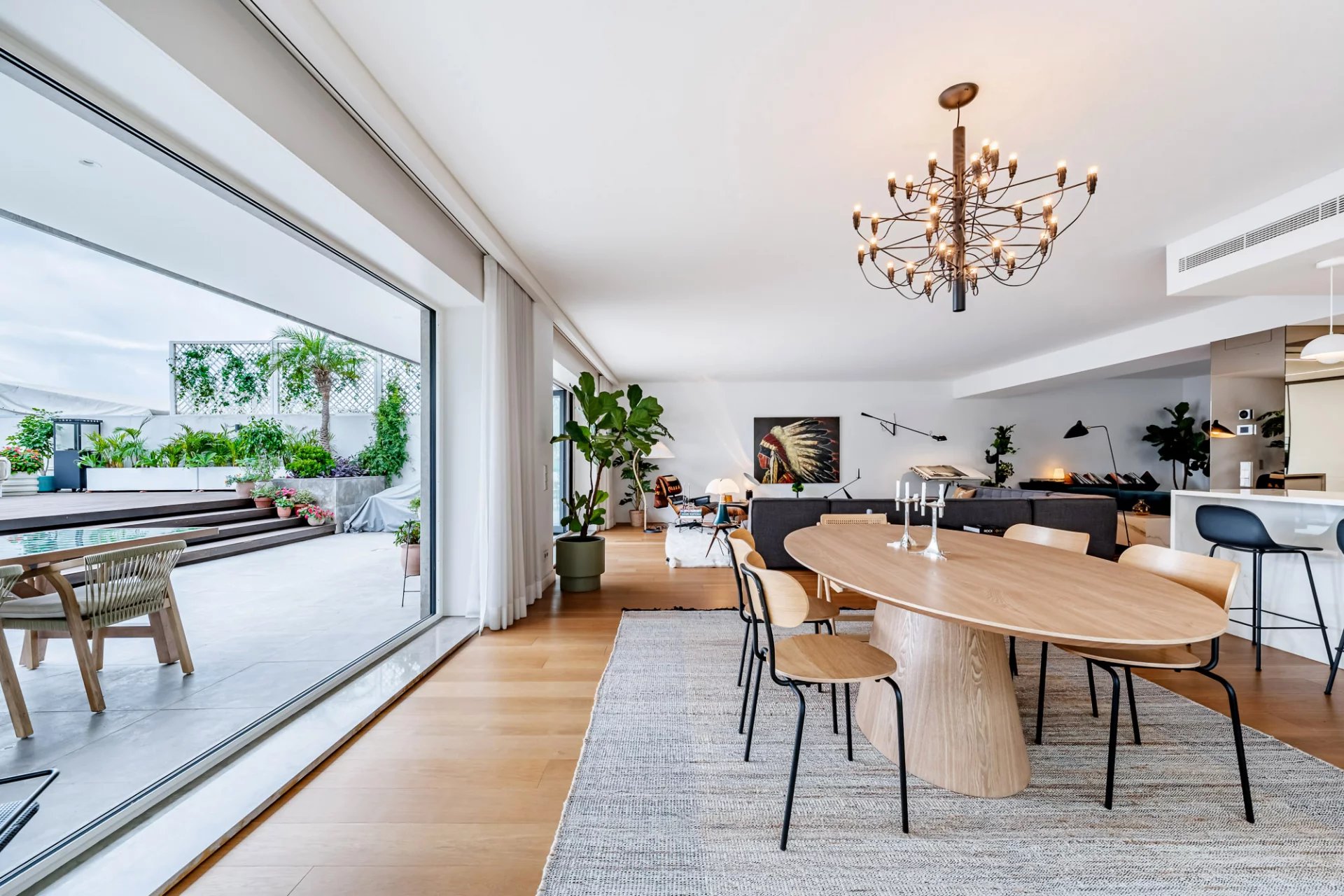 Die Wohnung verfügt über fünf Schlafzimmer mit eigenem Bad, einen großzügigen, offenen Wohn- und Essbereich und eine voll ausgestattete Küche. Eine zweite Küche auf der Terrasse ist ideal, um im Freien zu speisen und Gäste mit Blick auf den Fluss zu unterhalten. Vom Boden bis zur Decke reichende Fenster erfüllen die Innenräume mit natürlichem Licht und bieten eine ständige Sichtverbindung zur Terrasse und der umliegenden Landschaft.