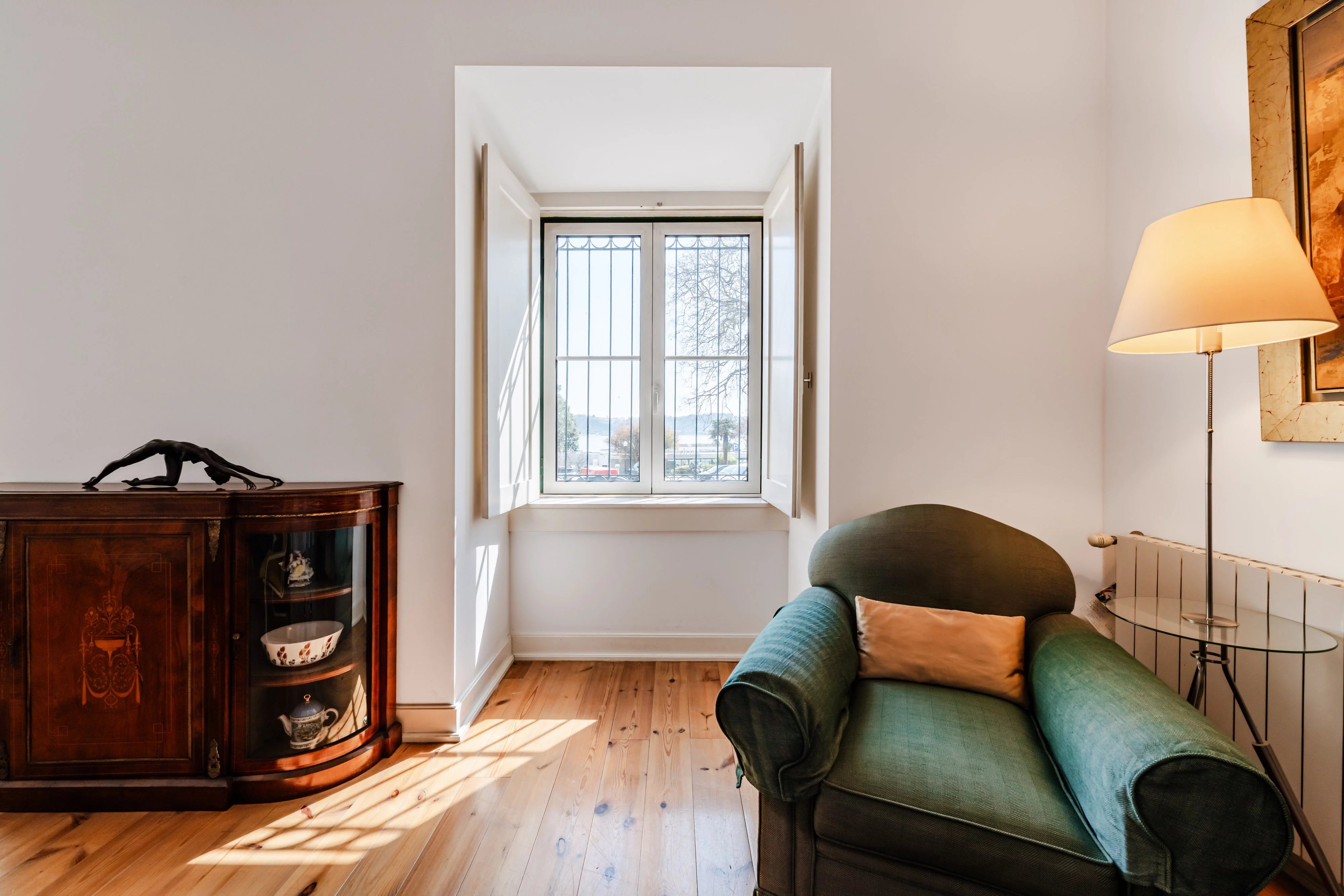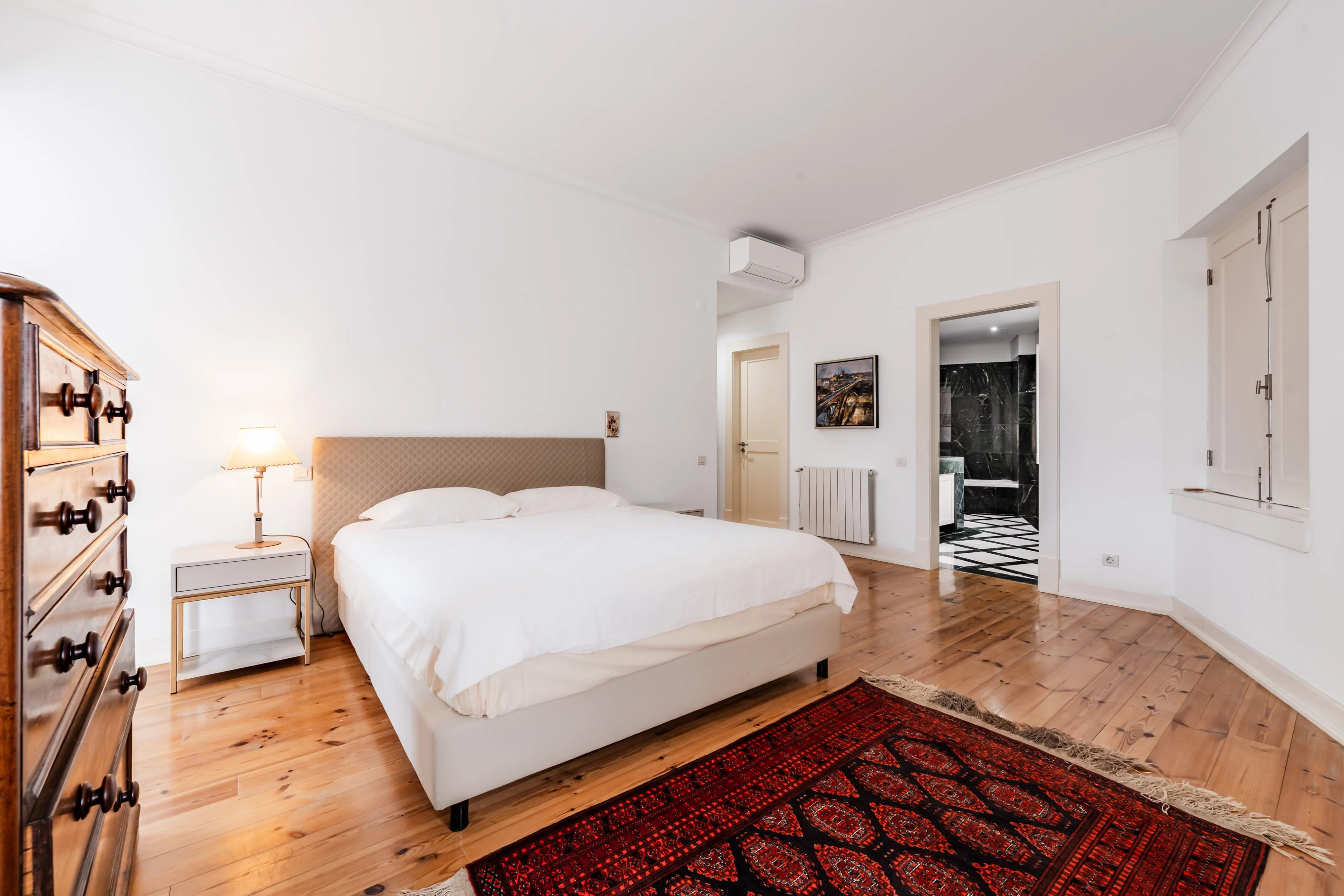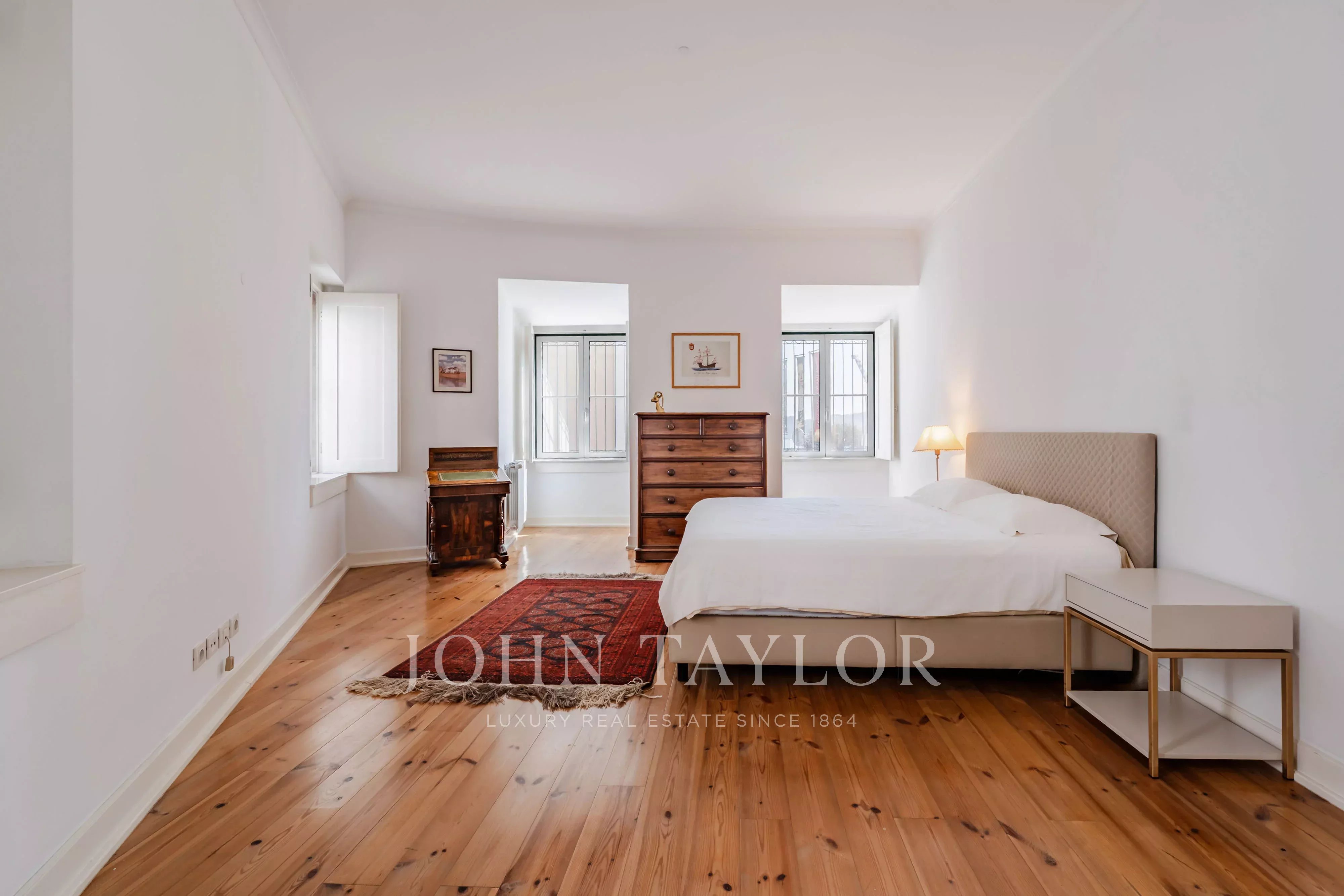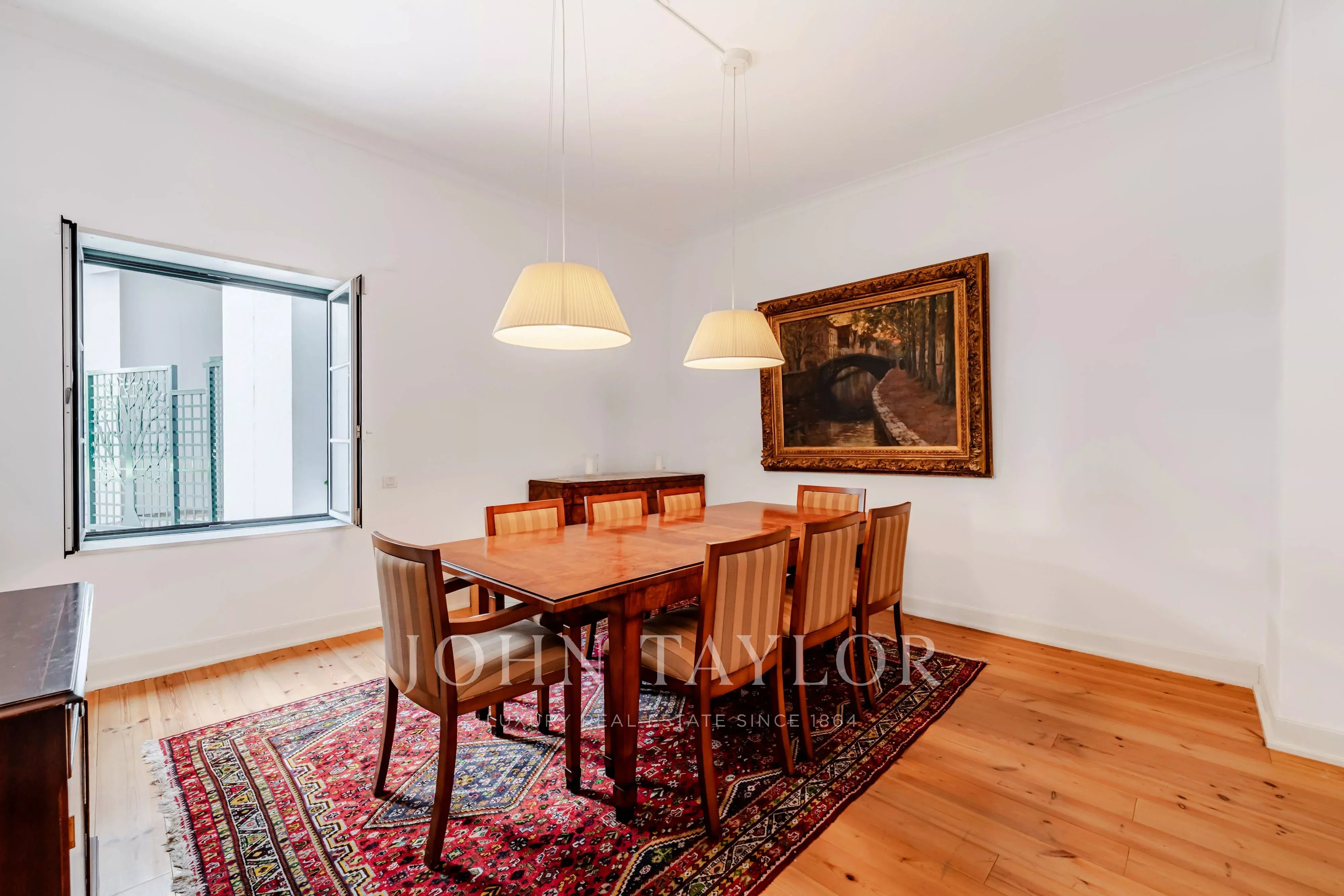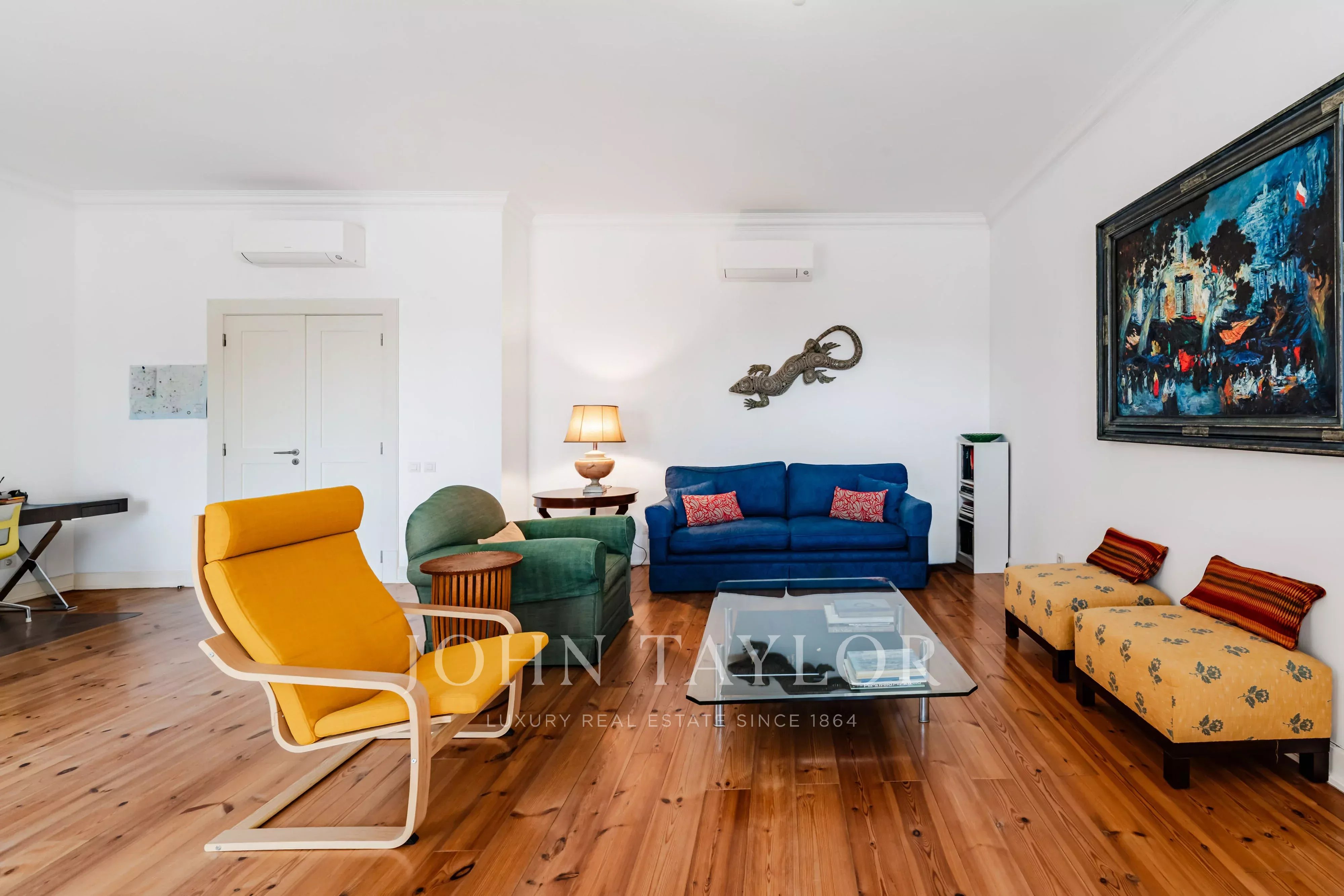 Renoviert von José Baganha & Arquitectos bewahrt die Wohnung ihren ursprünglichen Charakter mit einem sorgfältig modernisierten Interieur. Sie umfasst ein geräumiges Wohnzimmer, ein separates Esszimmer und eine voll ausgestattete Küche mit Speisekammer. Der private Bereich besteht aus zwei Schlafzimmern und einer 30 m² großen Suite mit Ankleideraum und eigenem Bad. Ein zusätzlicher Raum kann als Büro, Gästezimmer oder zusätzliches Schlafzimmer genutzt werden.