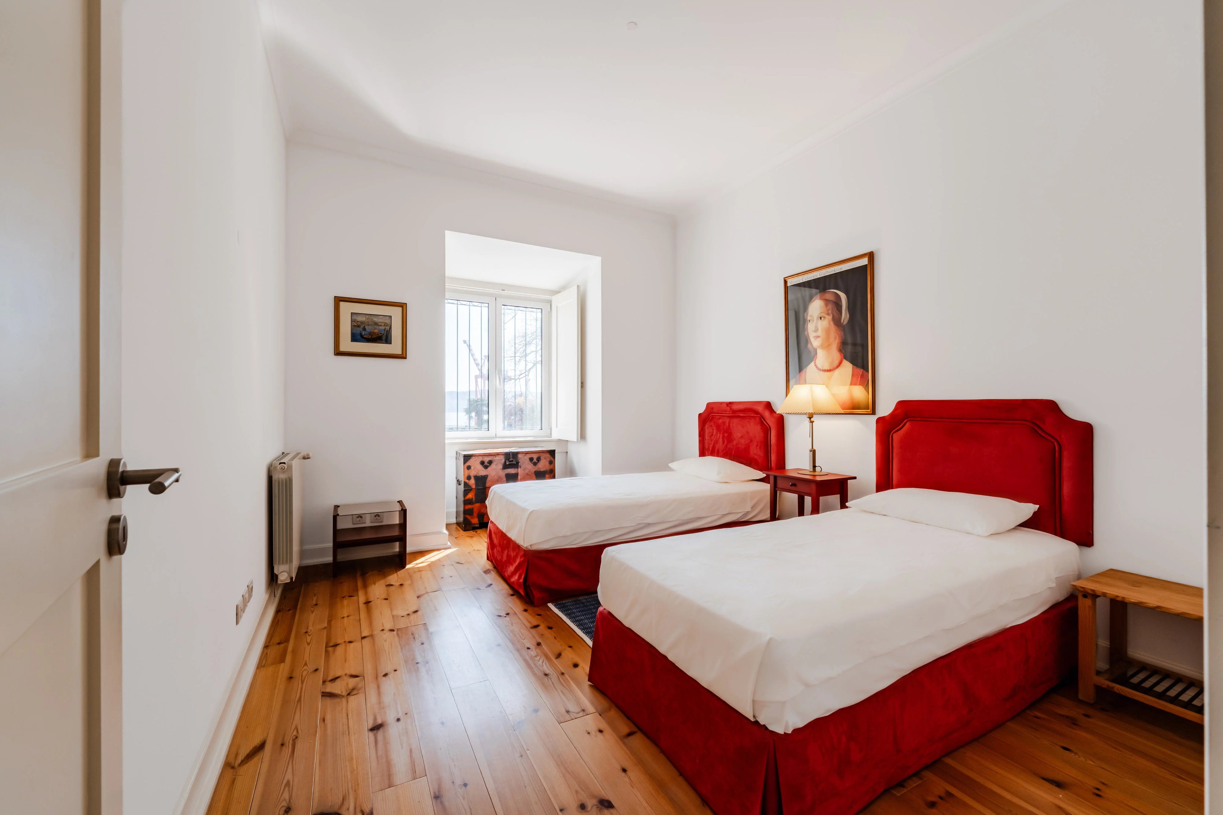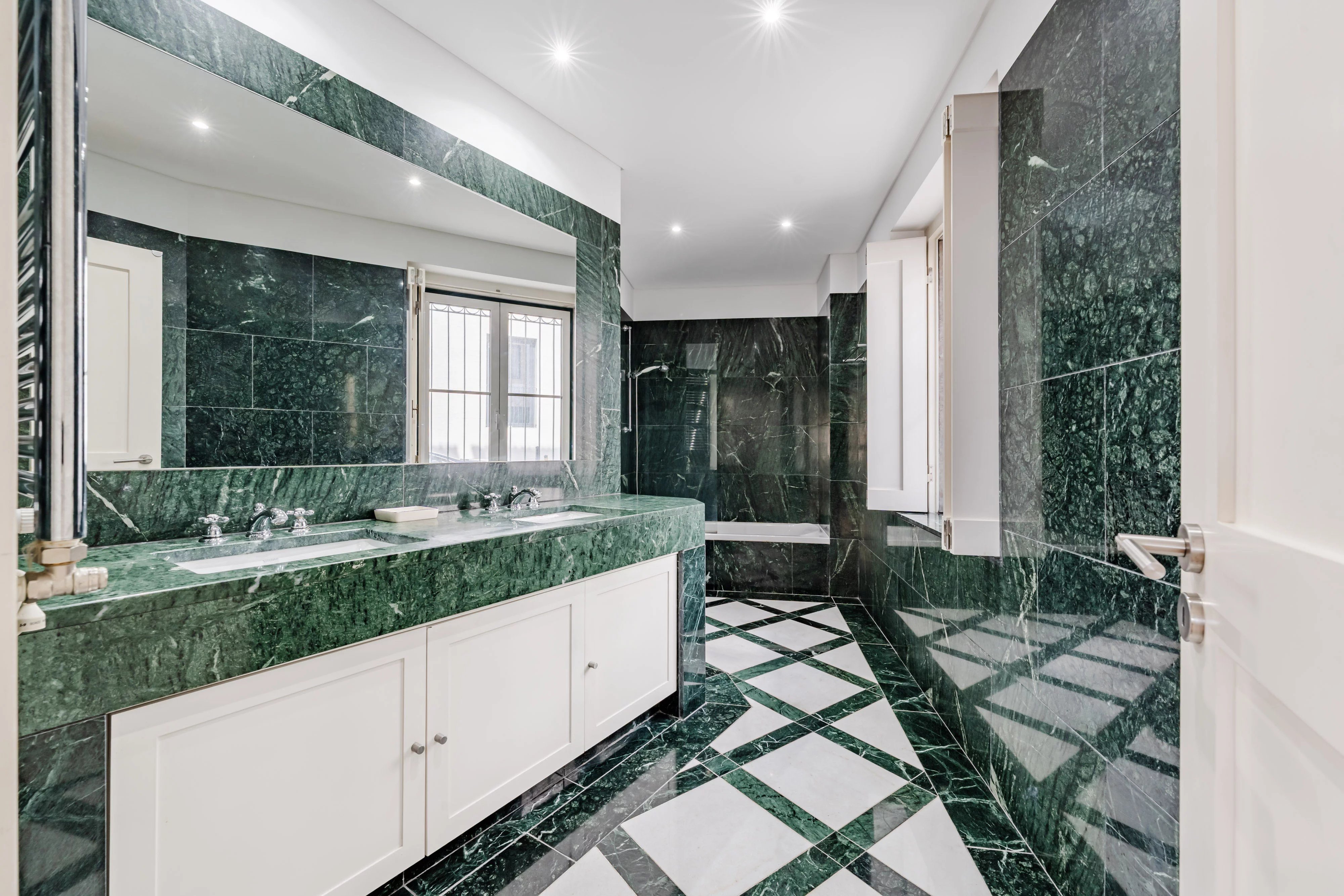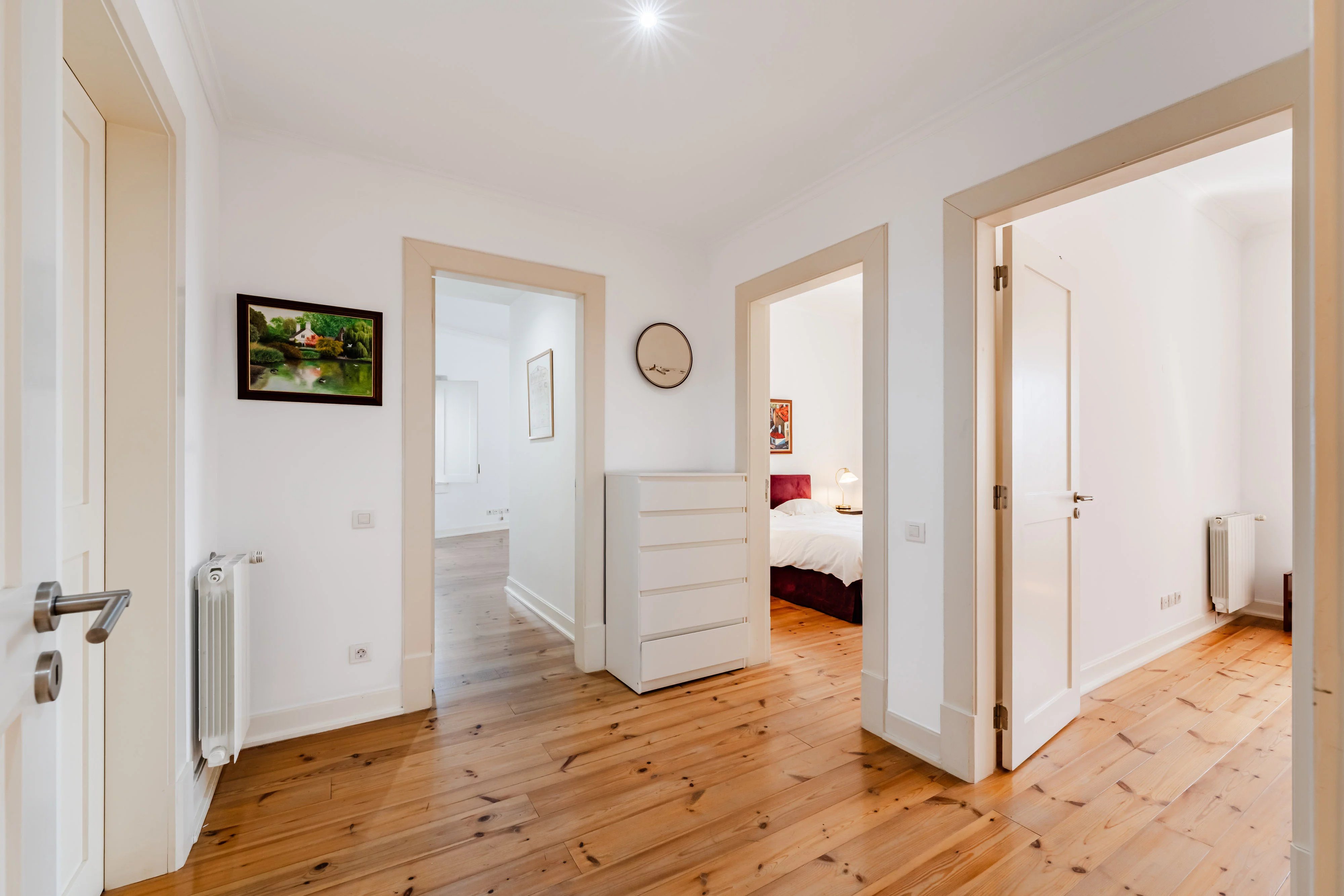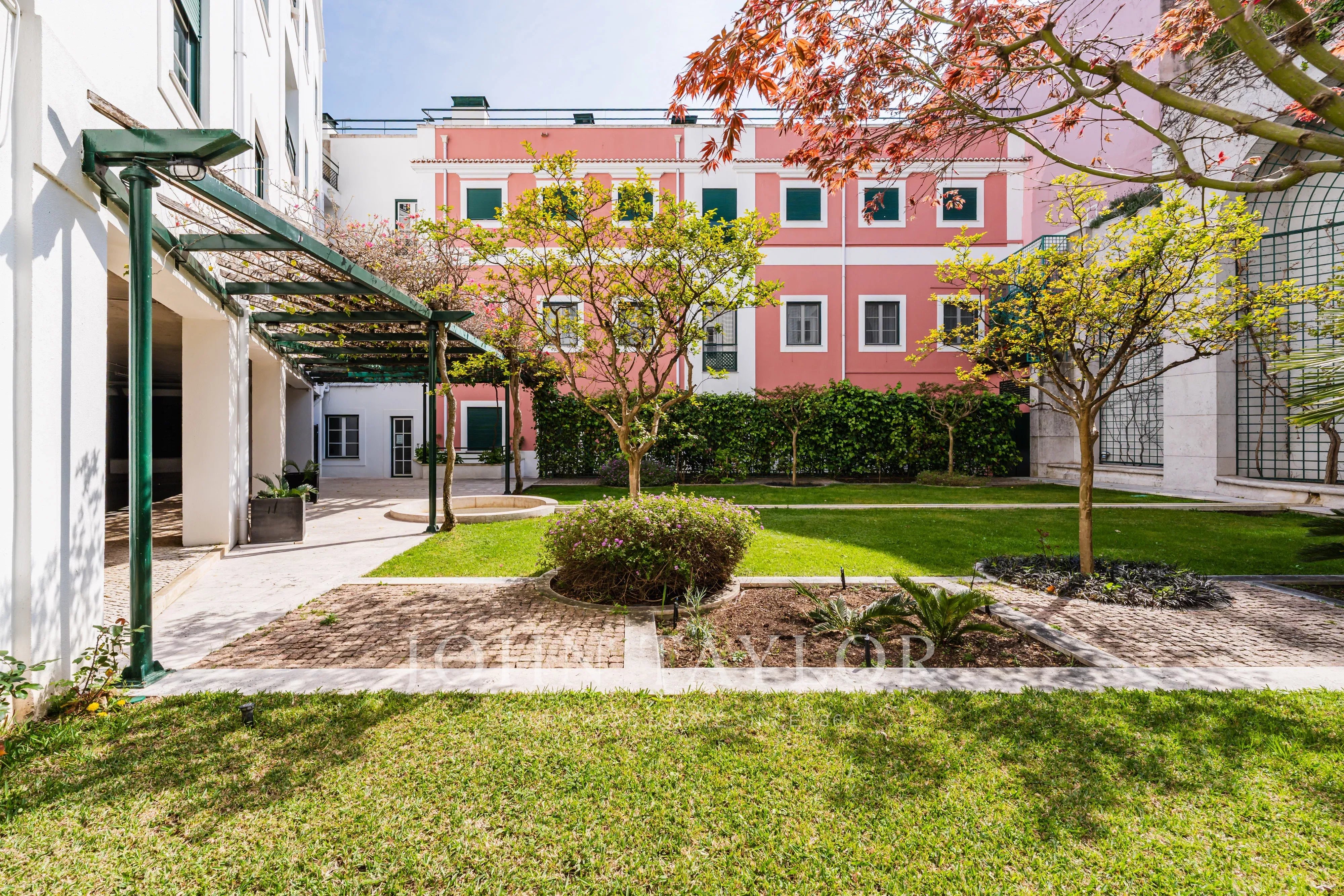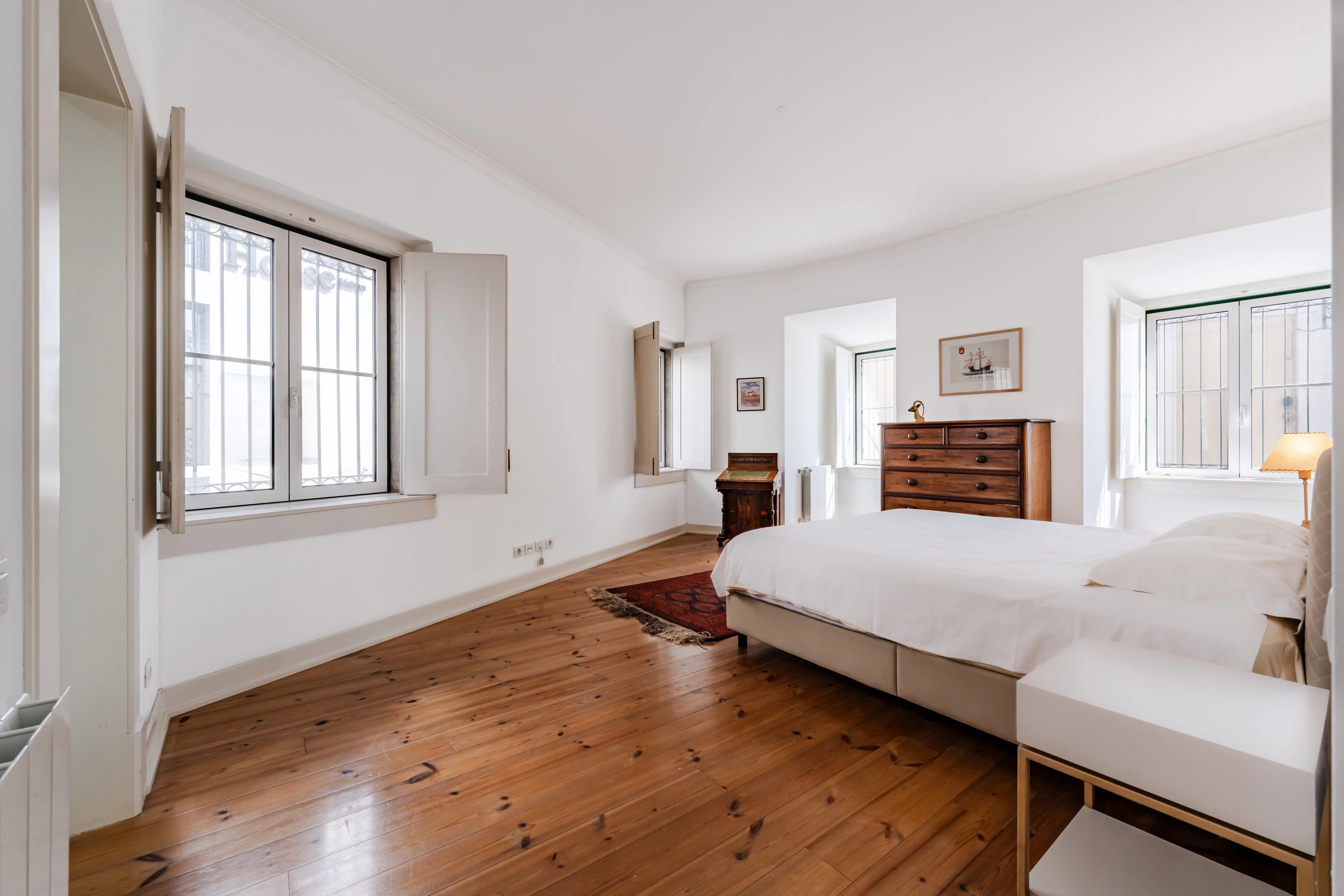 Renoviert von José Baganha & Arquitectos bewahrt die Wohnung ihren ursprünglichen Charakter mit einem sorgfältig modernisierten Interieur. Sie umfasst ein geräumiges Wohnzimmer, ein separates Esszimmer und eine voll ausgestattete Küche mit Speisekammer. Der private Bereich besteht aus zwei Schlafzimmern und einer 30 m² großen Suite mit Ankleideraum und eigenem Bad. Ein zusätzlicher Raum kann als Büro, Gästezimmer oder zusätzliches Schlafzimmer genutzt werden.