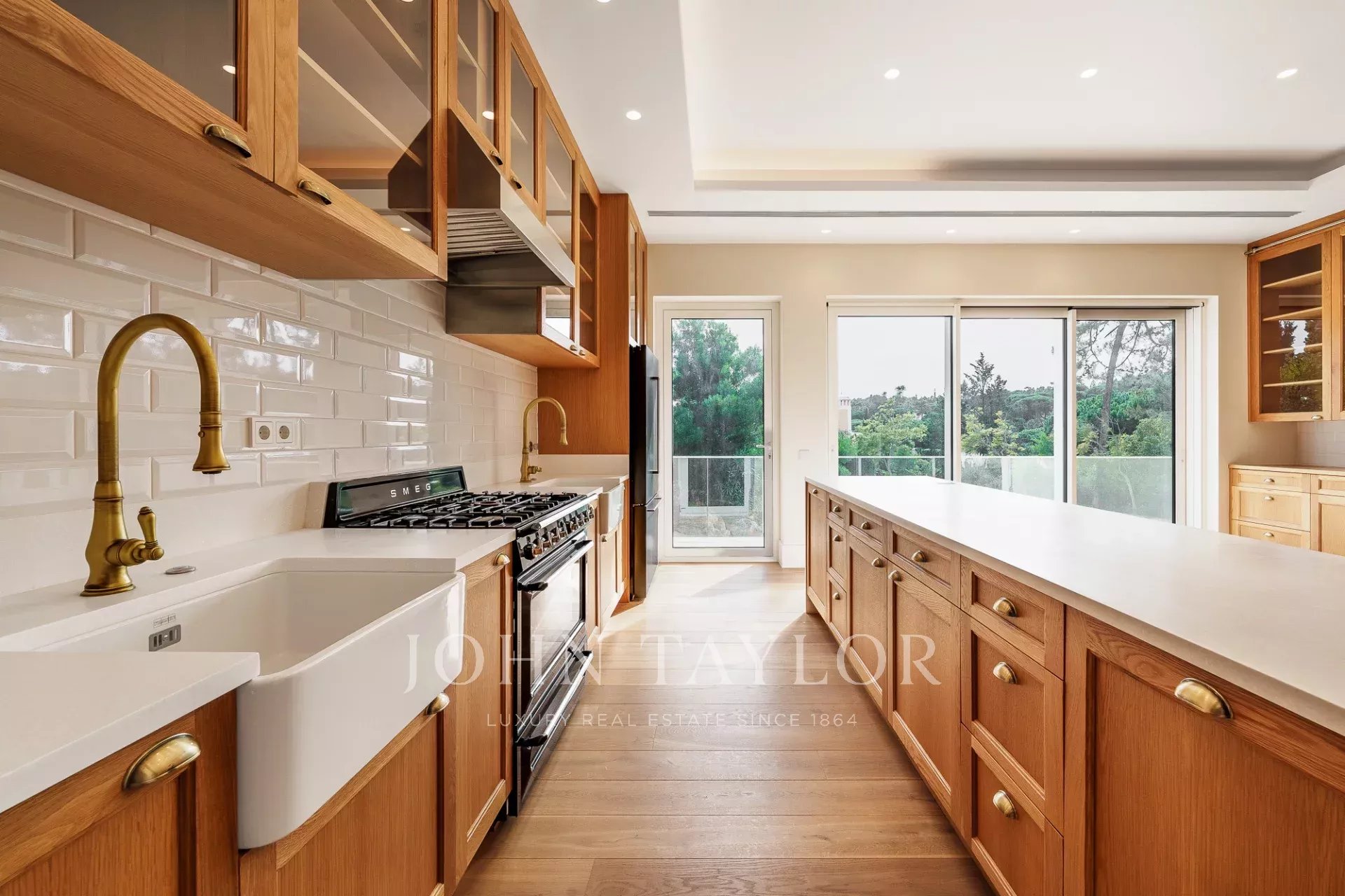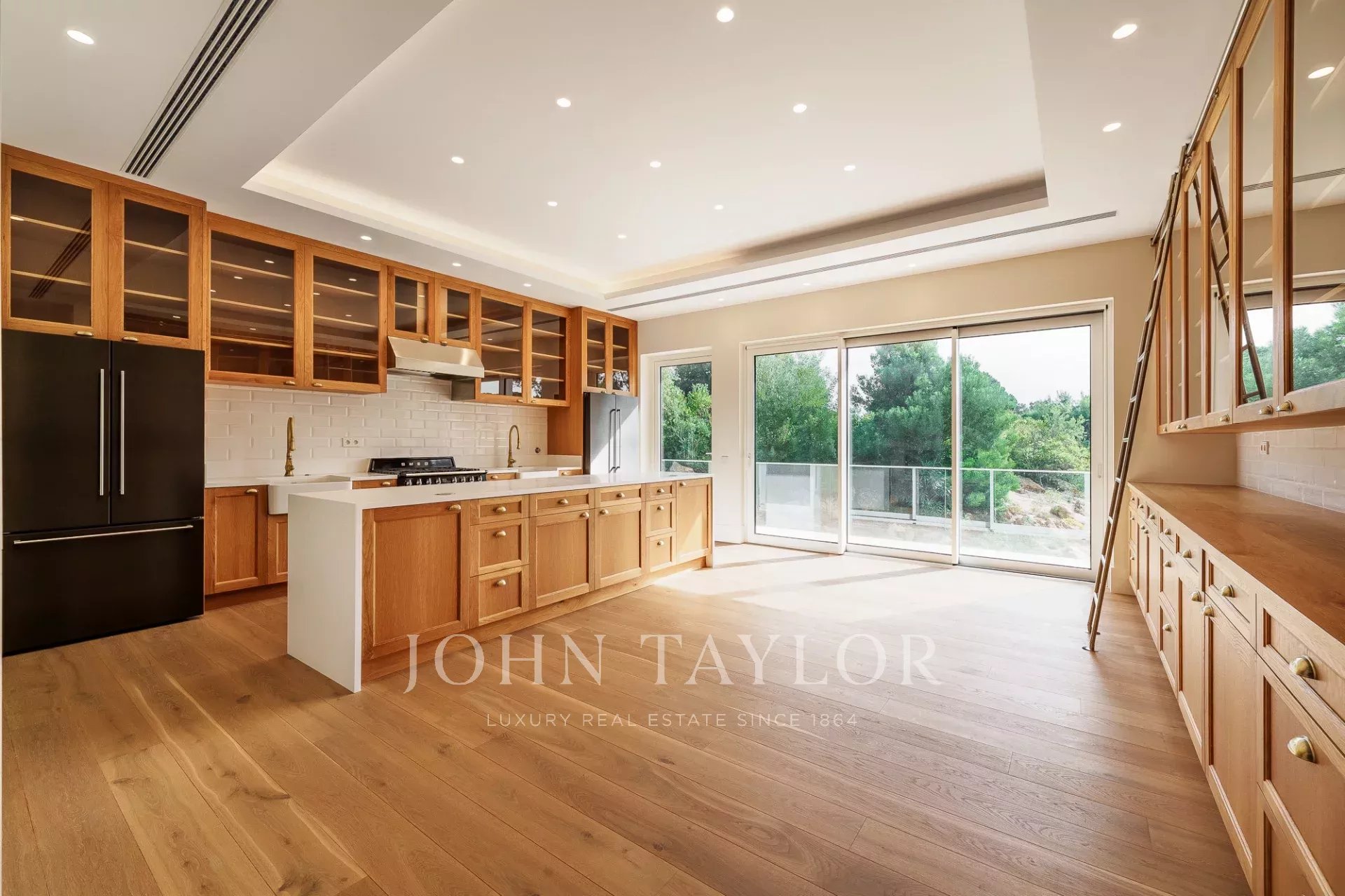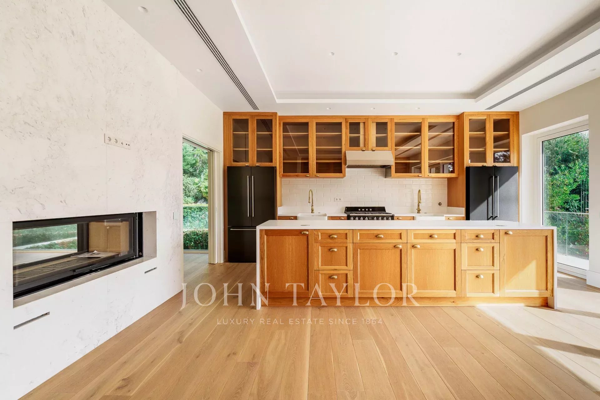 Das Haus ist über zwei Etagen verteilt. Auf der Hauptebene öffnet sich das geräumige Wohnzimmer durch raumhohe Fenster zum Garten und zum Pool, wodurch eine starke Verbindung zum Freien entsteht und das Innere mit natürlichem Licht durchflutet wird. Die elegante und mit hochwertigen Geräten ausgestattete Küche ist so konzipiert, dass sie sowohl für das Familienleben als auch für Gäste geeignet ist.