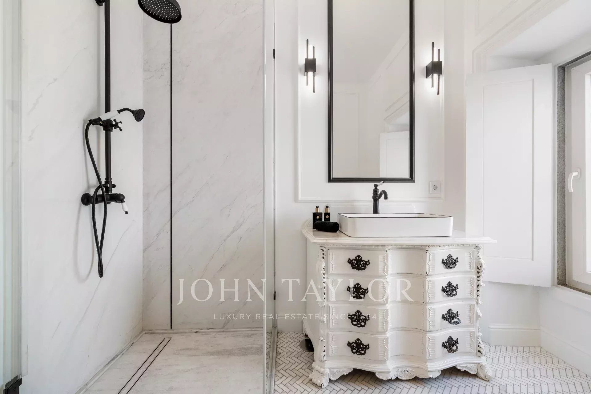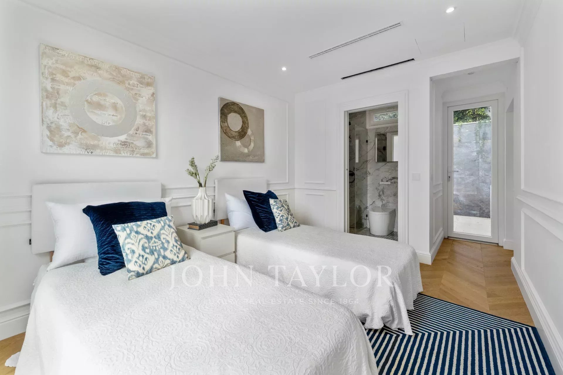 Zwei beeindruckende Schlafzimmer mit eigenem Bad, hohen Decken, stilvollen Bädern und raffinierten Details.