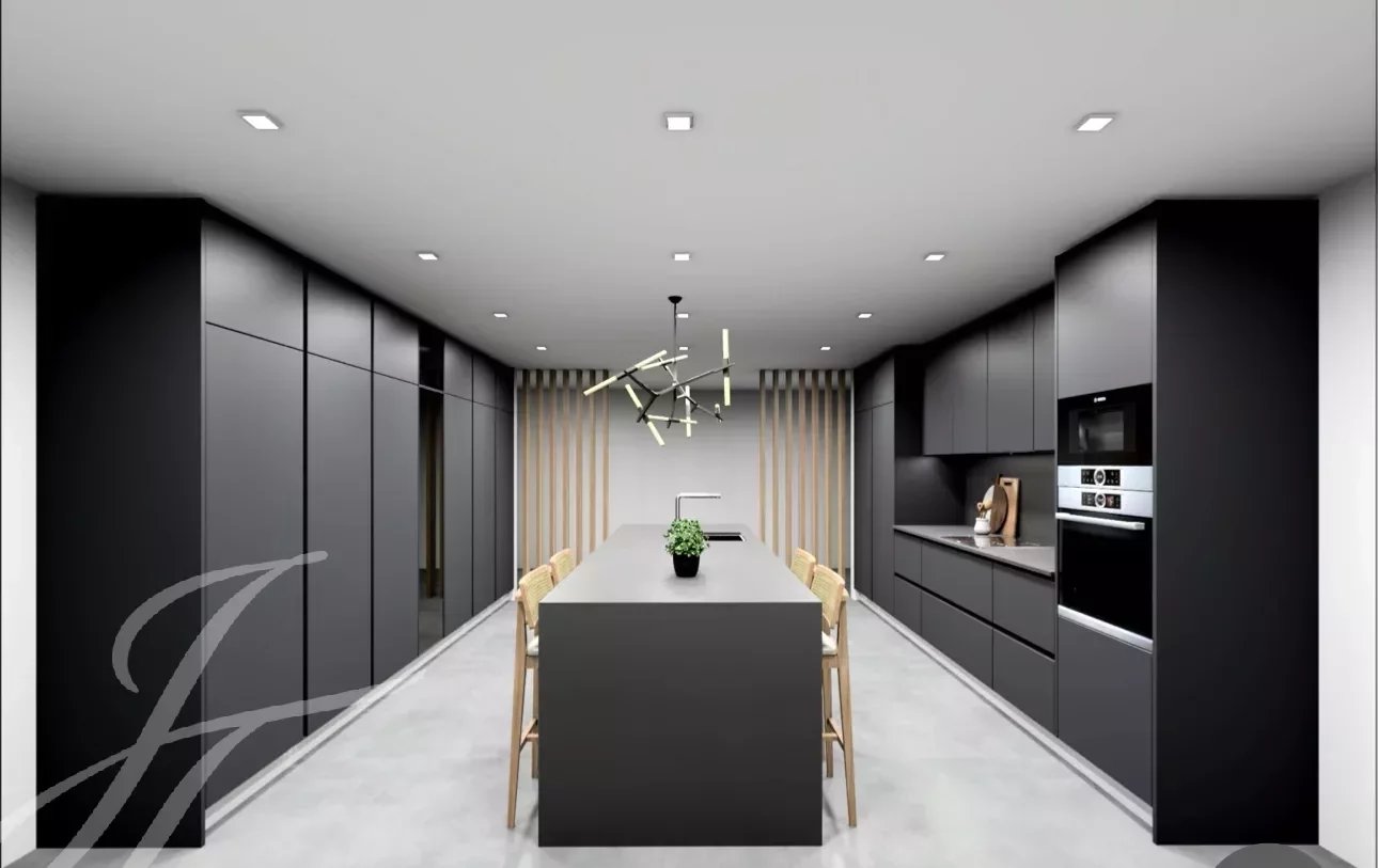 Im Erdgeschoss befindet sich das Wohnzimmer, eine voll ausgestattete offene Küche mit direktem Zugang zum Garten und zum Pool. Auf der gleichen Ebene befinden sich ein Büro, das Sozial-WC sowie 3 Schlafzimmer mit Einbauschränken en suite.